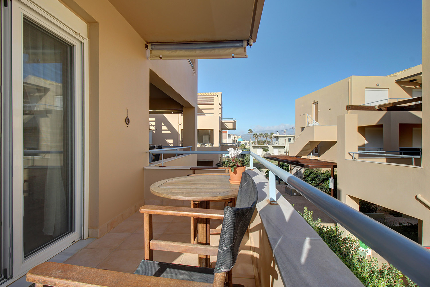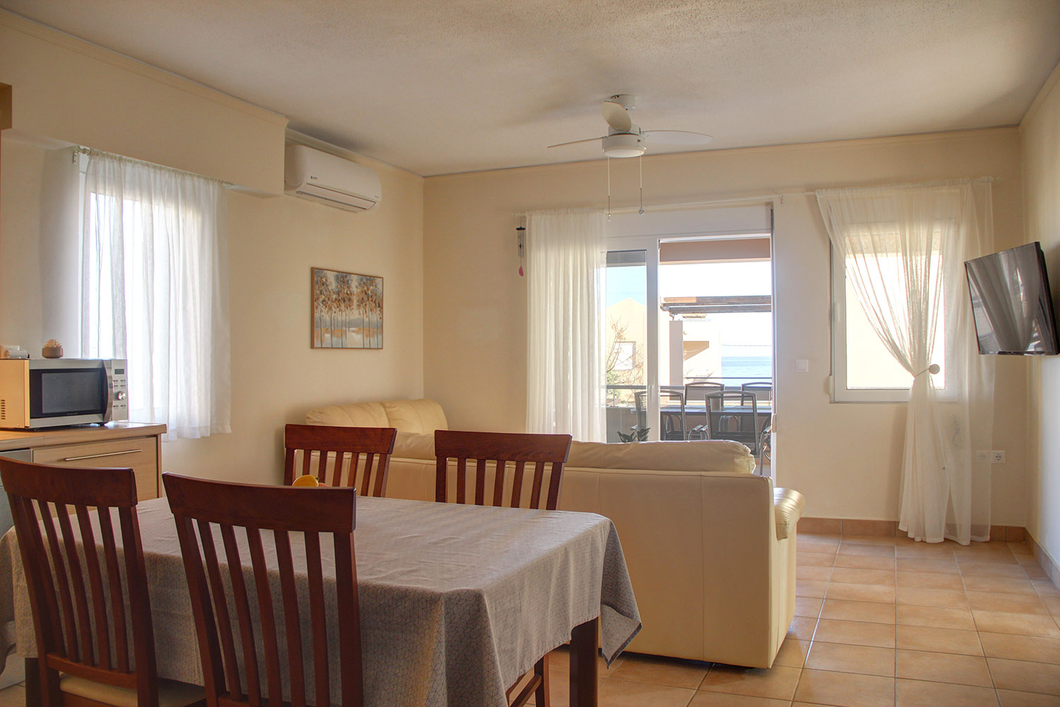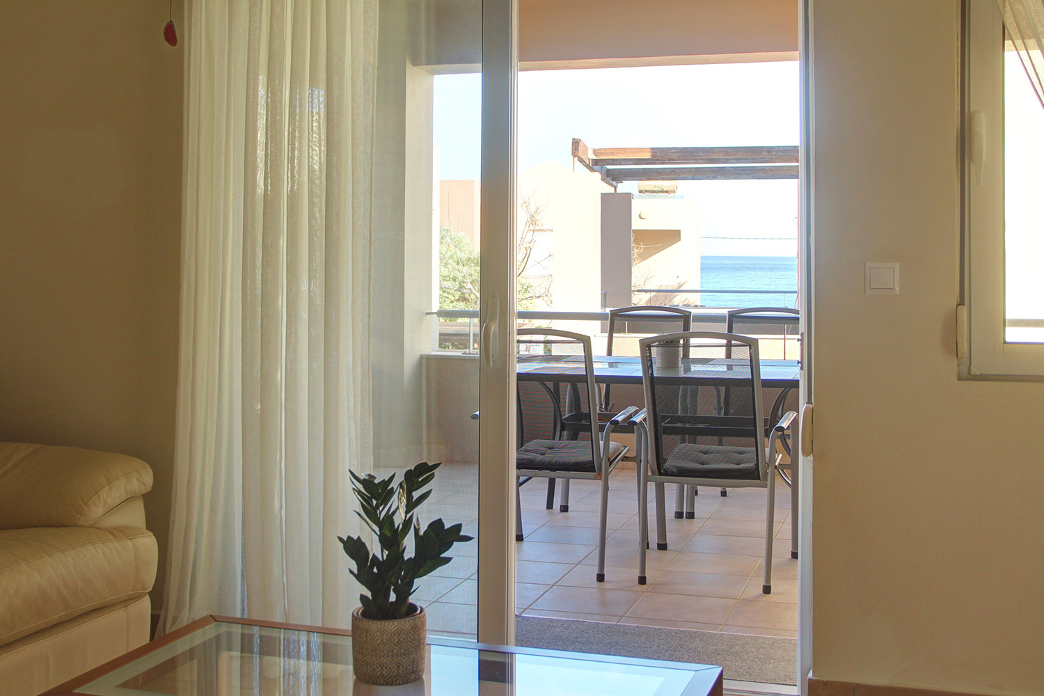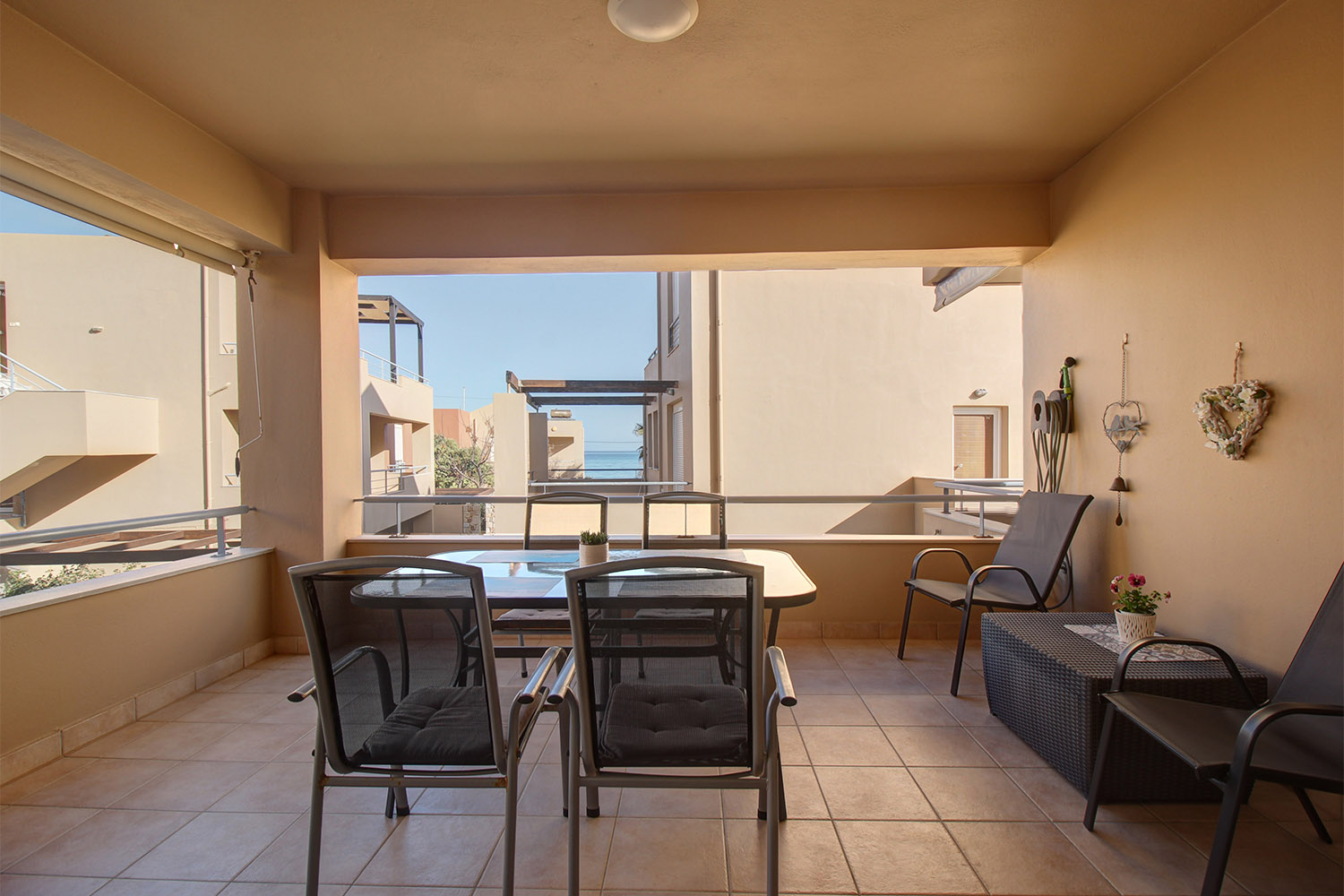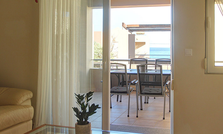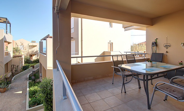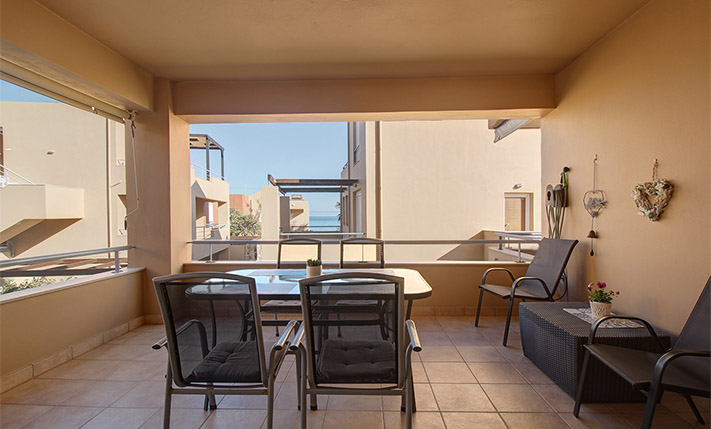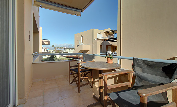 Upon entering, you are welcomed into an open-plan living room and kitchen area that feels bright and inviting. The kitchen offers ample cabinet space and stainless steel appliances, making it practical for everyday use. Large balcony doors from the living area open onto a covered veranda, already furnished with outdoor seating and a dining area. It provides an inviting setting for relaxing or enjoying meals outdoors, with additional space available should you wish to put a barbecue. The two bedrooms are positioned on the eastern side of the building. One enjoys views towards the Lefka Ori (White Mountains), while the second has access to its own private balcony. The bathroom, renovated in 2021, is modern and fitted with a shower.