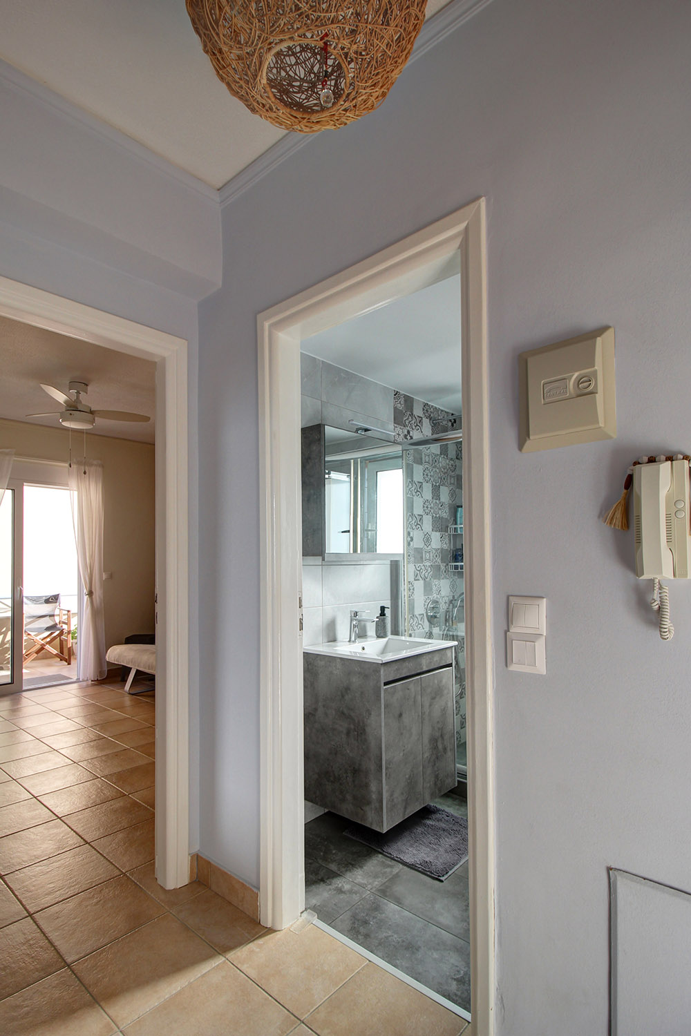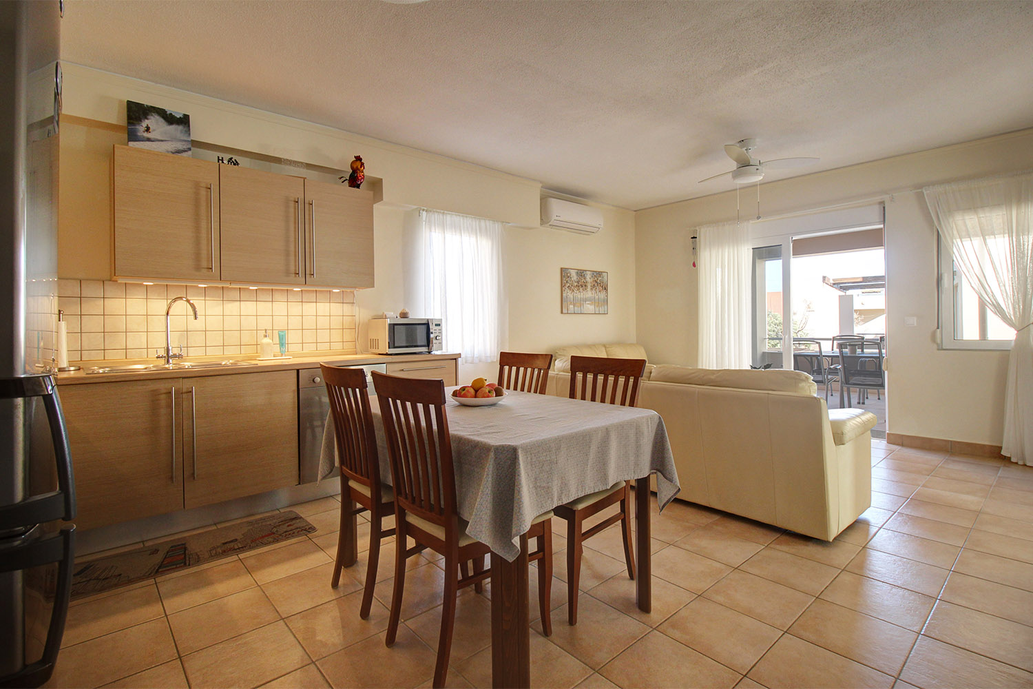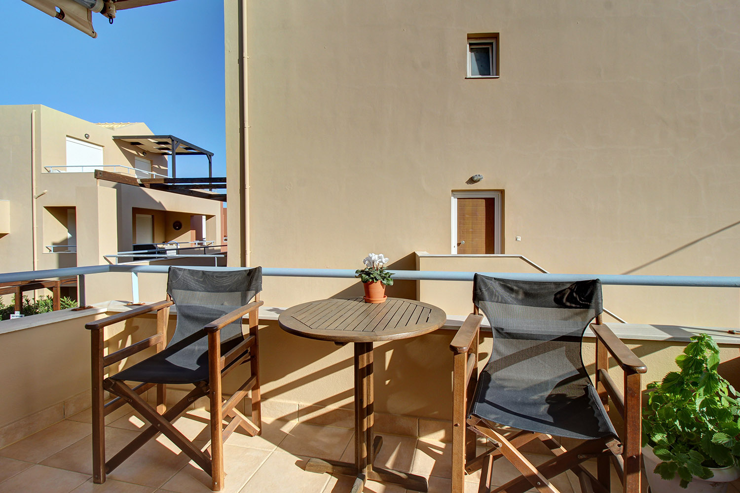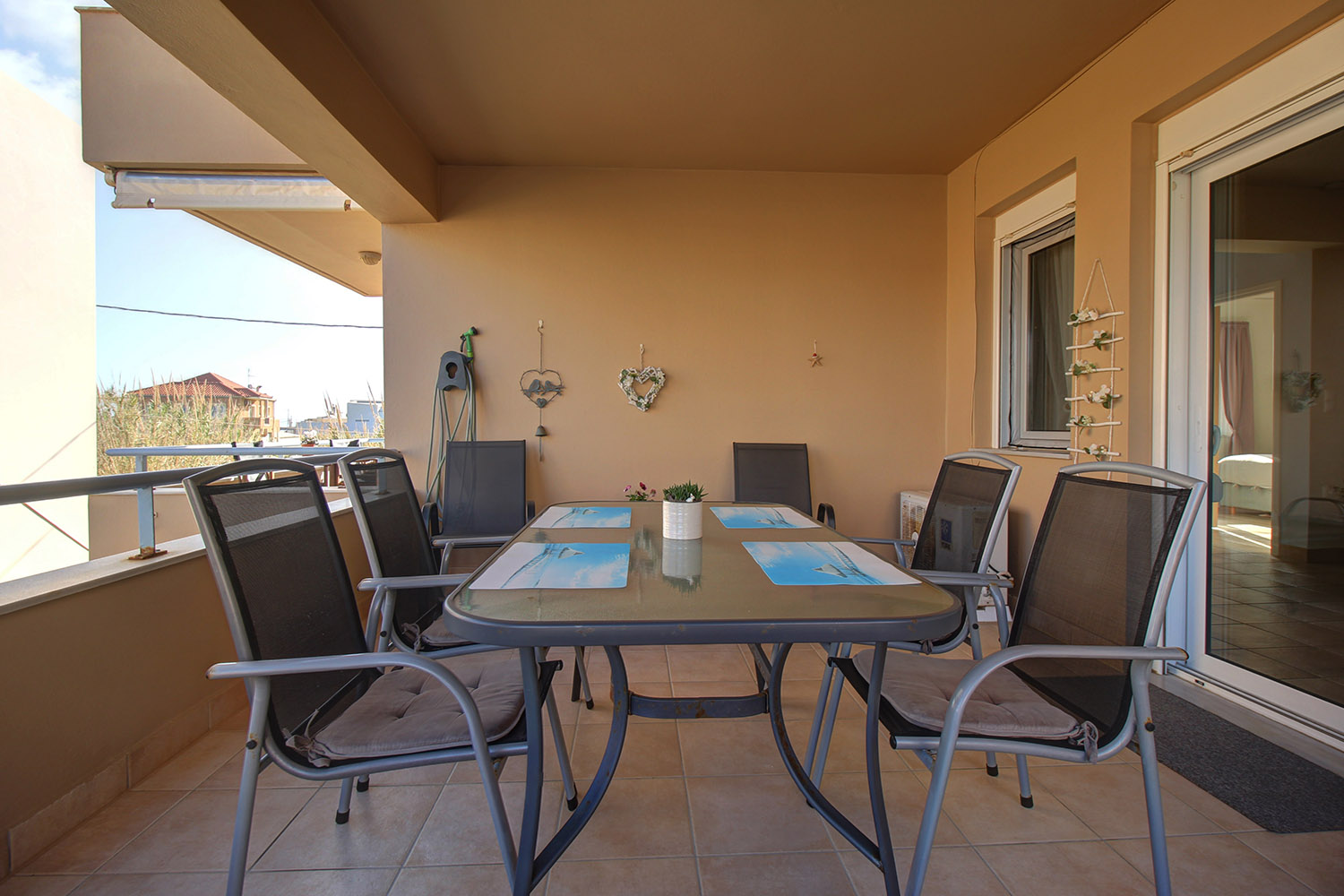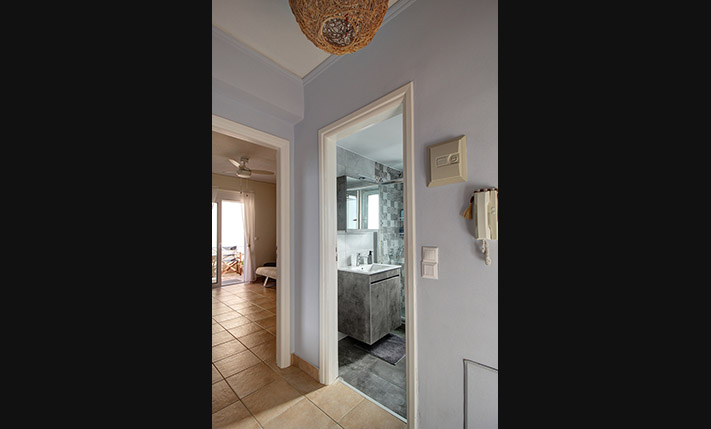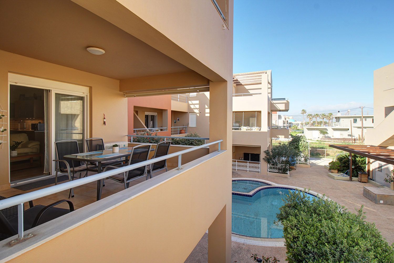 Upon entering, you are welcomed into an open-plan living room and kitchen area that feels bright and inviting. The kitchen offers ample cabinet space and stainless steel appliances, making it practical for everyday use. Large balcony doors from the living area open onto a covered veranda, already furnished with outdoor seating and a dining area. It provides an inviting setting for relaxing or enjoying meals outdoors, with additional space available should you wish to put a barbecue. The two bedrooms are positioned on the eastern side of the building. One enjoys views towards the Lefka Ori (White Mountains), while the second has access to its own private balcony. The bathroom, renovated in 2021, is modern and fitted with a shower.