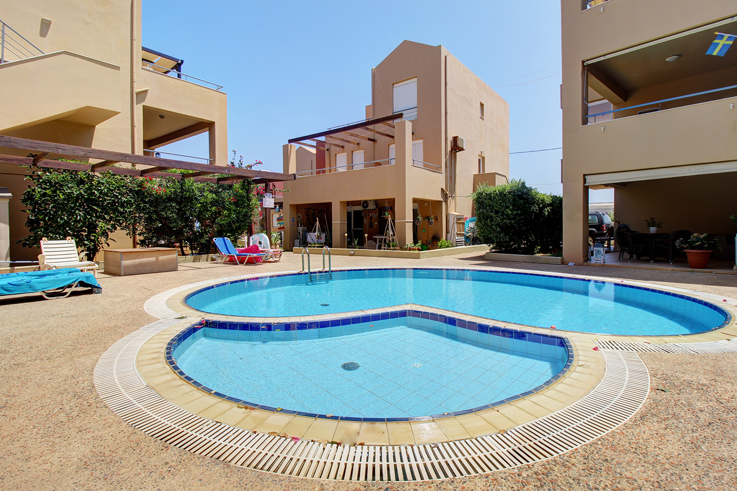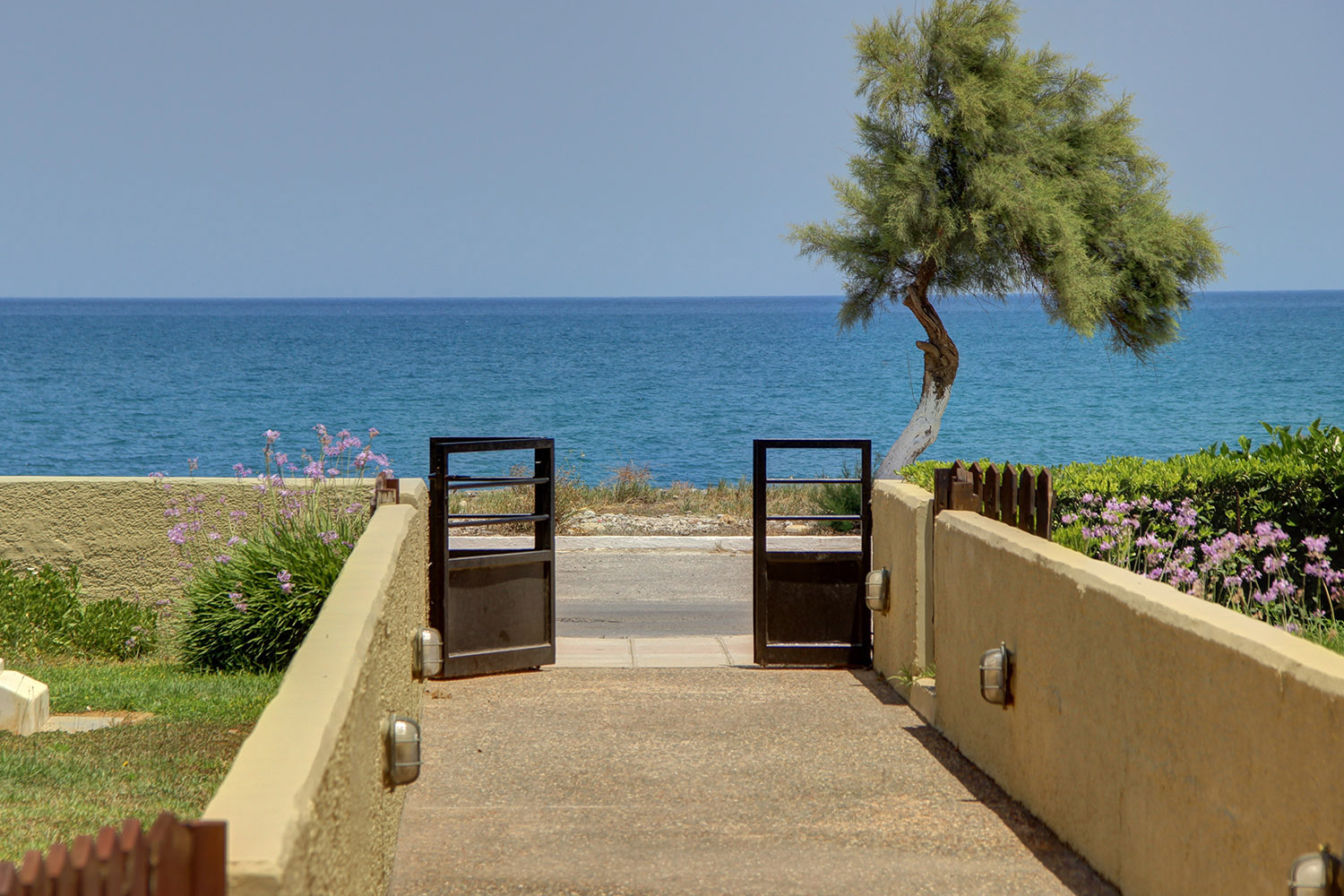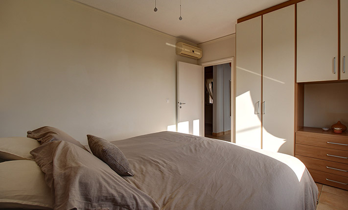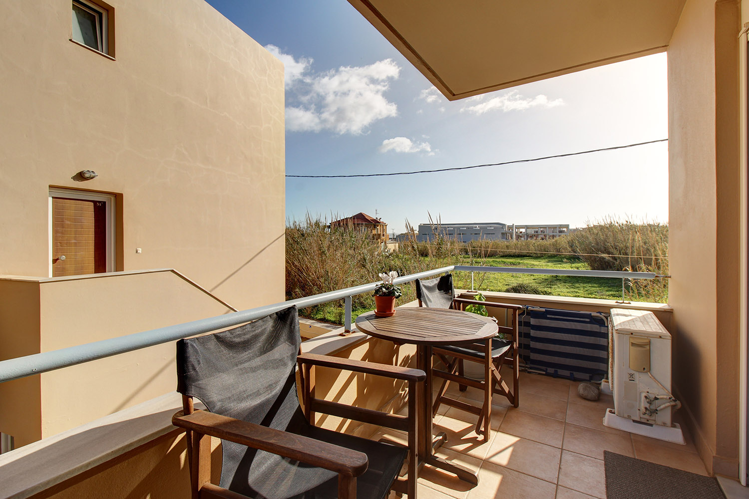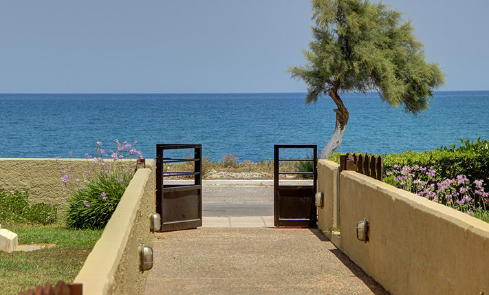 The nearby beach combines organized areas with quieter stretches and is known for its clear waters. A seafront road runs alongside it, ideal for walking, cycling, or jogging. Along the waterfront, you will find a selection of cafés and restaurants offering well-regarded local cuisine. Daily amenities such as a large supermarket, pharmacy, bakery, and regular year-round public transport connections to Chania and Kissamos are all within walking distance. The center of Platanias, less than a 10-minute drive away, provides banks, a post office, and a wide range of shops. The city of Chania and Chania International Airport are approximately 30 and 40 minutes away by car, respectively.