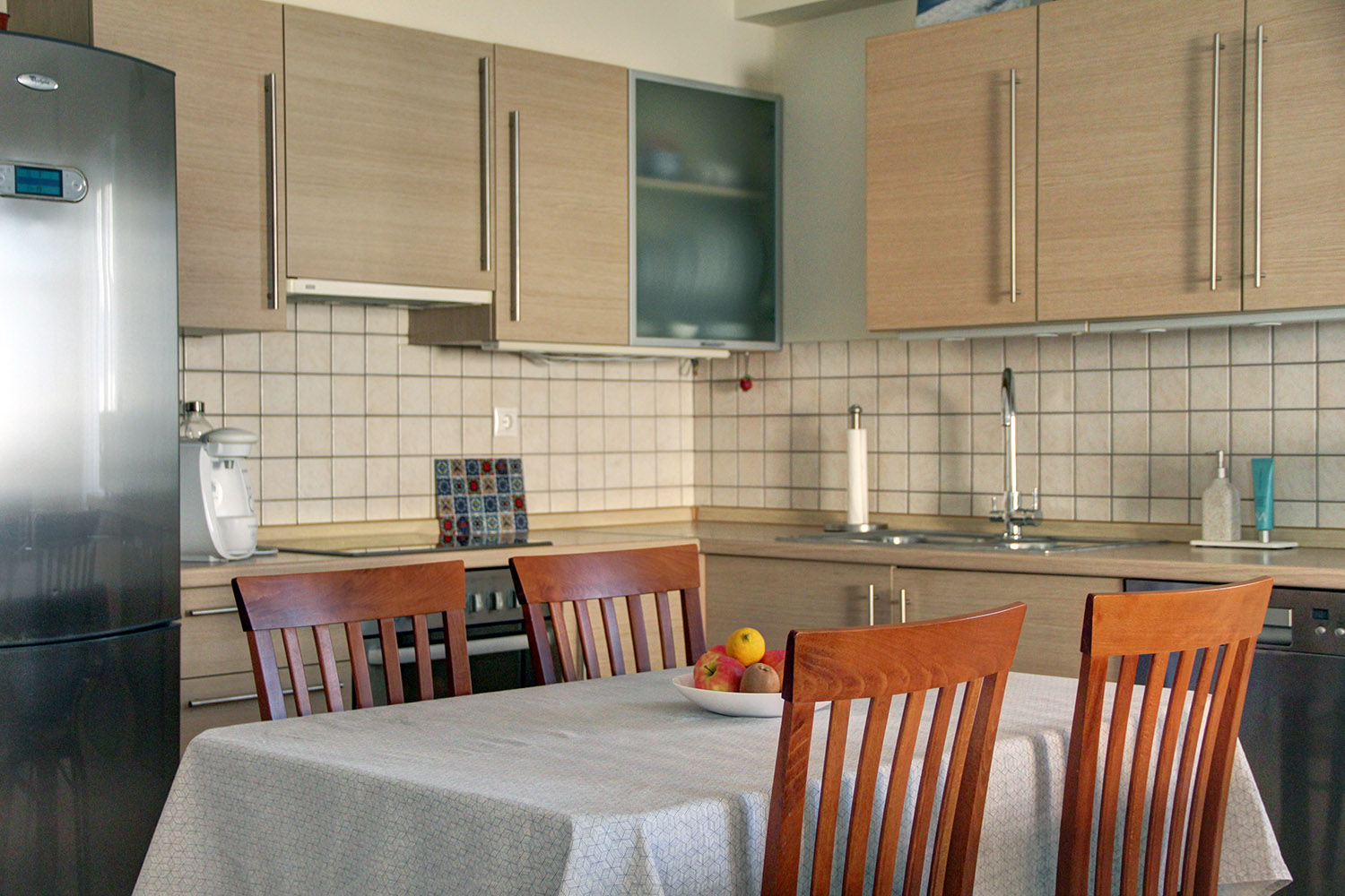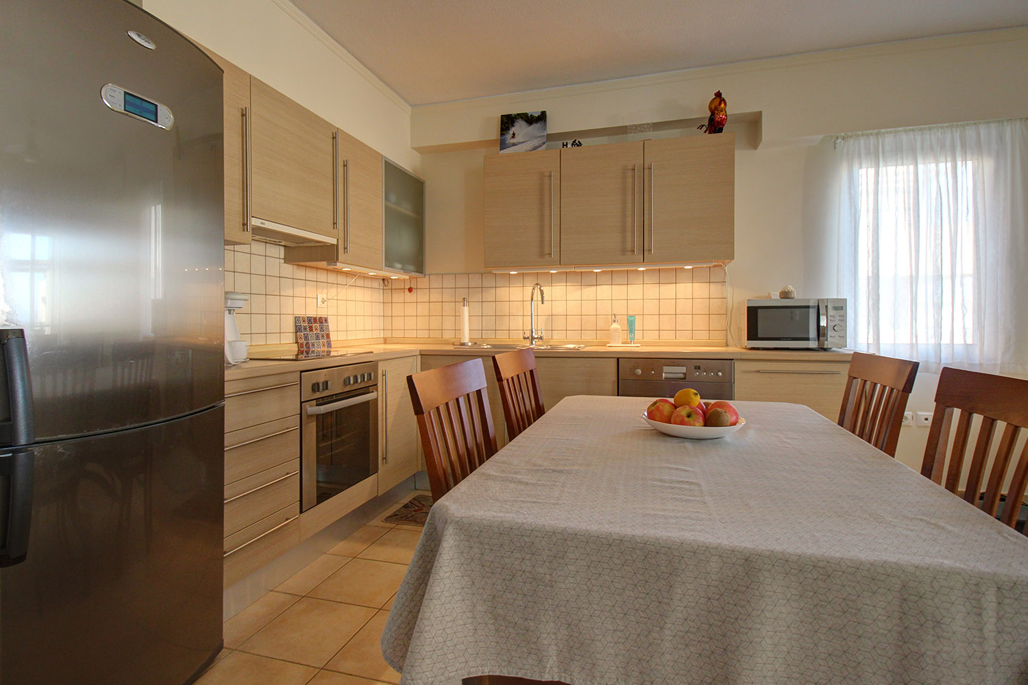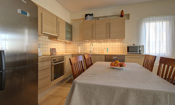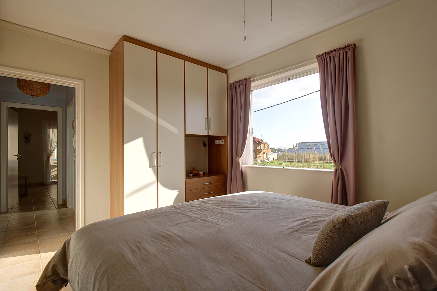 The nearby beach combines organized areas with quieter stretches and is known for its clear waters. A seafront road runs alongside it, ideal for walking, cycling, or jogging. Along the waterfront, you will find a selection of cafés and restaurants offering well-regarded local cuisine. Daily amenities such as a large supermarket, pharmacy, bakery, and regular year-round public transport connections to Chania and Kissamos are all within walking distance. The center of Platanias, less than a 10-minute drive away, provides banks, a post office, and a wide range of shops. The city of Chania and Chania International Airport are approximately 30 and 40 minutes away by car, respectively.