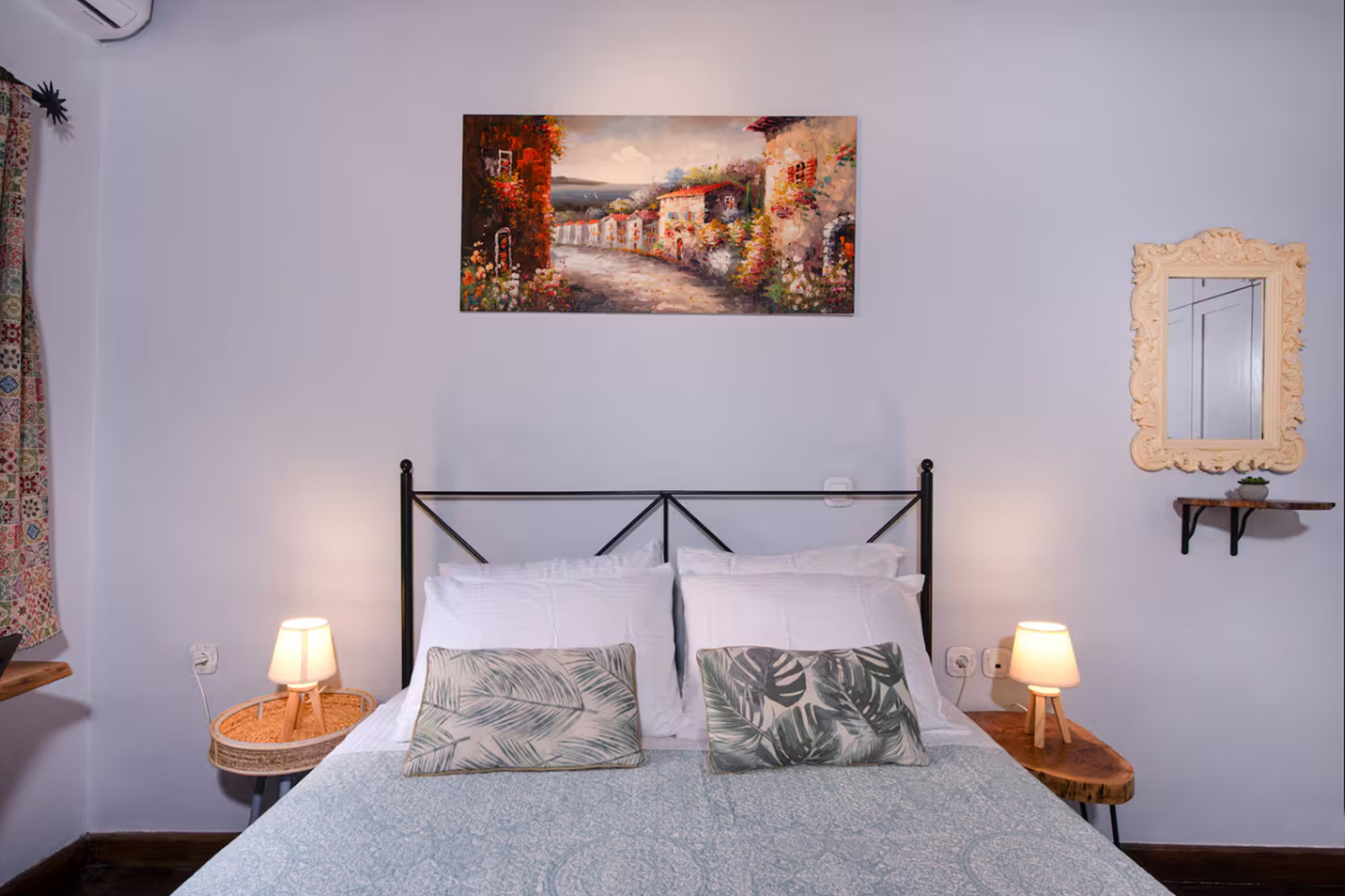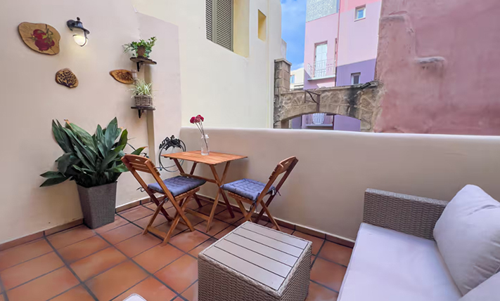 The main entrance is traditional wooden and opens onto a kitchen, which, despite its size, is extremely functional and has a wooden counter, dishwasher and washing machine. At the back is a second room with a dining area and a small living space, where one person can be accommodated. The bathroom is also on the ground floor and has a shower. A circular staircase leads to the first floor, where we find the bedroom. It has a large built-in wardrobe, part of which is also used as a linen closet while it also has an exit to a good-sized small balcony.