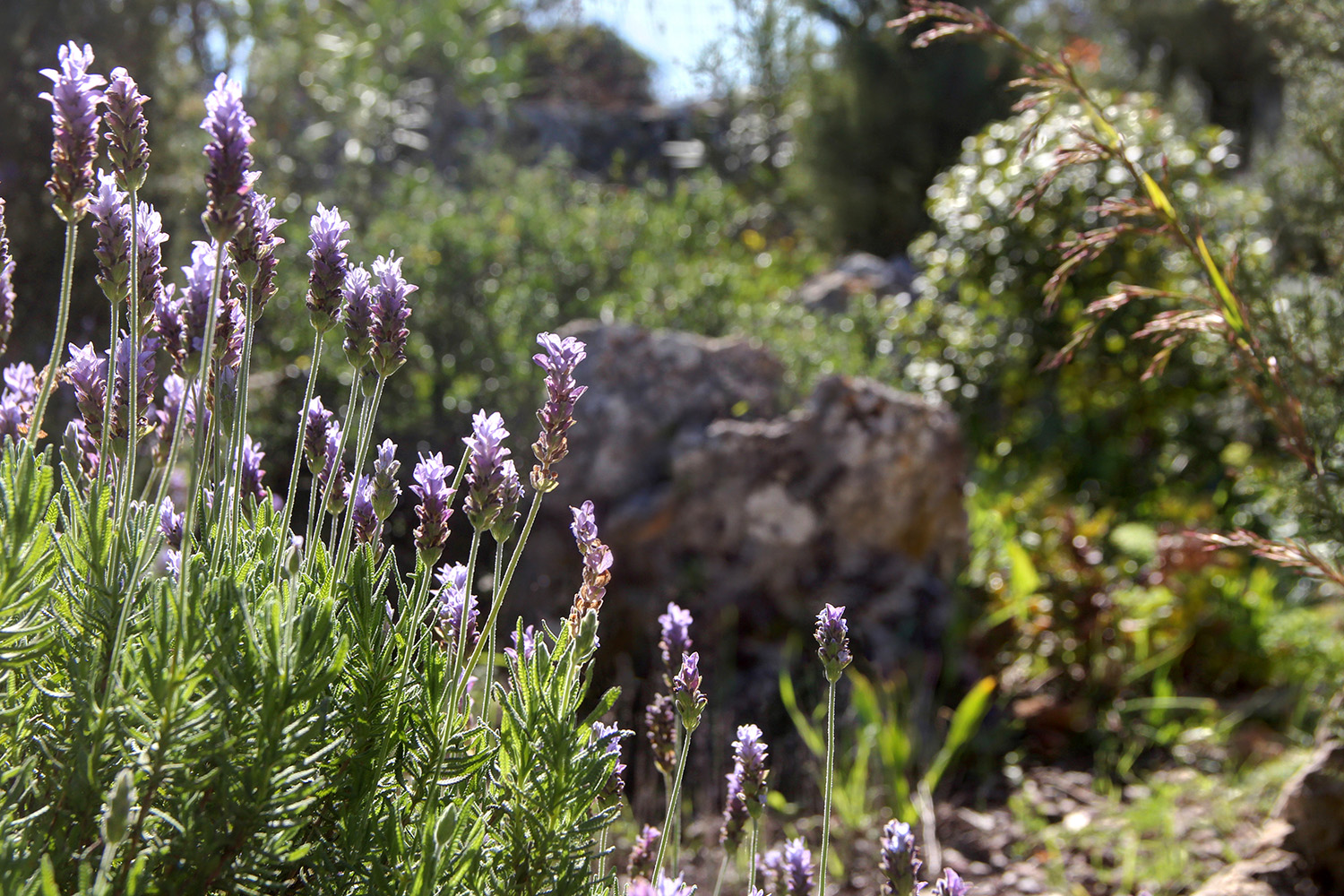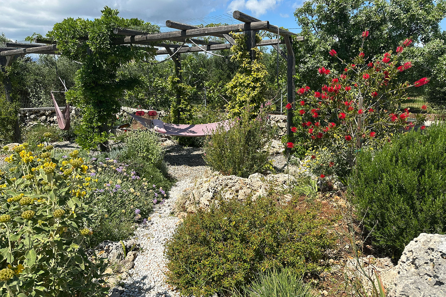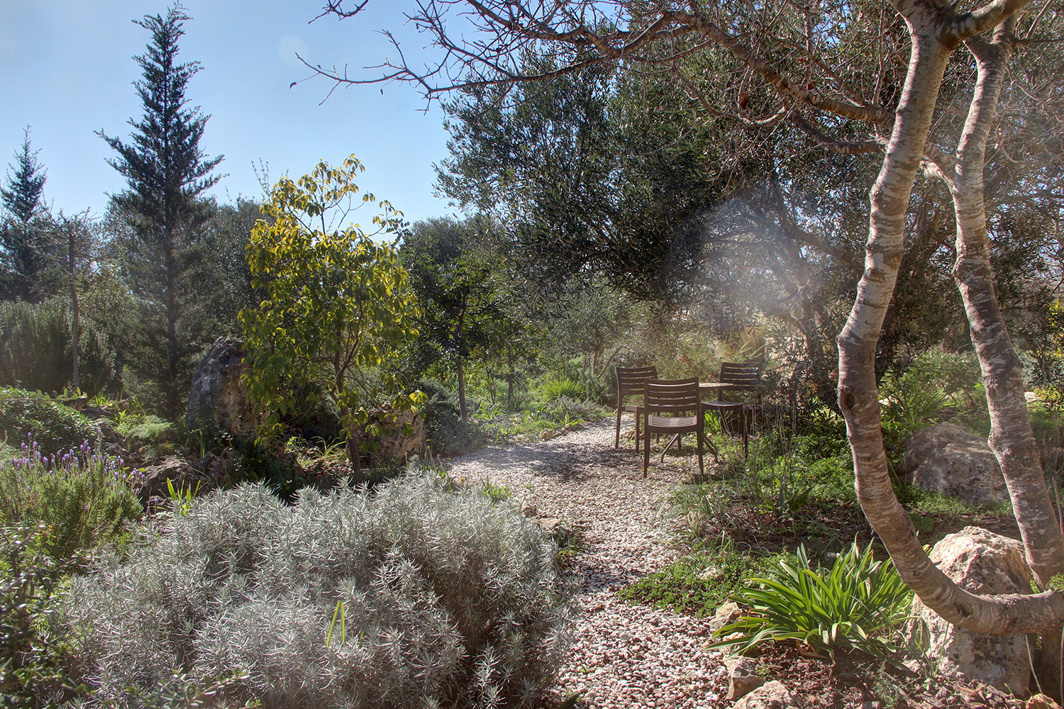 The property is fully enclosed by stone walls and fencing, creating a peaceful private sanctuary surrounded by nature. Access is through an electric gate leading to a private driveway and beautifully landscaped grounds where stone pathways wind through lush mediterranean gardens filled with herbs, flowers, and mature trees. Numerous outdoor living spaces are thoughtfully positioned throughout the estate, offering shaded corners for quiet relaxation, sunny terraces for entertaining, hammock areas among the trees, and dedicated areas for activities such as yoga, pétanque, and archery.