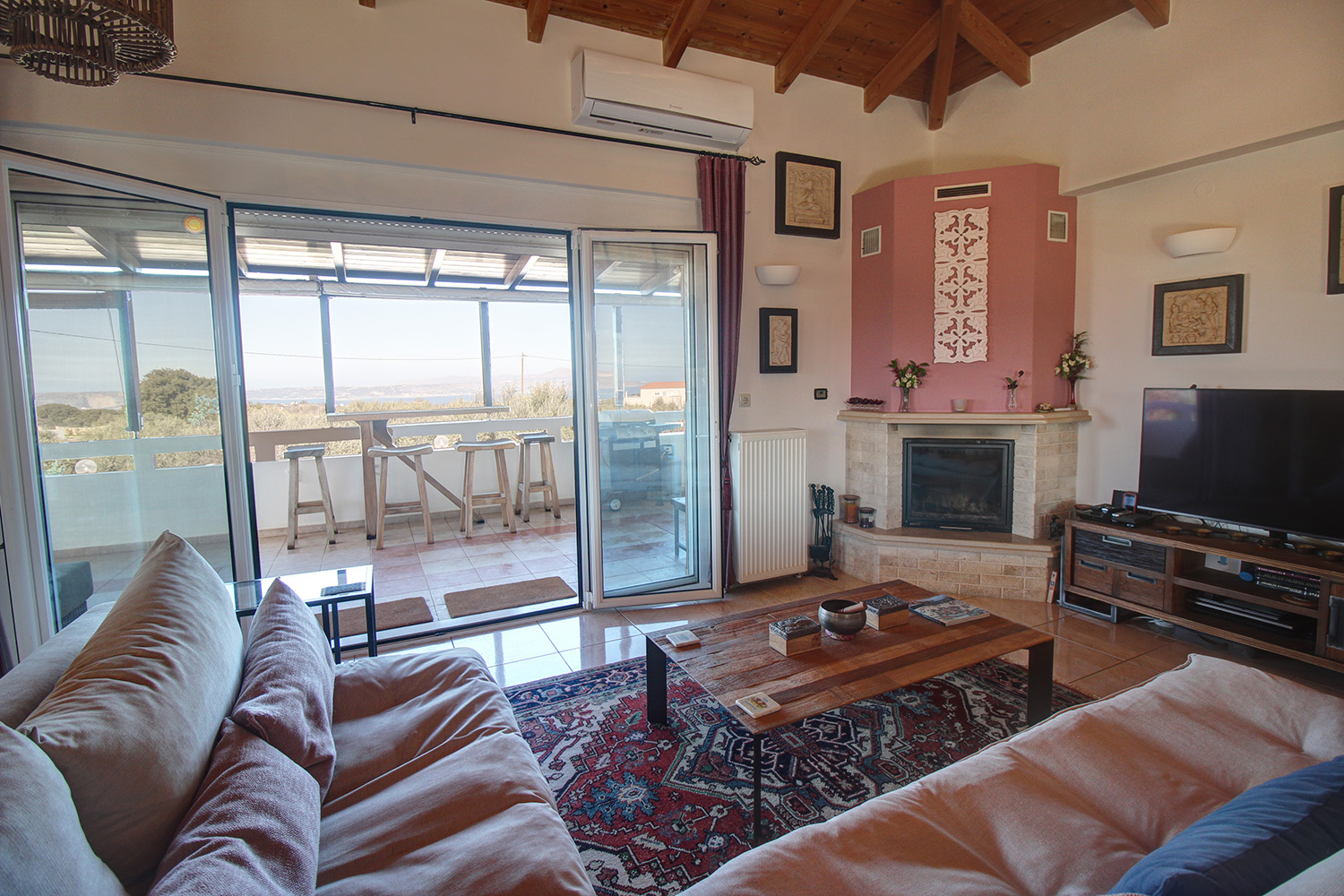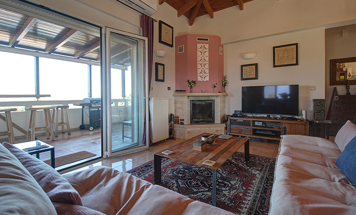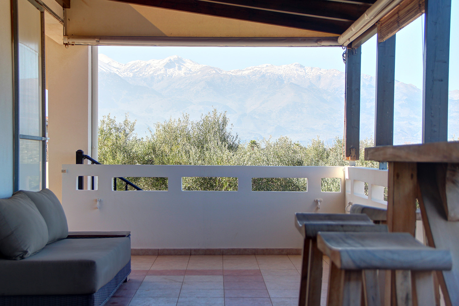 The upper level features a bright open-plan living and dining area with high ceilings and abundant natural light. Covered verandas extend from two sides of the living space creates seamless indoor-outdoor living with comfortable seating areas overlooking the panoramic landscape. Large sections of the verandas can be enclosed with vertical awnings, allowing the space to be enjoyed throughout the year. The kitchen is thoughtfully designed with generous cabinetry and a breakfast bar. This level also includes a spacious master bedroom with en-suite bathroom, a second bedroom currently used as a home office, and an additional bathroom. From the veranda, a metal staircase leads to the rooftop terrace, where a bar area has been created, a breathtaking vantagepoint for sunset cocktails while overlooking Souda Bay and the uninterrupted White Mountain range.