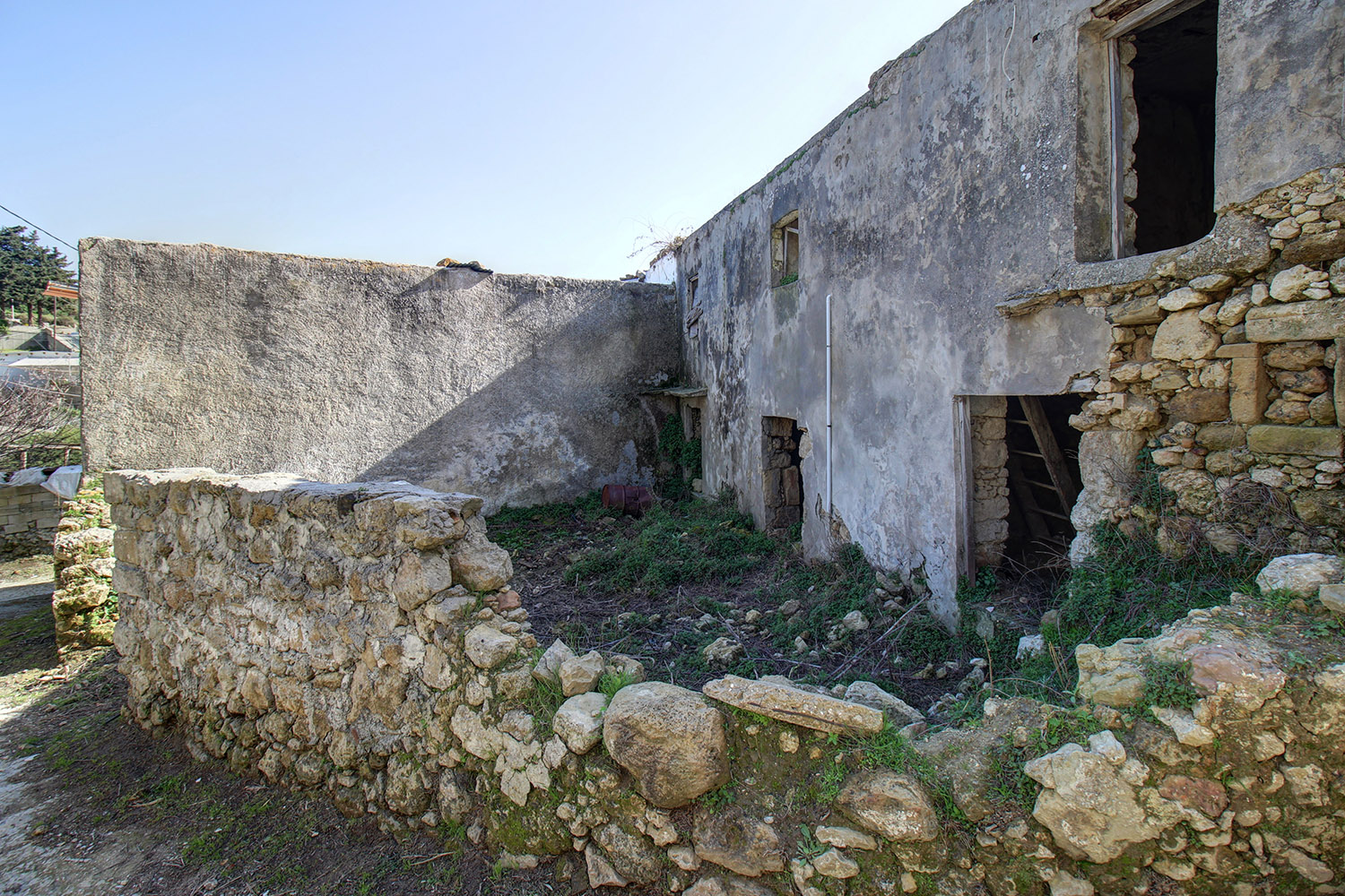 The property is in the traditional, semi-mountainous village Geni about 30 minutes' drive south from the city of Rethymnon. It is a two-story abandoned house with two levels of 67 m² each as well as an independent small storage room of 6 m². The building is in the center of the plot and therefore there is space for a yard or garden separately on each level. Thus, you can repair the building into two independent apartments or you may connect them and create a comfortable two-story detached house. In the second case, the interior spaces allow you to construct up to three comfortable bedrooms with a large open-plan living and kitchen area.