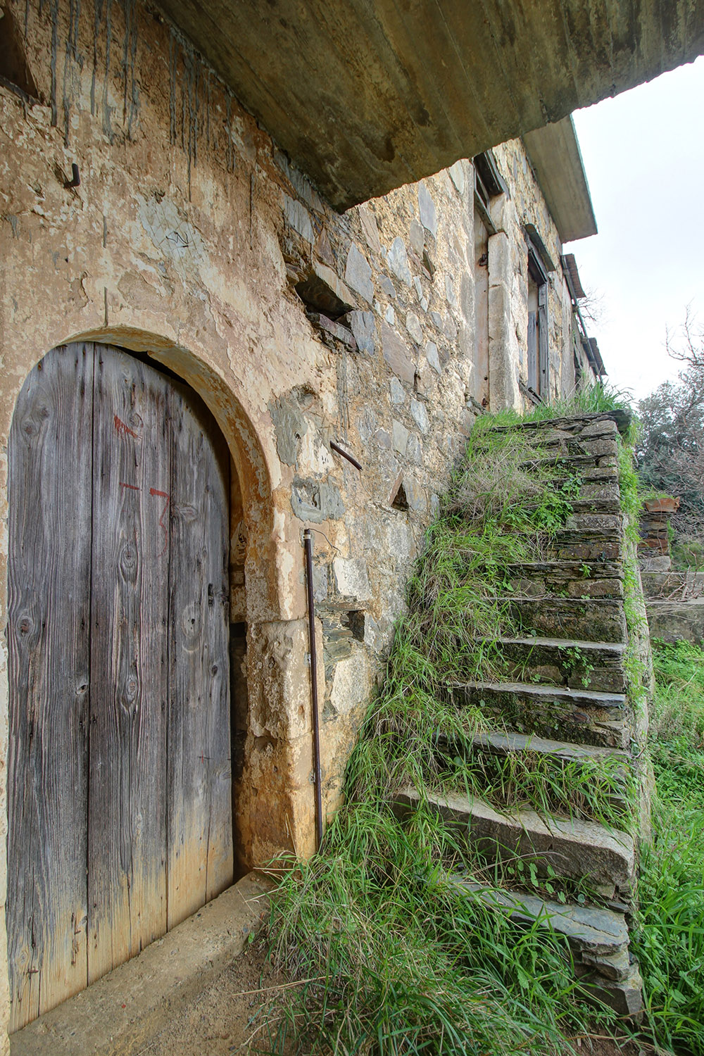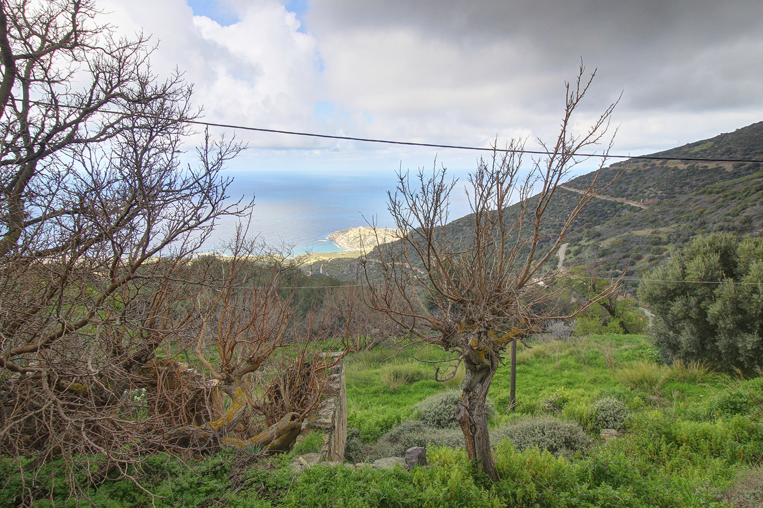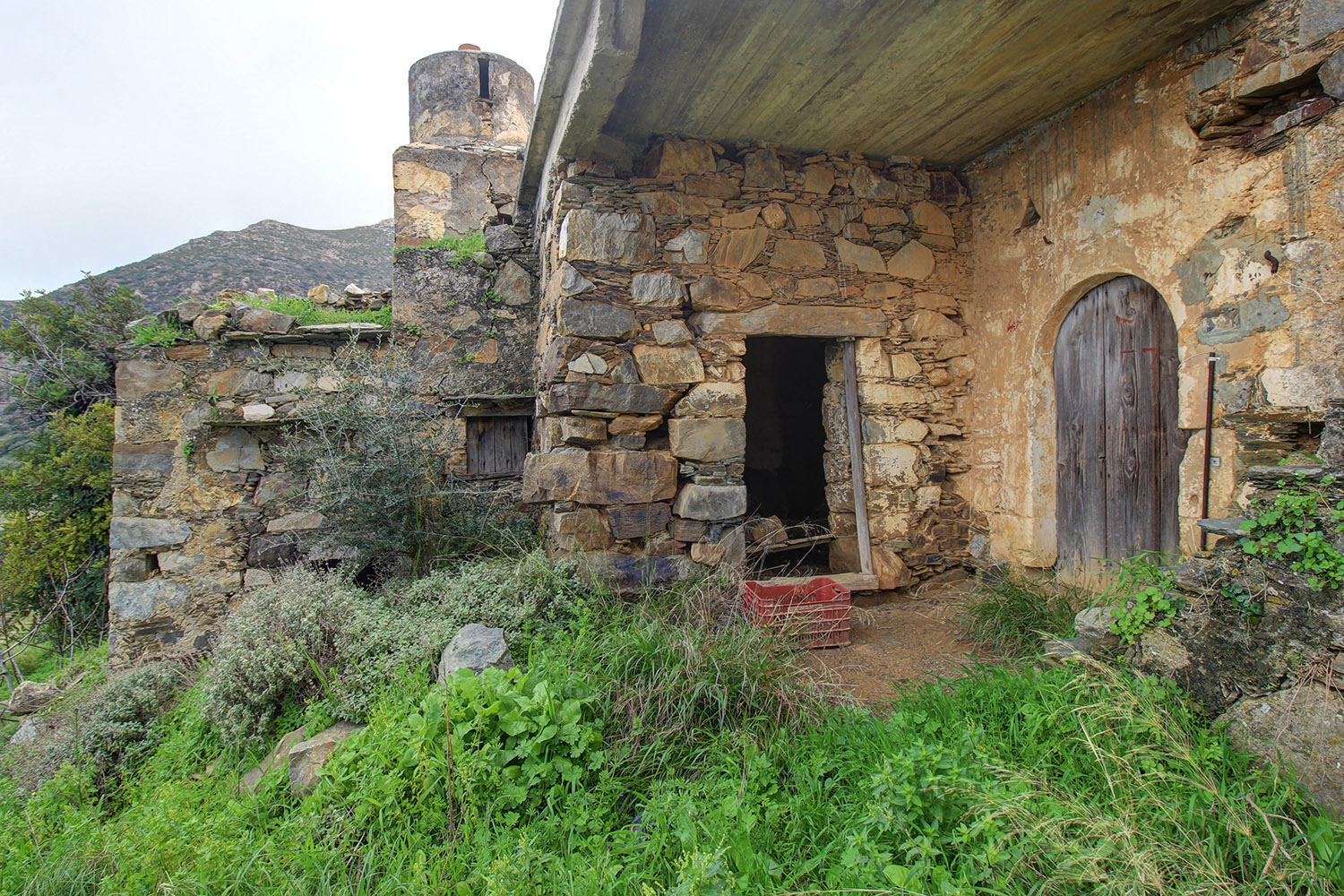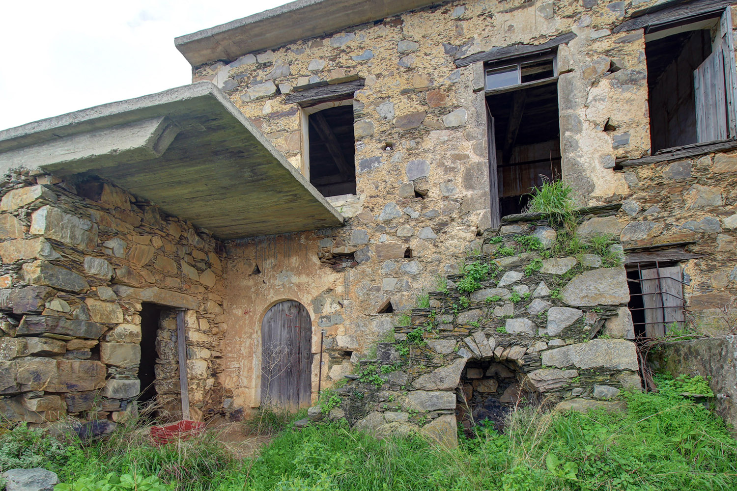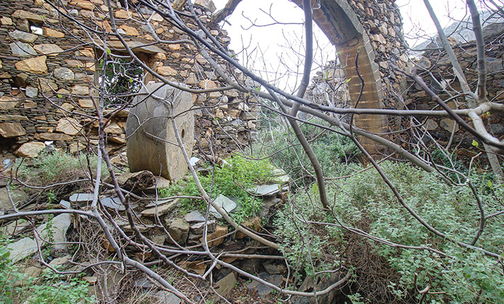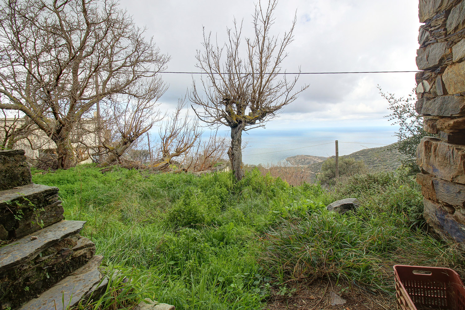 The residence is in a traditional neighborhood on a western hillside with impressive views of the verdant surrounding area and up to the sea. It is an old stone house with two levels, which needs restoration. It includes a covered section of approximately 130 m² that can be repaired immediately as well as two roofless buildings, on which you can construct a roof if you issue a building permit. These are an old storehouse of 29 m² as well as an old oil mill of 83 m², where the big millstones and the metal press have been preserved.