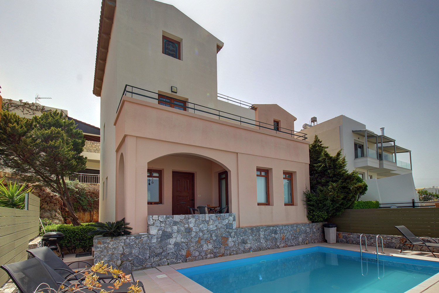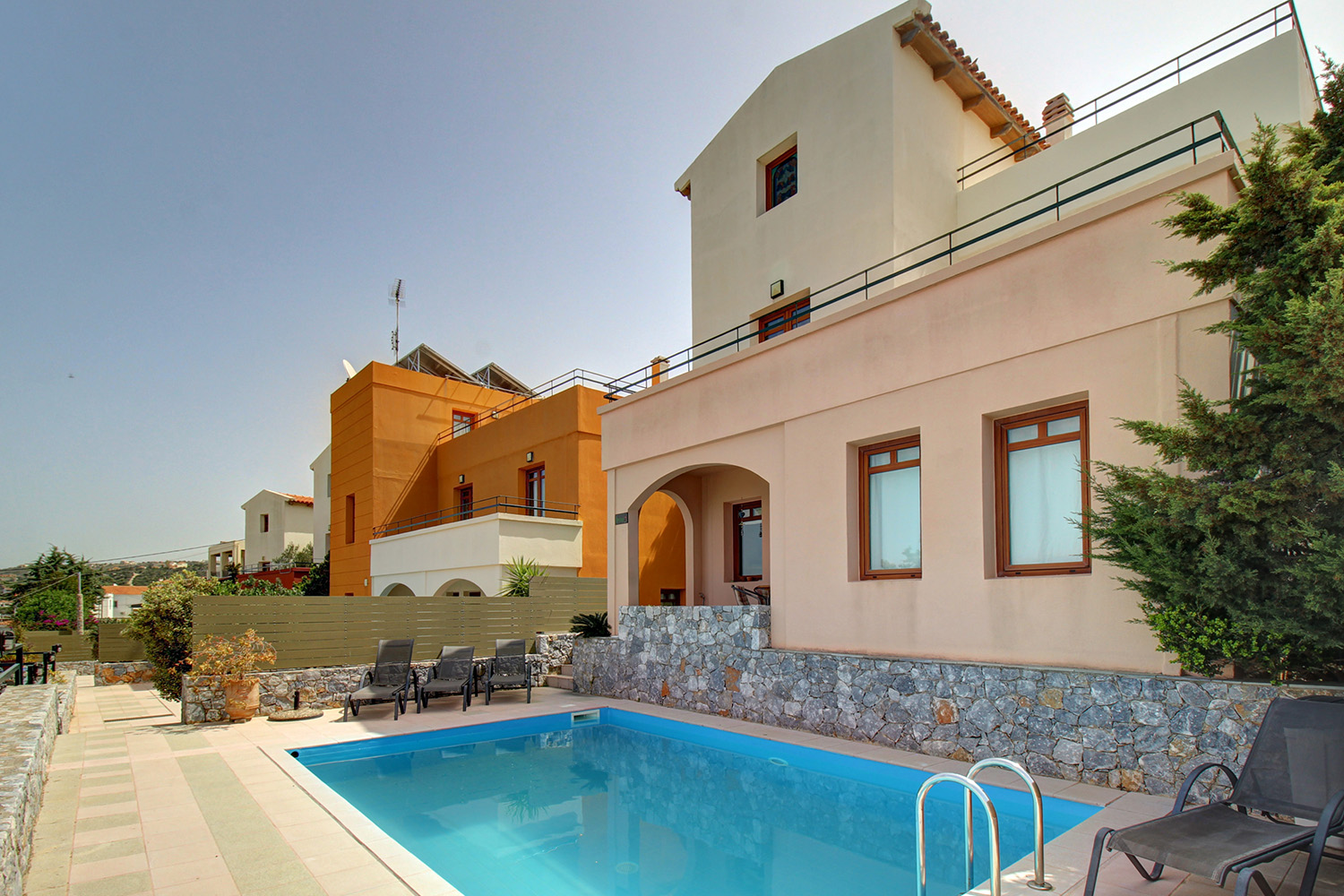 The complex consists of 5 residences, which have been built on a plot of 1,315 m² and each has a private pool, courtyard and a small garden in its exclusive use. The north side of the property has a large slope, where there are currently a wall and a staircase. Therefore, unobstructed views over the bay of Souda and the beautiful surrounding area are ensured.