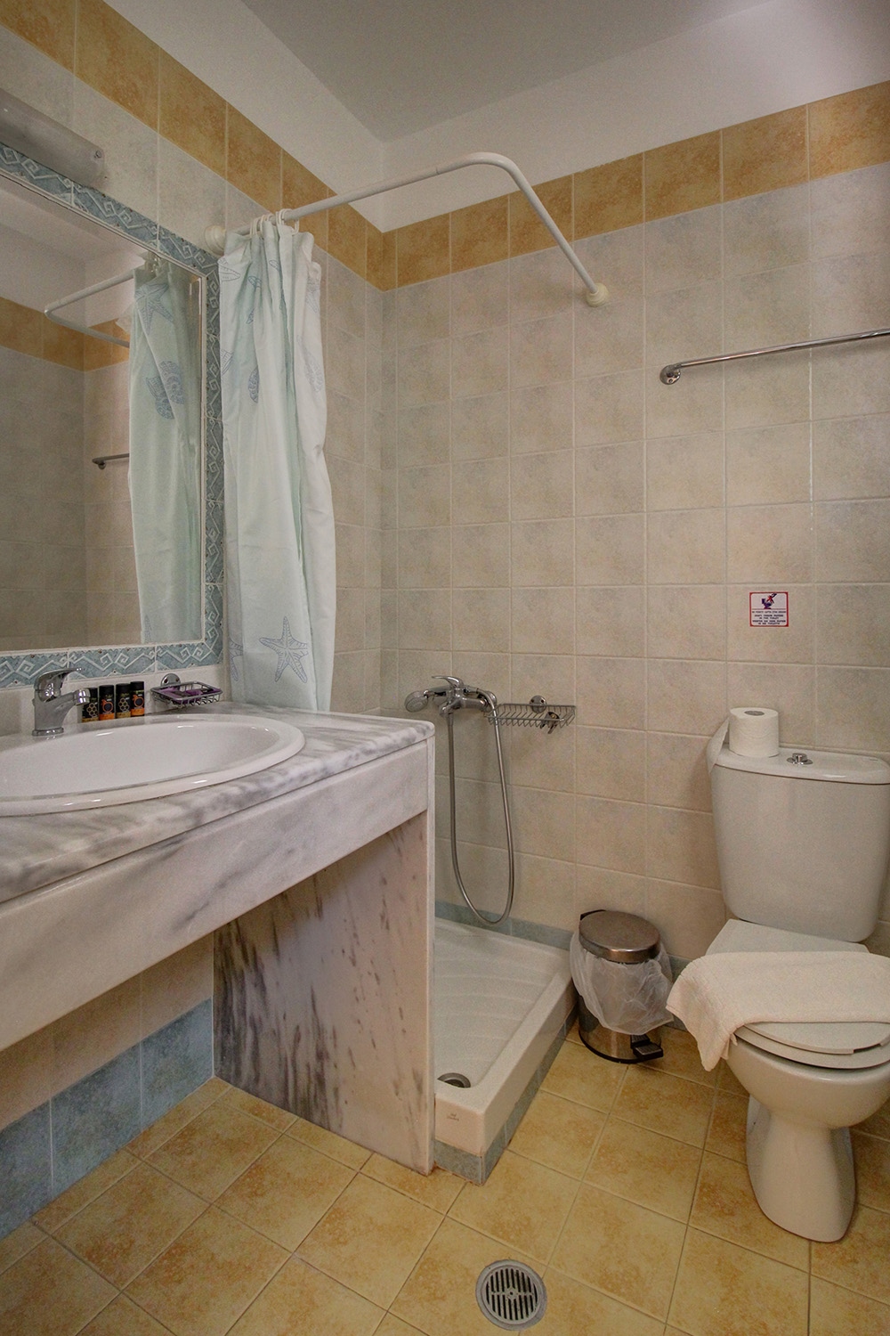 The buildings are oriented towards the north and all areas face the sea. Each pool is on the frontage and has well-sized surrounding area while a little lower there is another terrace with beautiful flower beds, where you can enjoy your coffee. Before each main entrance, we find a small covered terrace, which has shade all day and faces the pool.