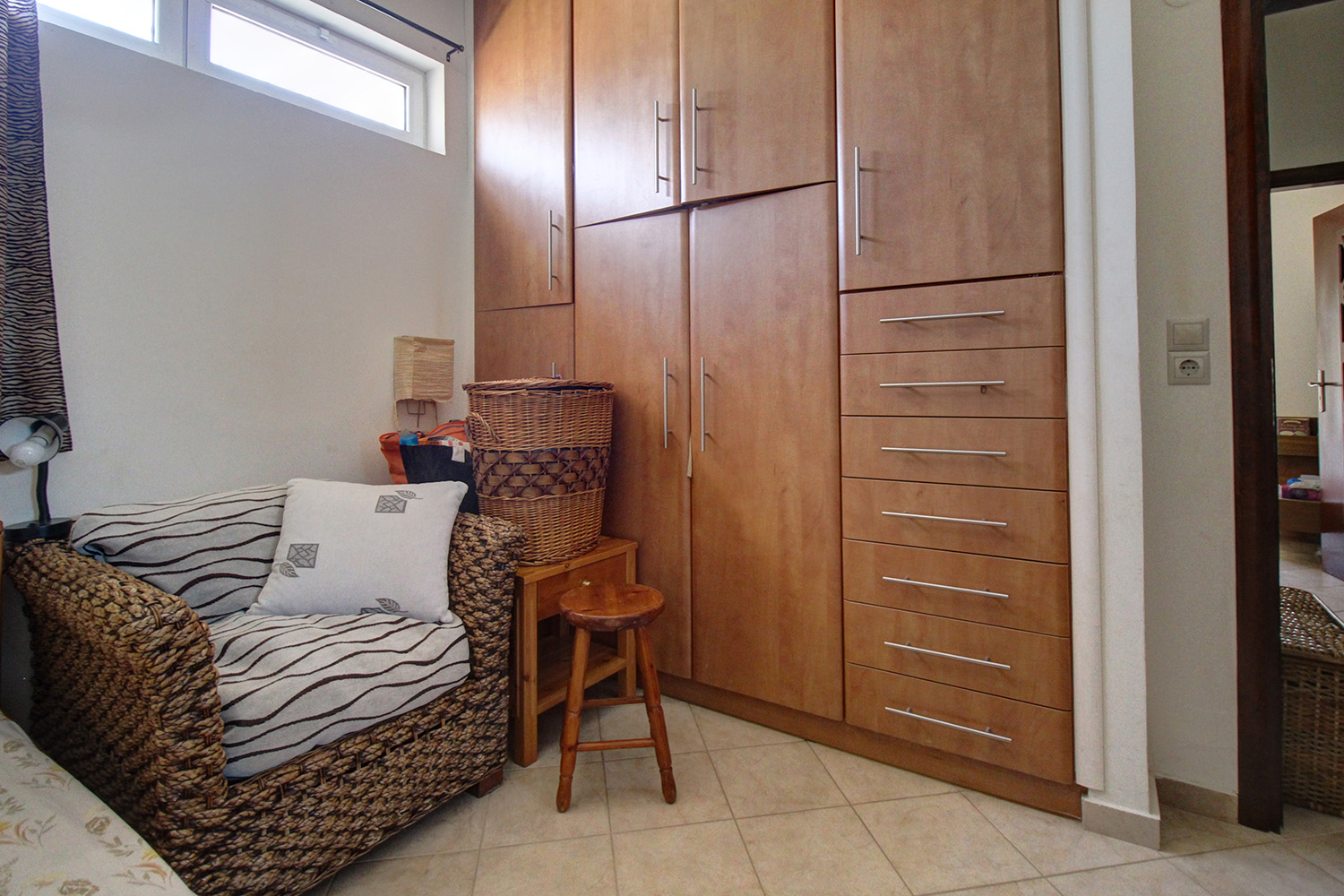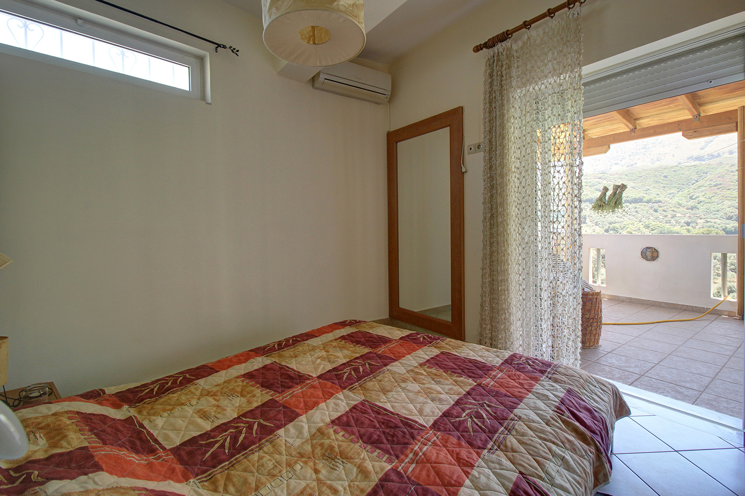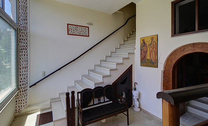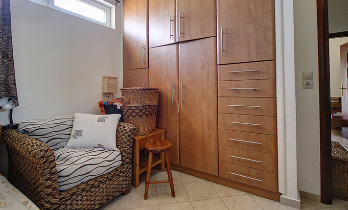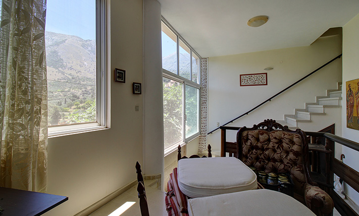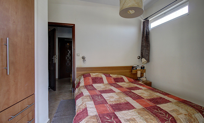 A staircase starting from the atrium leads upstairs to a 60 m² apartment that was added in 2004. The main feature of the apartment is its large balcony, which is covered with a tiled roof and is an ideal place to relax, as it allows you to enjoy the sounds of nature and the impressive views. The apartment consists of an open-plan living space and a large kitchen that are L-shaped, a bathroom and two bedrooms with fitted wardrobes. The owner of the house is a professional carpenter and all the wooden parts are handmade, well-maintained and of excellent quality.