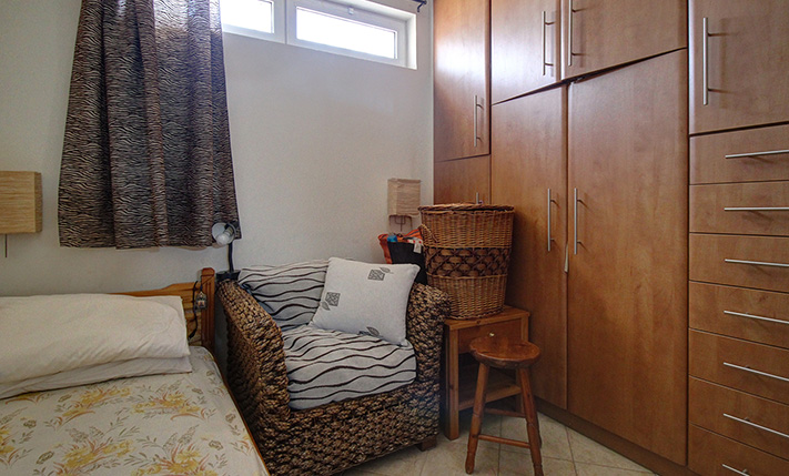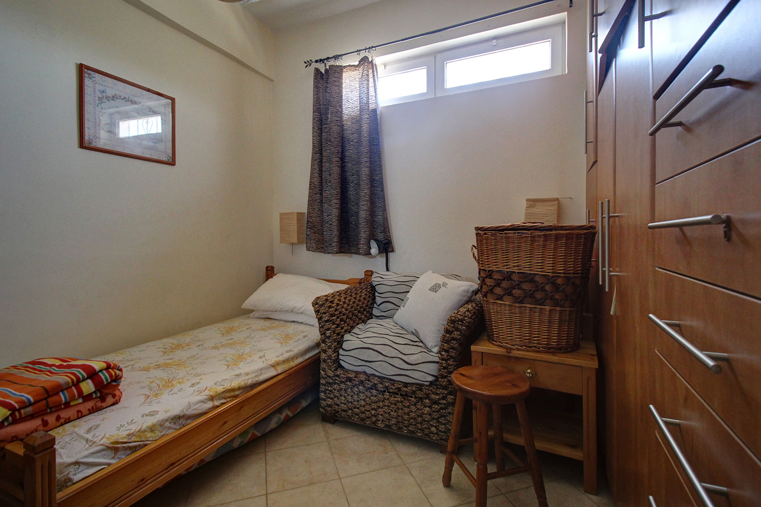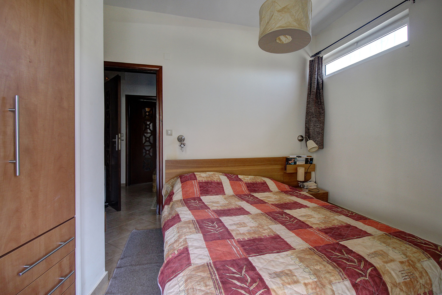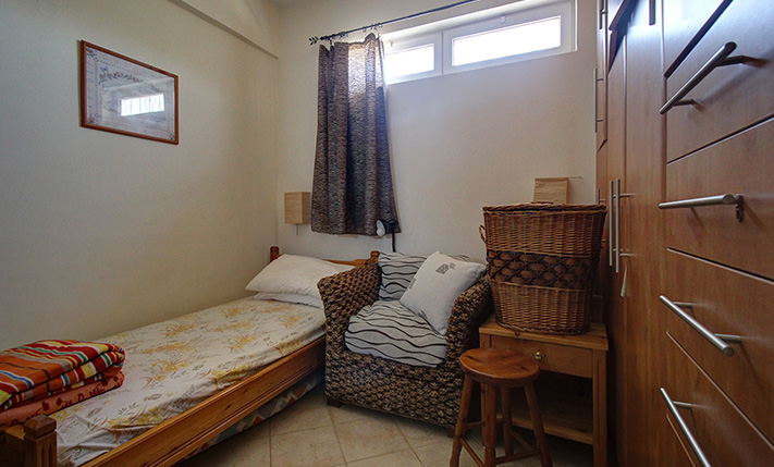 A staircase starting from the atrium leads upstairs to a 60 m² apartment that was added in 2004. The main feature of the apartment is its large balcony, which is covered with a tiled roof and is an ideal place to relax, as it allows you to enjoy the sounds of nature and the impressive views. The apartment consists of an open-plan living space and a large kitchen that are L-shaped, a bathroom and two bedrooms with fitted wardrobes. The owner of the house is a professional carpenter and all the wooden parts are handmade, well-maintained and of excellent quality.