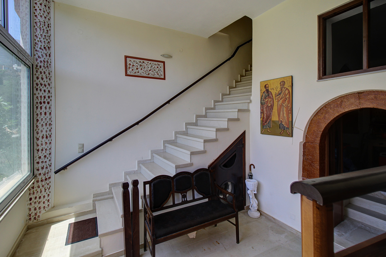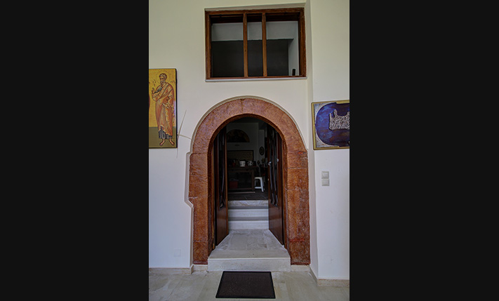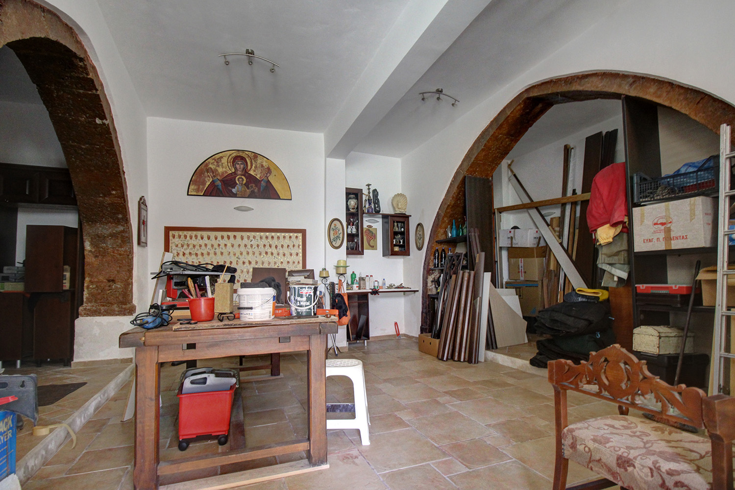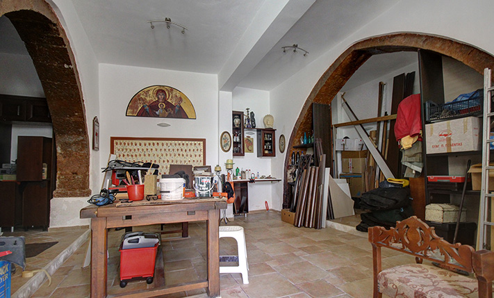 There are three levels in total. On the ground floor we find only an entrance hall, an auxiliary storage space as well as the internal staircase that connects the floors. Going upstairs we find a high atrium with oversized windows that let in plenty of light. The atrium is shared between the two apartments, occupies a total of 33 m² and is currently configured as a living room. In any case, it can become an office, playroom or even it may be separated in order to accommodate an independent studio-guesthouse. The old part of the building is on the same level. An arched door leads us to a 62 m² apartment, which is open-plan and has a large kitchen and bathroom with shower. It can comfortably accommodate two people as it currently is, while its large open-plan space can easily be divided and two bedrooms can be created.