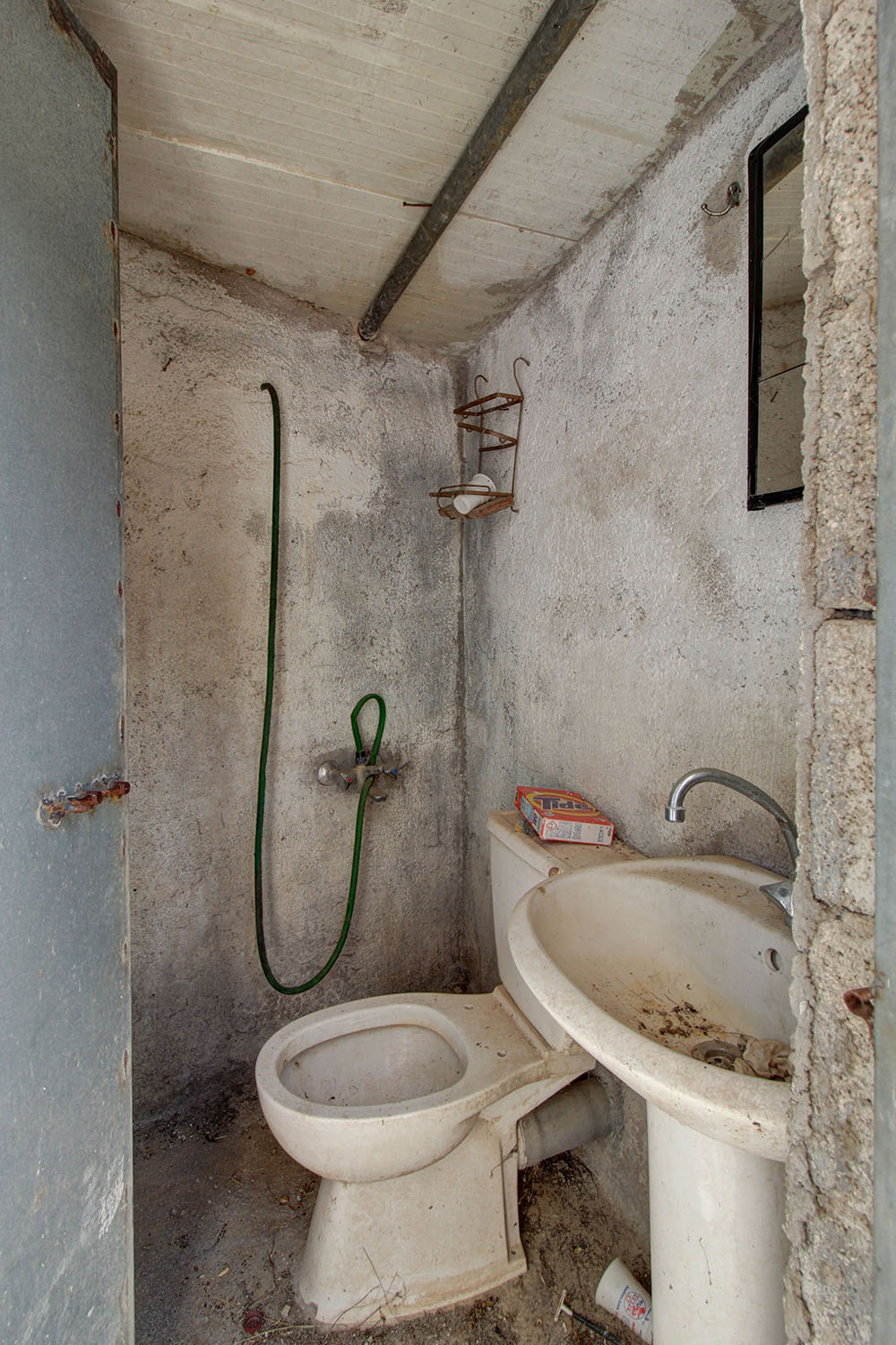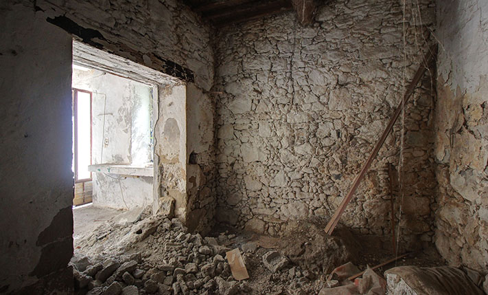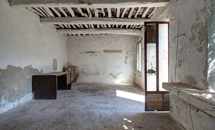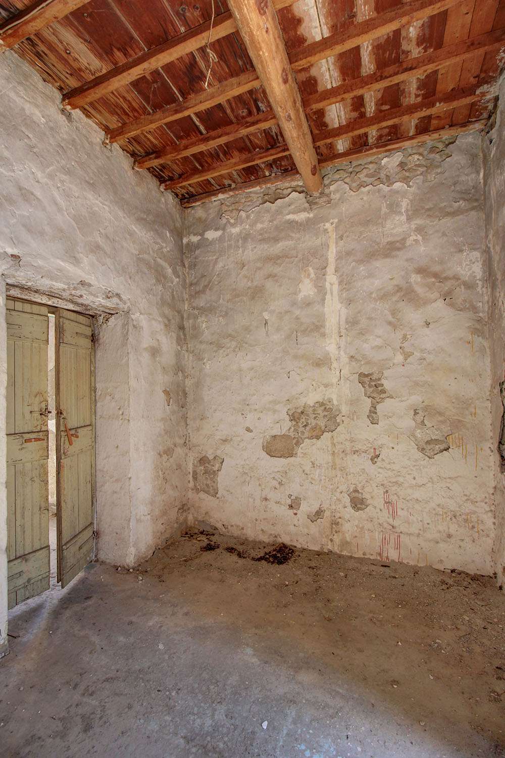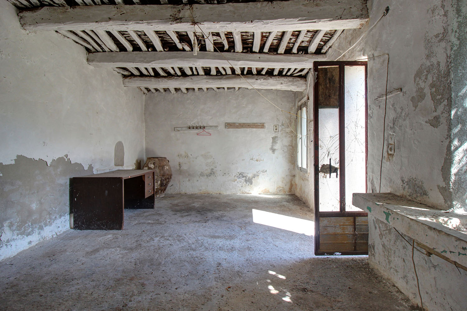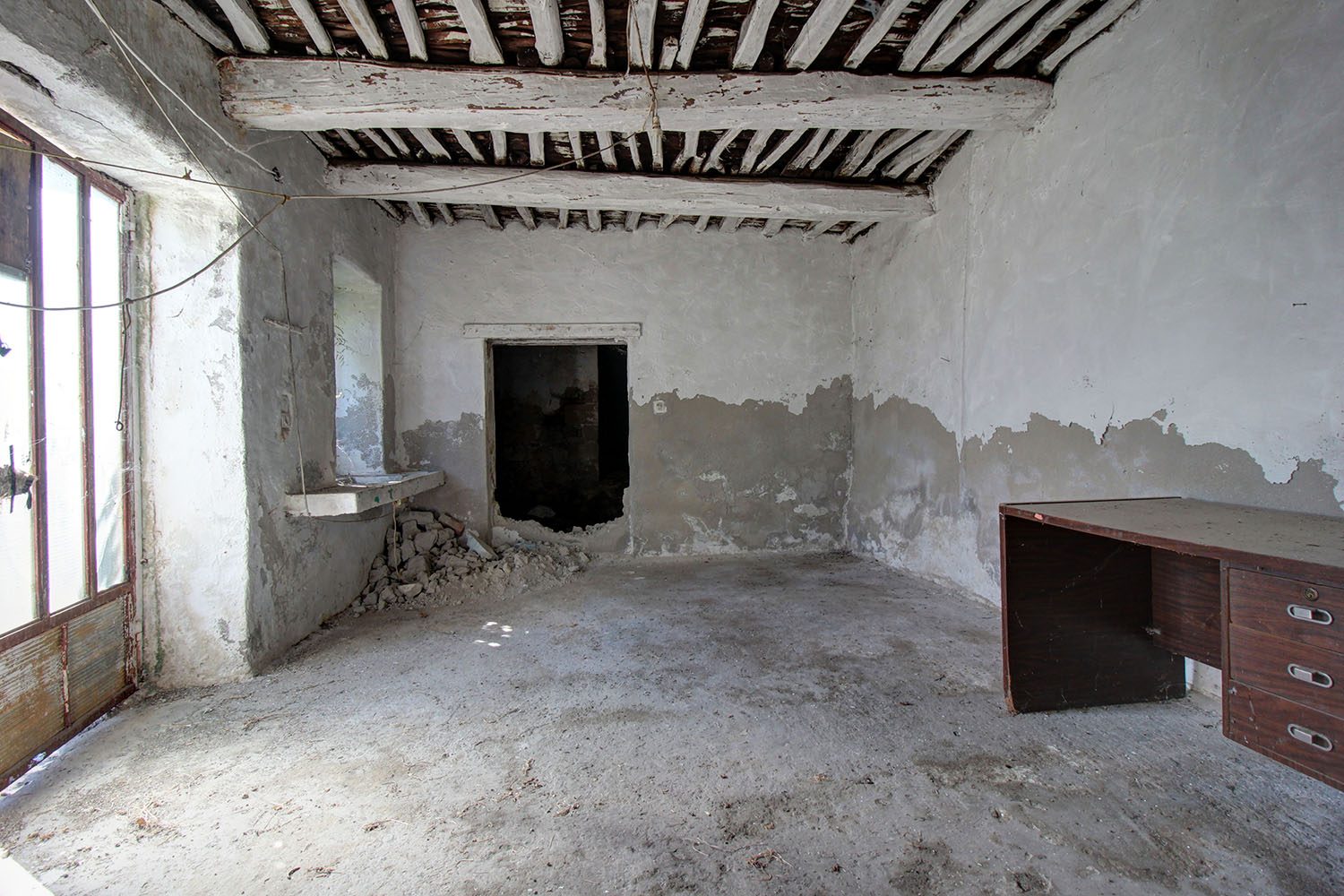 Each level of the building is currently independent while an internal staircase can very easily be added in order to become a single functional unit. The ground floor is divided into three rooms with a total area of 58 m², where you can create main spaces and a bedroom. The upper floor is open-plan of 47 m² and can house two more rooms. Alternatively, you can repair the building upside-down by placing the private spaces on the ground floor. The old bathroom of the house is in a small space adjacent but outside of the building, which can be converted into a storehouse in order to add new bathrooms inside the residence. On the frontage of the house there are currently the walls from an old dilapidated building, which can be removed or integrated nicely into any configuration in the future. We also find an old cistern and some trees.