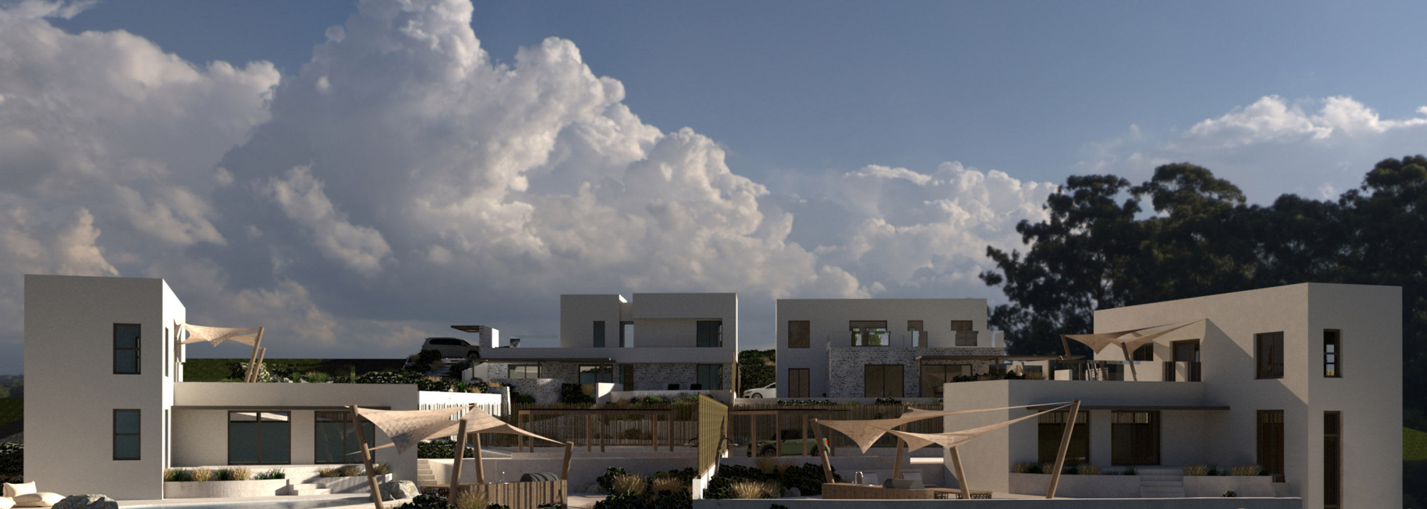 The house will be constructed in a luxurious complex with four properties, which are independent as each has plot and a swimming pool in its exclusive use. This residence is arranged over three levels with an underground-basement guesthouse of 69 m² and two levels above of additional 155 m². It will be built on a plot of 817 m² with parking spaces, courtyards and space for a beautiful garden. The sale price will also include a private swimming pool of 50 m².