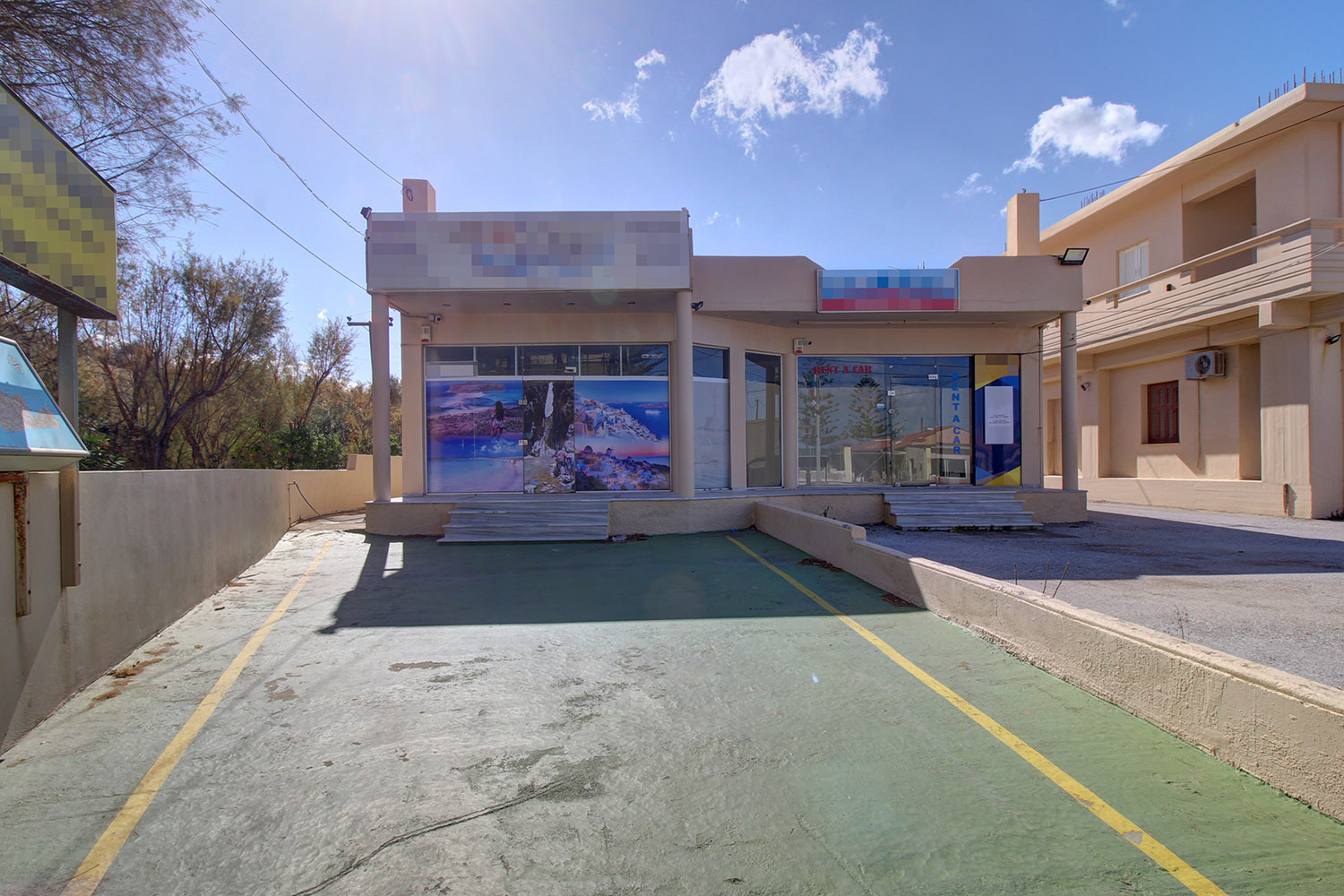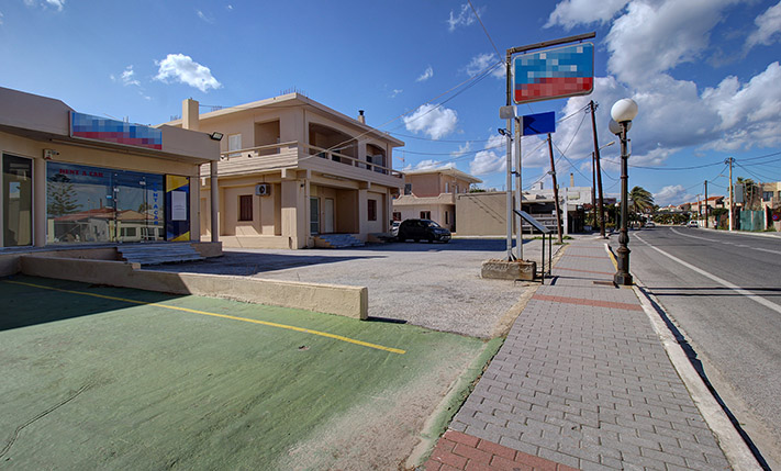 The property has frontage on Mikis Theodorakis Avenue (old highway to Chania-Kissamos). It is situated in a location with high commercial interest and therefore constitutes a good investment. It is a building of two identical adjacent ground-floor shops of 60 m² each. Each of them is independent with its own yard and parking space on the frontage. The plot is spacious and its largest part is located behind the building. It has an alternative frontage on an asphalt road and can also be used separately. The plot has remaining buildable area that allows you to expand the existing building or add additional buildings at the back.
