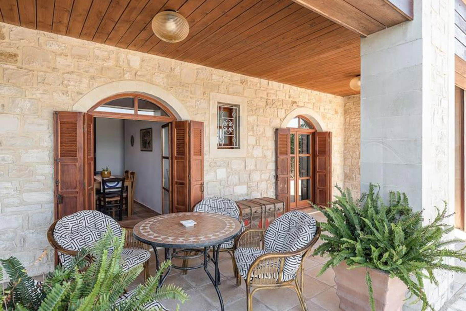 The main entrance is on the immediately upper floor, which is largely open-plan in a "Π" shape, with spaces divided conceptually by traditional stone arches. The kitchen features plenty of cabinets, a large marble countertop, a large 10-seat dining table and all necessary modern appliances. In the living room, a large stone fireplace with impressive carved detailing takes center stage. Along the northern façade of the house, large French doors lead to a spacious covered veranda with views of the lush surrounding area. The upper and final floor has been divided into two luxurious bedrooms, each with a walk-in closet and its own ensuite bathroom. They both share large balconies, as well as a spacious sitting and library area.