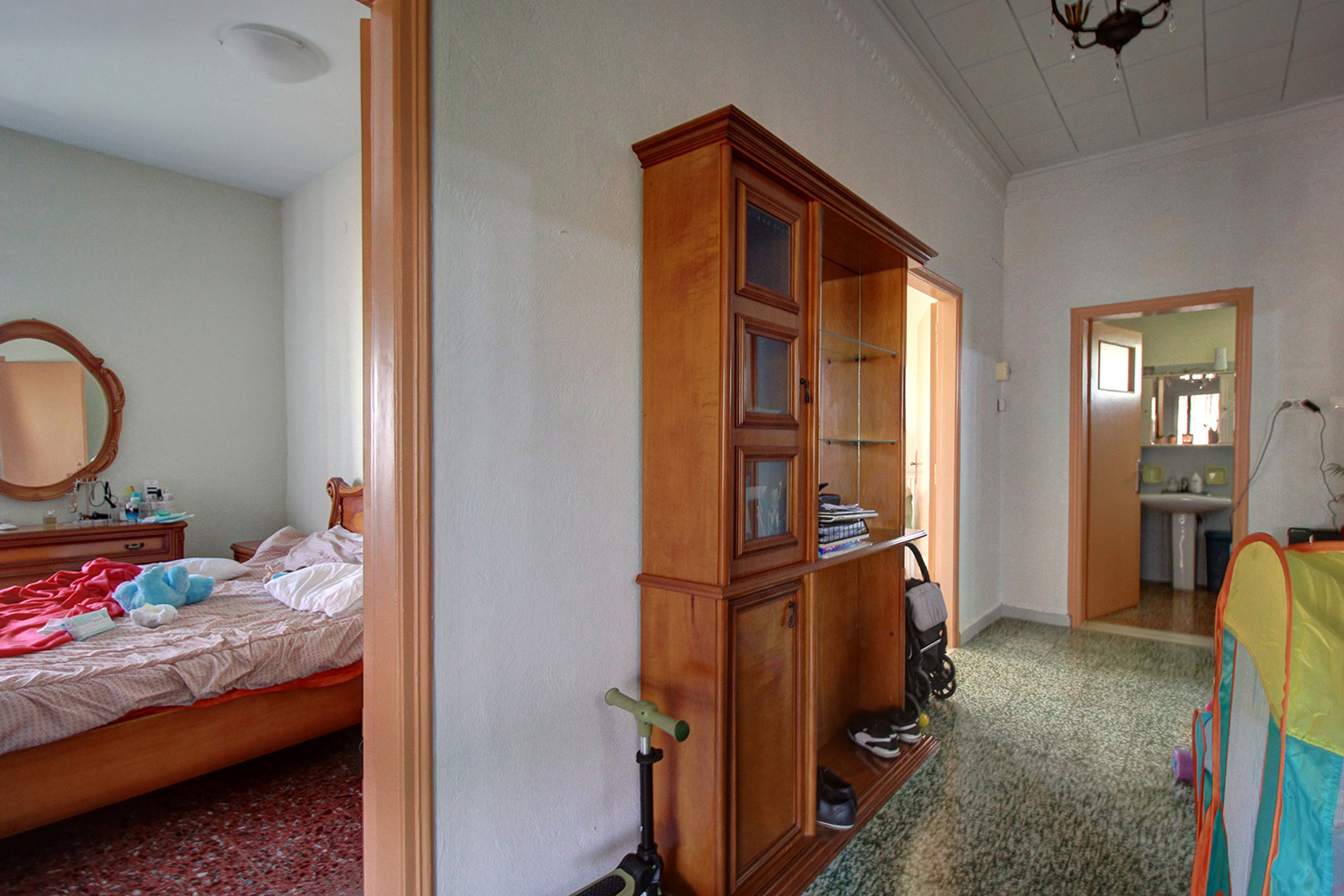 The house is a good choice, given its features and the layout can be changed in many ways, if you want to configure it according to your needs. The main entrance is currently on the north side through a large covered terrace and opens onto a wide central hallway. From here, there is direct access to the living room, the kitchen in another room, the bathroom of the house as well as the largest of the bedrooms. There is access through the living room to a two-roomed part of the house of approximately 30 m², which currently houses the second bedroom but can be divided into two parts for any use according to your taste.