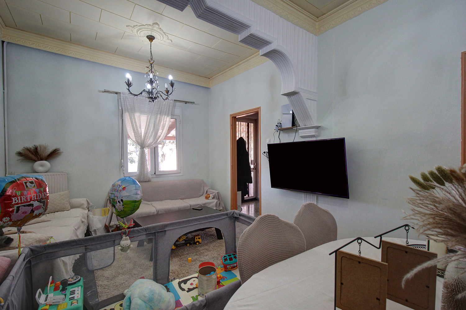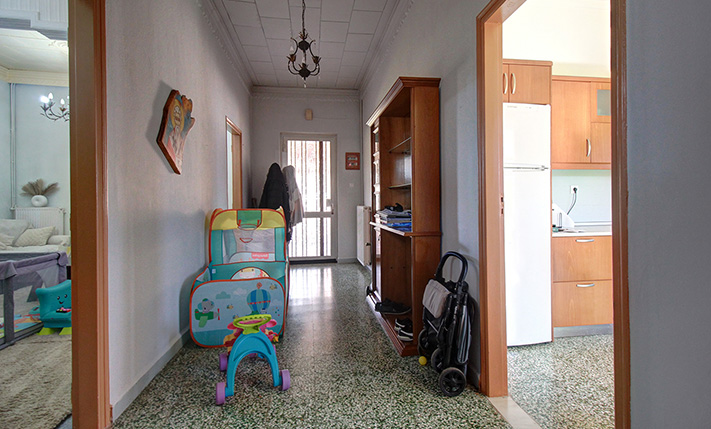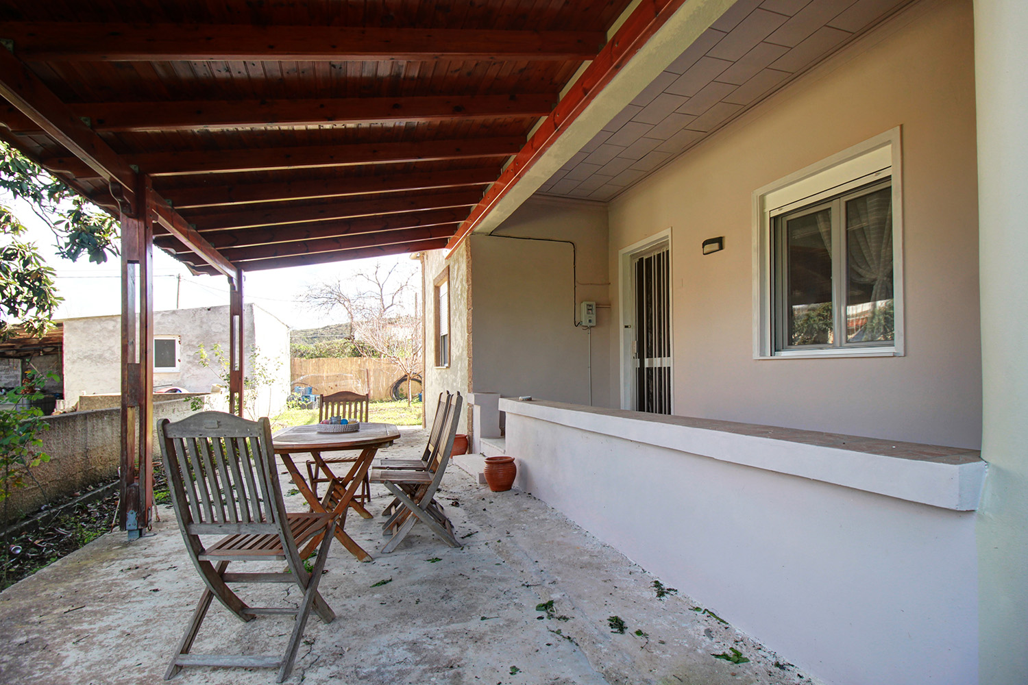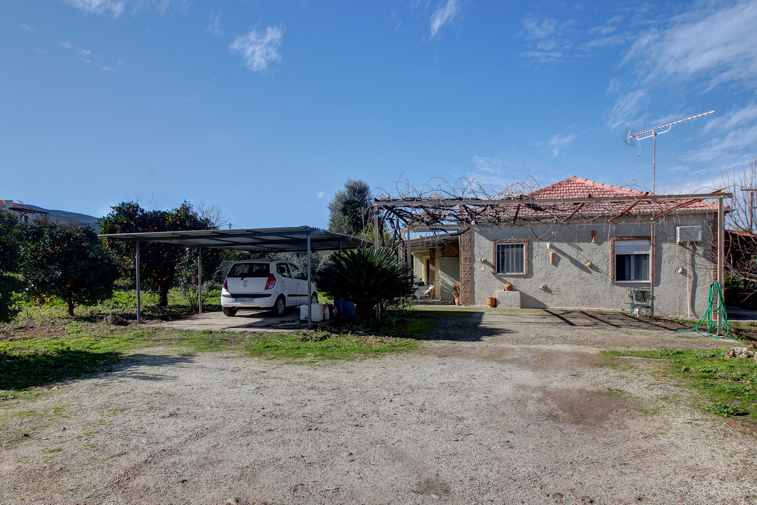 The plot has a good, rectangular shape and frontage along its eastern side. It has enough remaining buildable area so that additional rooms can be added to the existing building. The location of the building allows you to separate it and build one or two additional completely independent houses. At the moment a large parking space with a courtyard has been created in front of the house. In the remaining part we find 10 fruit trees, an external storehouse of 2 m², a shed where you can park a car while there is also a bare part in case you want to construct a large garden or even a swimming pool. From the south side you can see the ridge of the White Mountains while the views will be excellent if you add an upper floor.