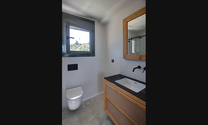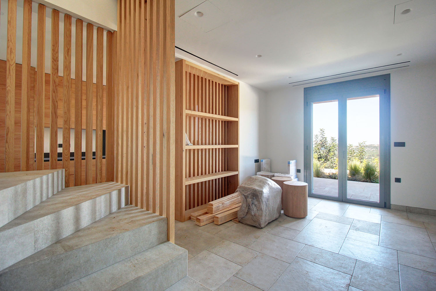 The plot is fenced while between the two residences there is planting and therefore good privacy. In the use of this residence there are ample parking space, a beautiful private small forest with big cypresses, a landscaped garden and large courtyards. The natural ground has a north slope while the building has been elevated with high walls from the sea side in order to offer impressive views of the verdant surrounding area and down to the sea. The plot directly in front is also classified as forest, which ensures unobstructed views in the future.
