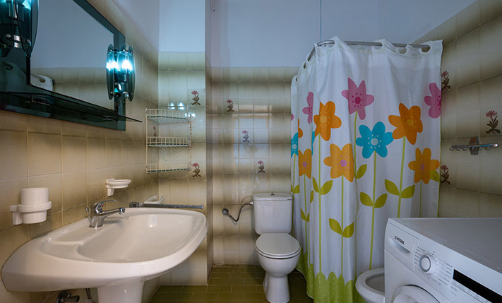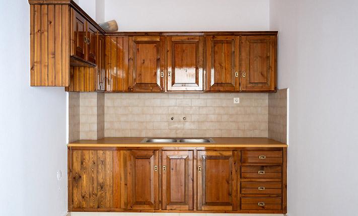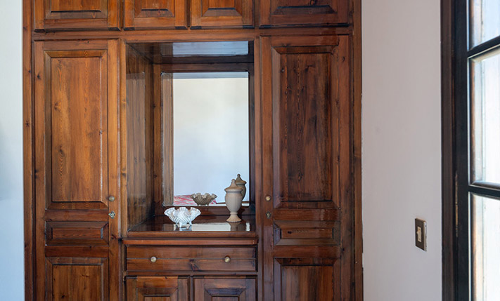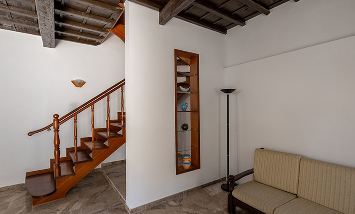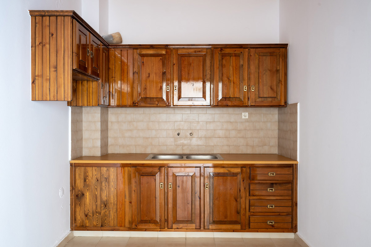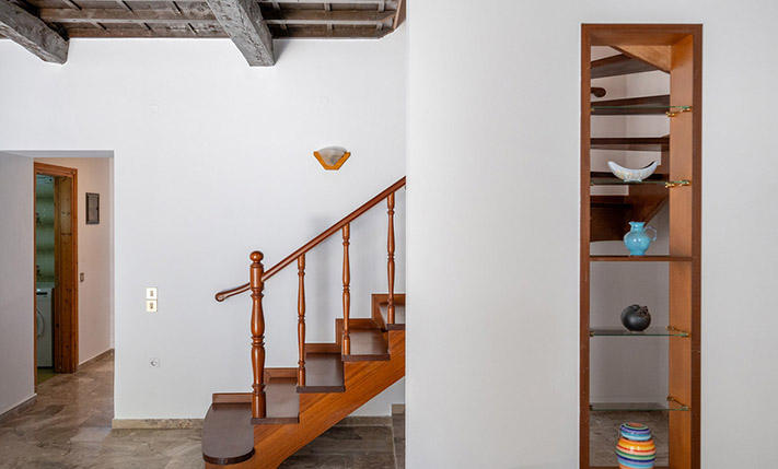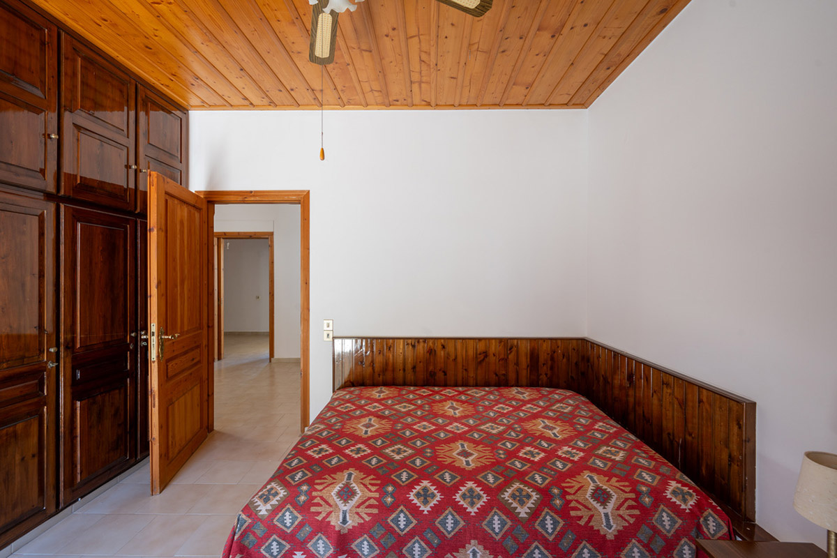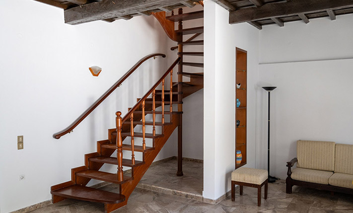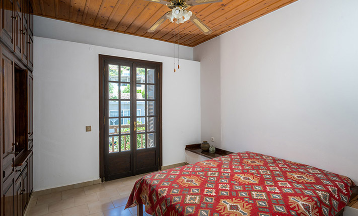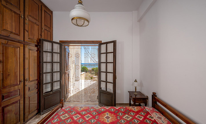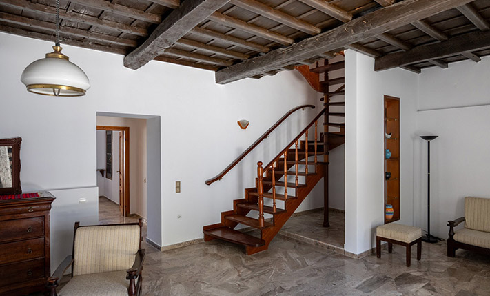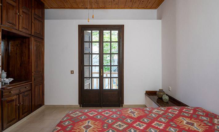 Due to the commercial interest of the area on the south side, the main entrance was designed with an arch and with a width that allows any possible commercial use. Currently, inside we find the living room while at the back are the kitchen as well as a bedroom that face the sea. On the ground floor there is also a bathroom. The layout is such that the building can be divided into two apartments or have mixed use with a commercial store below. A wooden staircase leads to the upper floor, which has a full kitchen, ideal with the existing layout for preparing breakfast. Upstairs, we find three bedrooms, the main one of which is large enough in order to accommodate a living area and dining space. The building is versatile and has a smart design. It is characterized by the large bright spaces that were common in that era and today allow you to have an impressive and luxurious result, if you renovate the property.