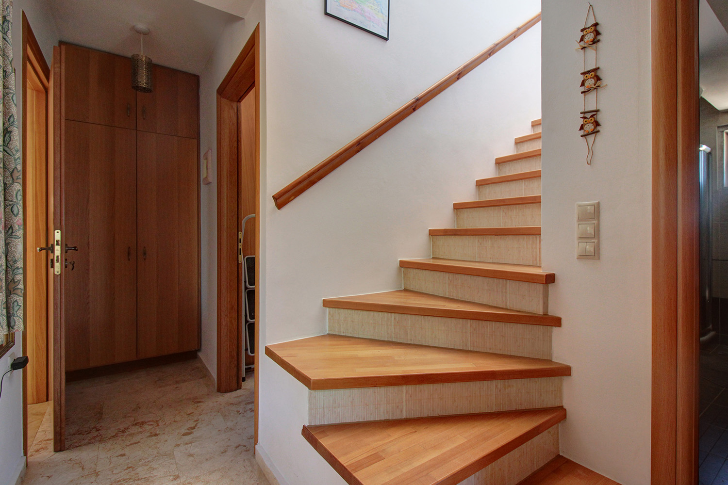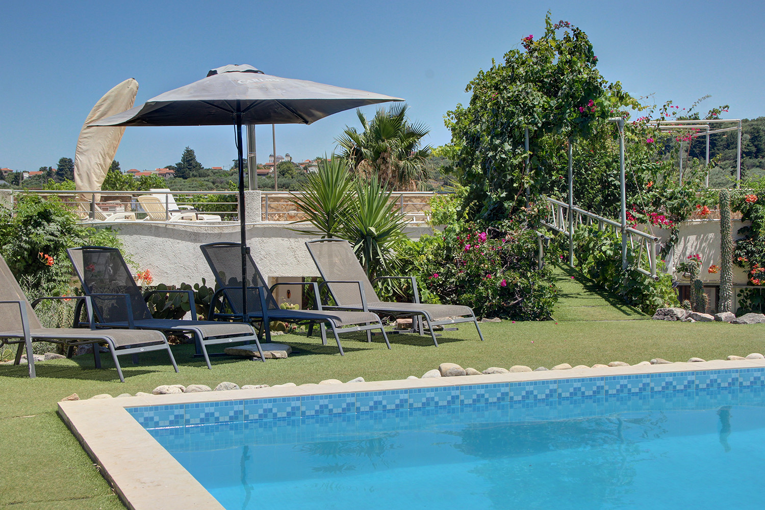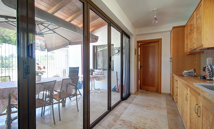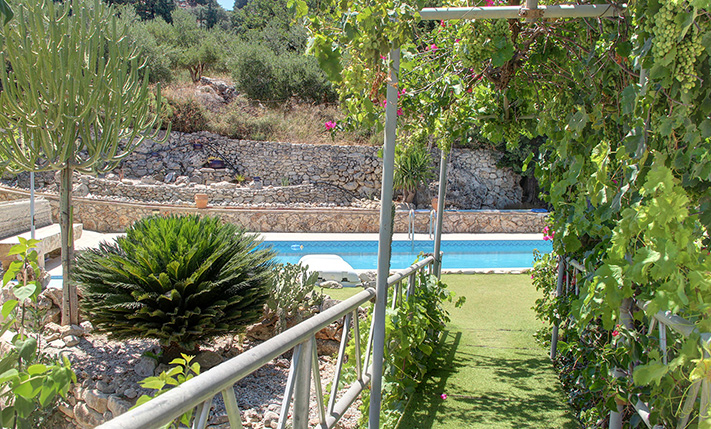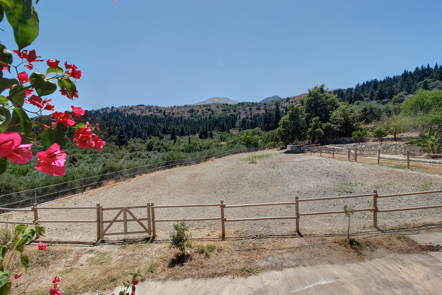The road leading to the property ends in a dead end and sees very little traffic. At the entrance to the plot there is a metal gate, and the entire property is fenced, allowing you, among other things, to contain your pets. Large courtyards have been constructed at the front of the building where you can park several vehicles, and there is also a designated shaded 3-spots parking area. In front of each residence, a themed garden has been created, which continues around to the back façade and leads to the pool area. The pool has a spacious sunbathing area and offers complete privacy. Around the building you will find, among other things, dry-stone terraces with themed gardens, a vegetable garden, a metal greenhouse for winter cultivation, well-organized spaces for domestic animals, as well as an idyllic small woodland. There is also an open area currently used for horses, which you can convert into an olive grove to produce your family’s own olive oil.