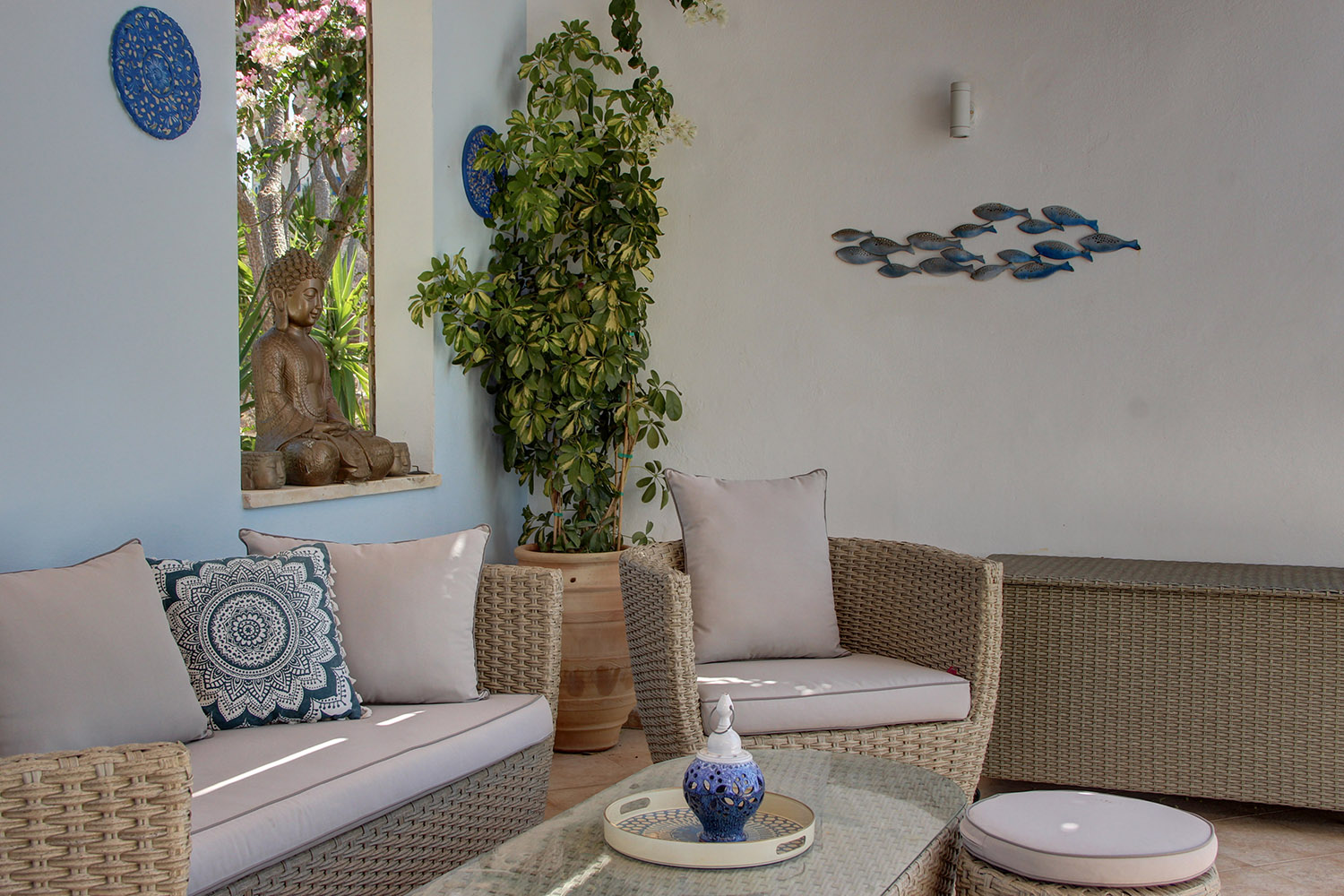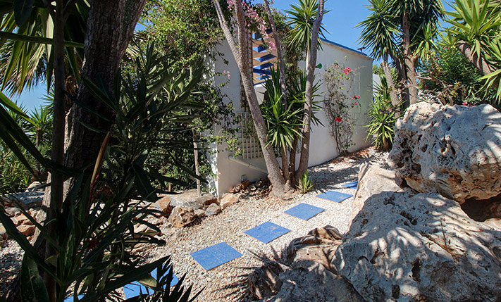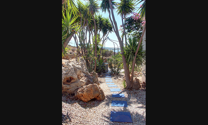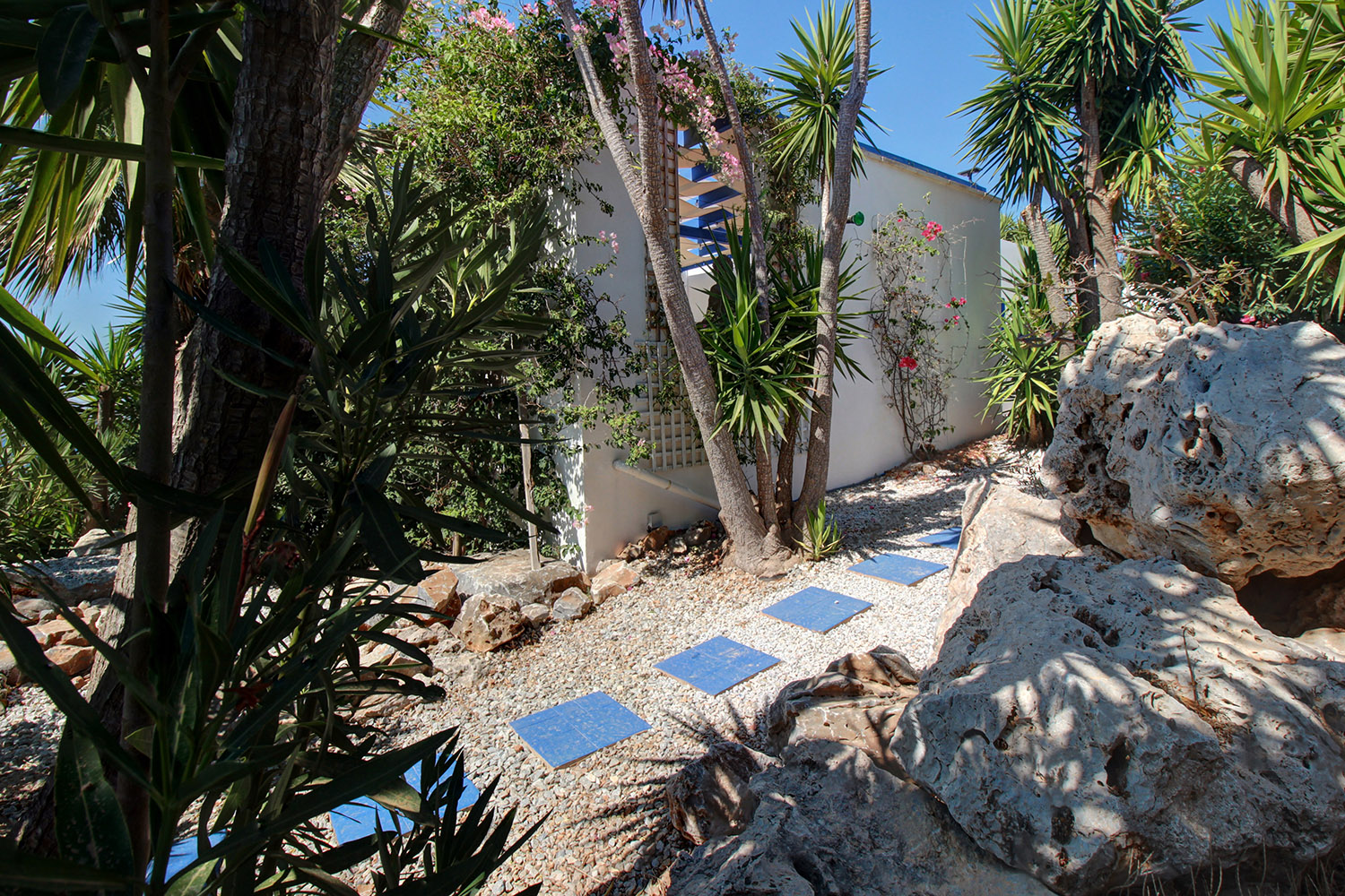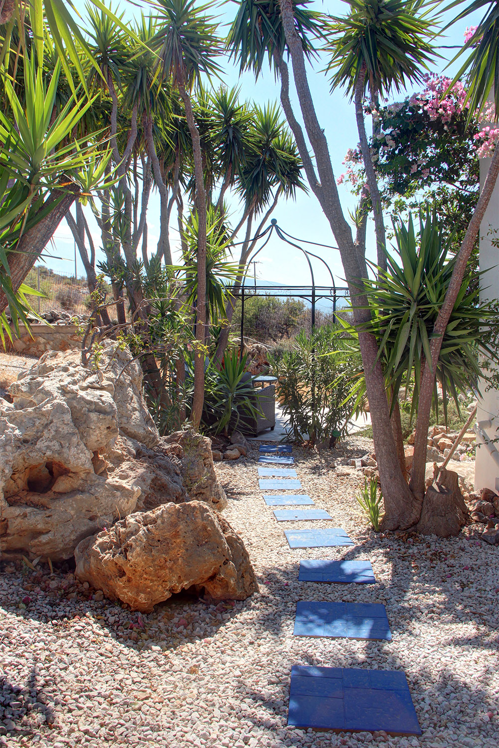 The house enjoys exclusive use of 1,421 m² of beautifully landscaped grounds, featuring mature gardens, courtyards, and countless spots where one can relax in the shade or under the warm summer sun—all in complete privacy. The complex is fully fenced, with access through a remote-controlled metal gate. The house also has a second, private entrance, allowing for full separation from the shared areas. Both the house and its exterior spaces follow the natural slope of the terrain, offering uninterrupted views of the sea and, in the distance, the White Mountains. The garden is covered with gravel for easy maintenance, equipped with an automatic irrigation system and ambient night lighting.