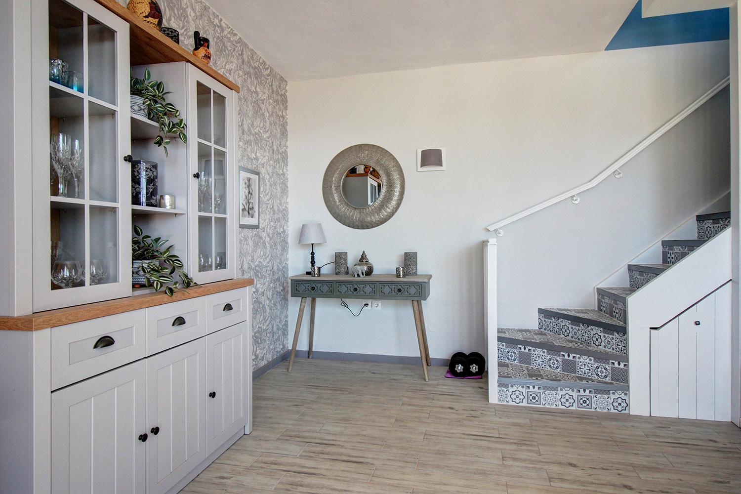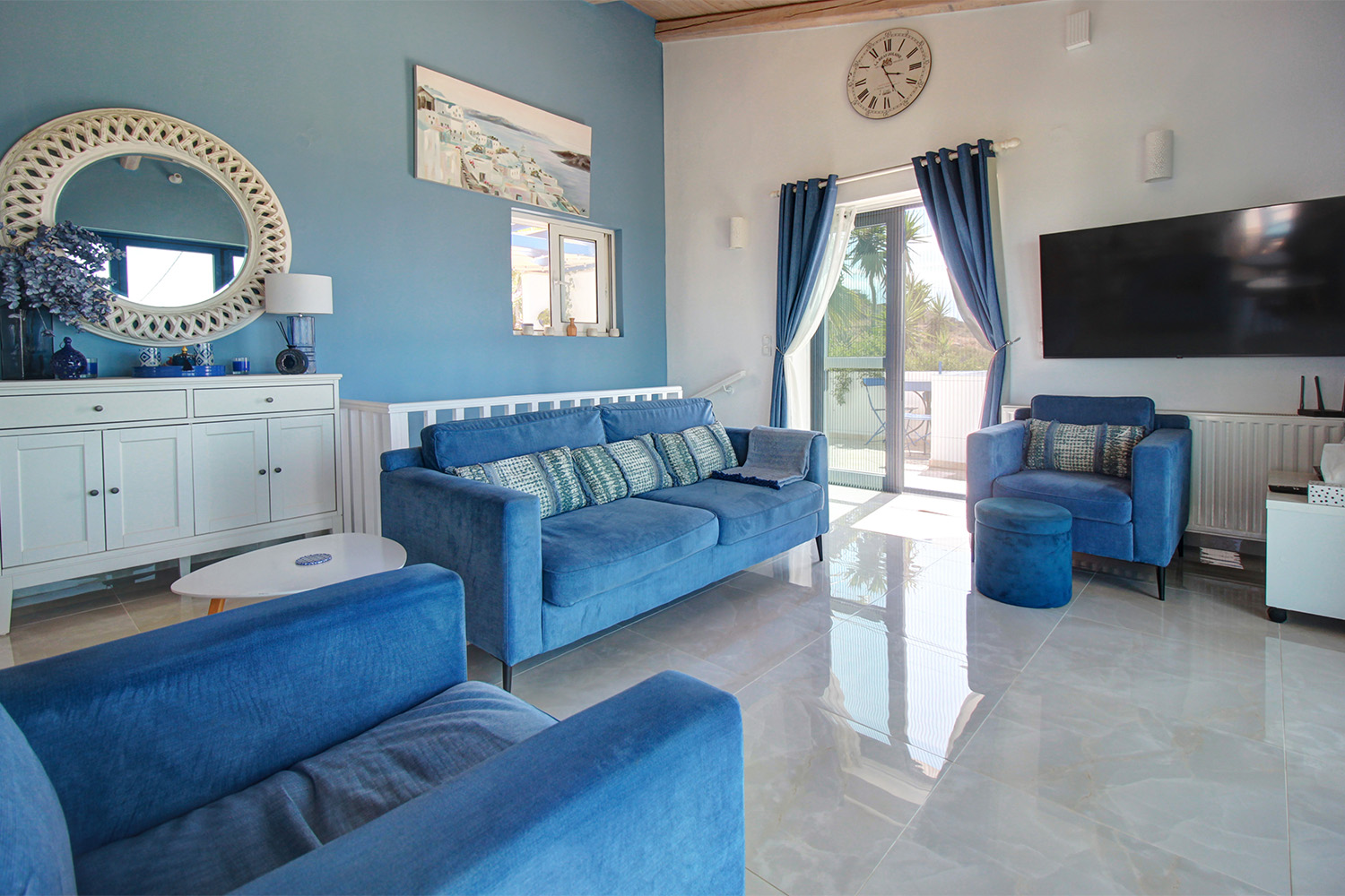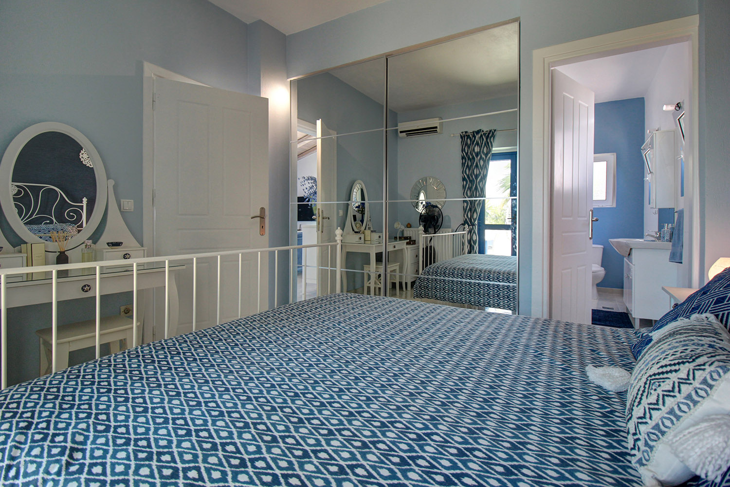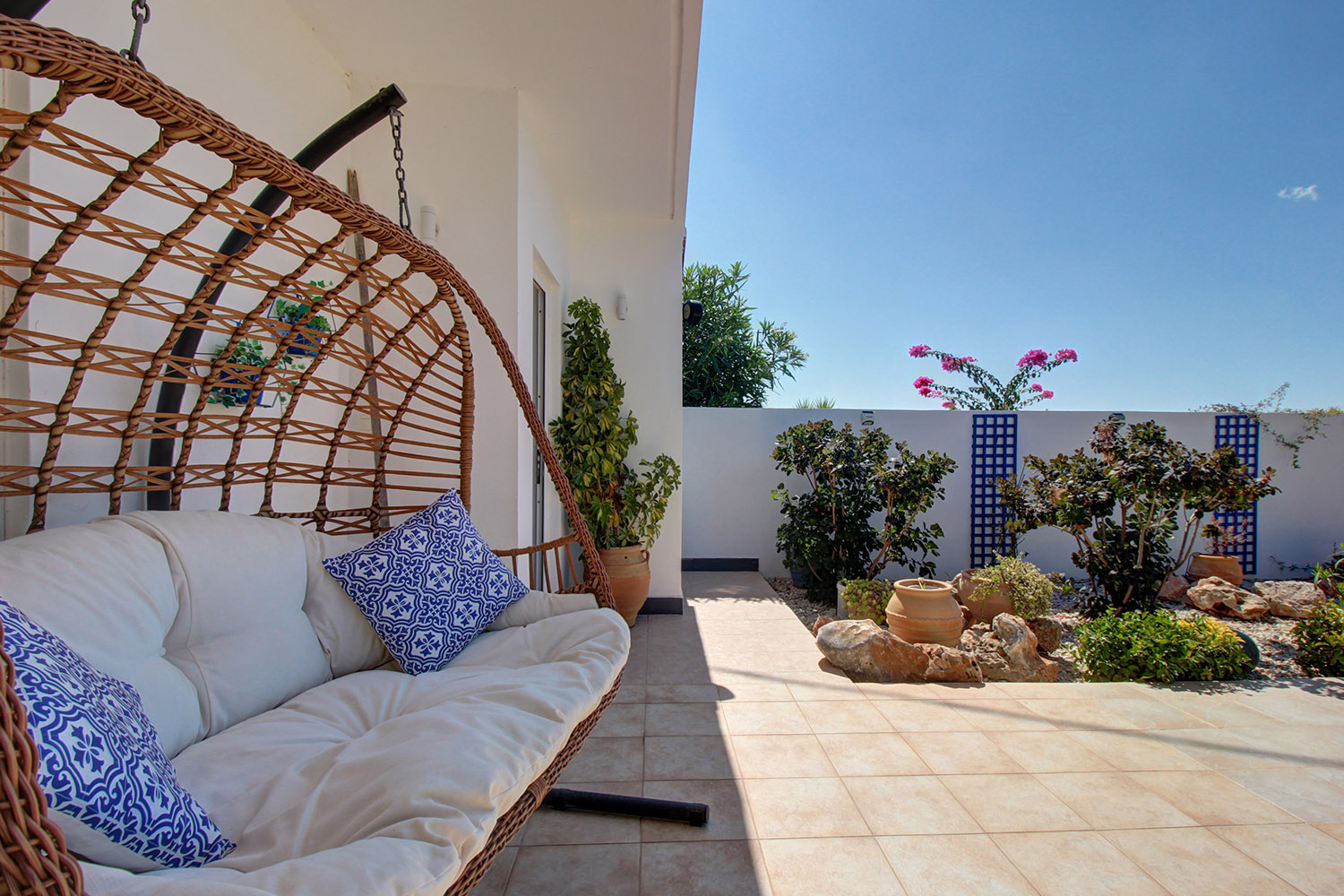The house enjoys exclusive use of 1,421 m² of beautifully landscaped grounds, featuring mature gardens, courtyards, and countless spots where one can relax in the shade or under the warm summer sun—all in complete privacy. The complex is fully fenced, with access through a remote-controlled metal gate. The house also has a second, private entrance, allowing for full separation from the shared areas. Both the house and its exterior spaces follow the natural slope of the terrain, offering uninterrupted views of the sea and, in the distance, the White Mountains. The garden is covered with gravel for easy maintenance, equipped with an automatic irrigation system and ambient night lighting.