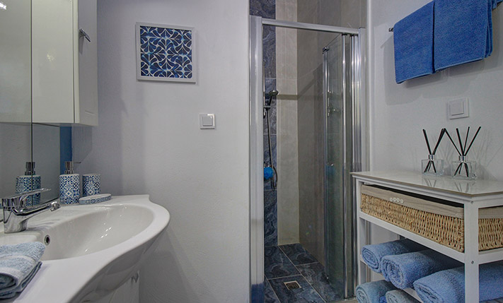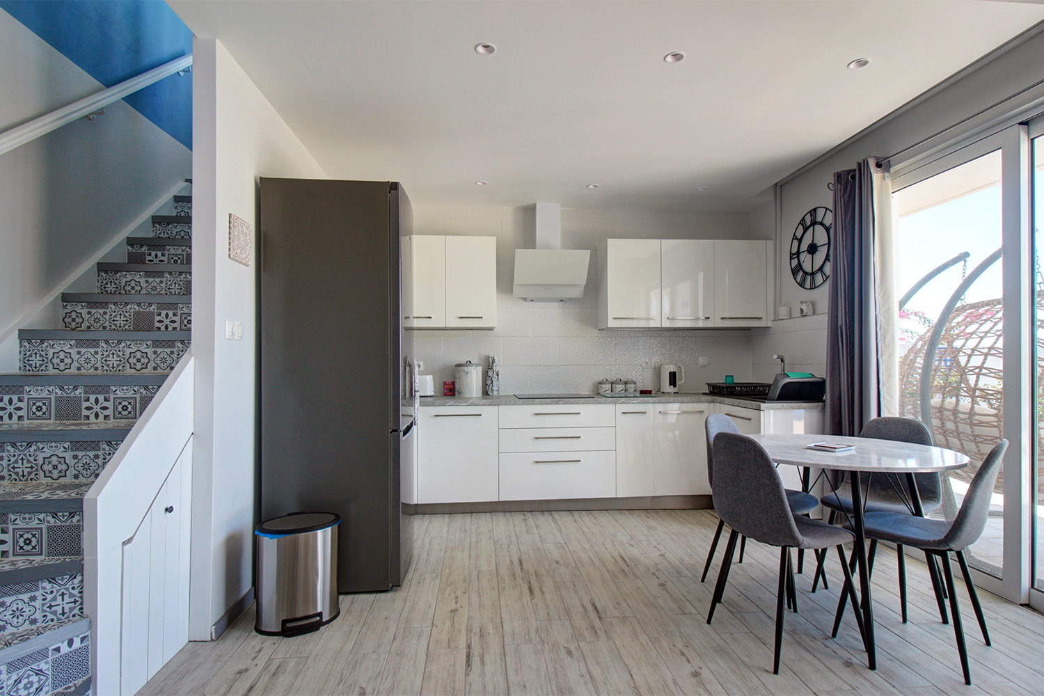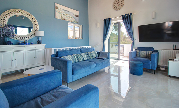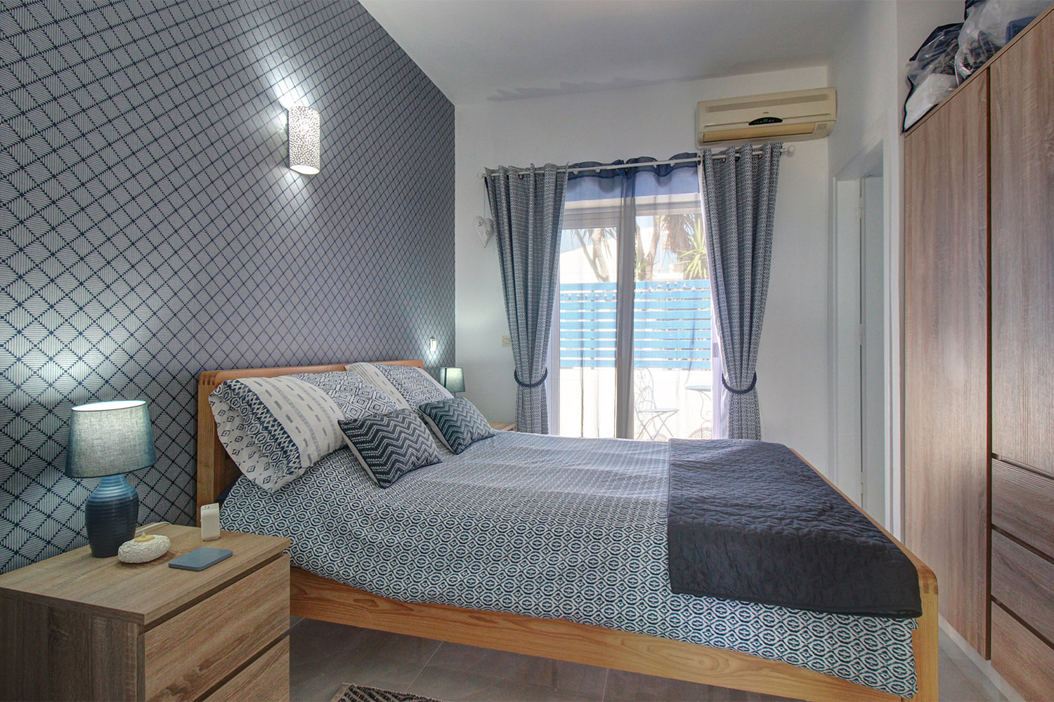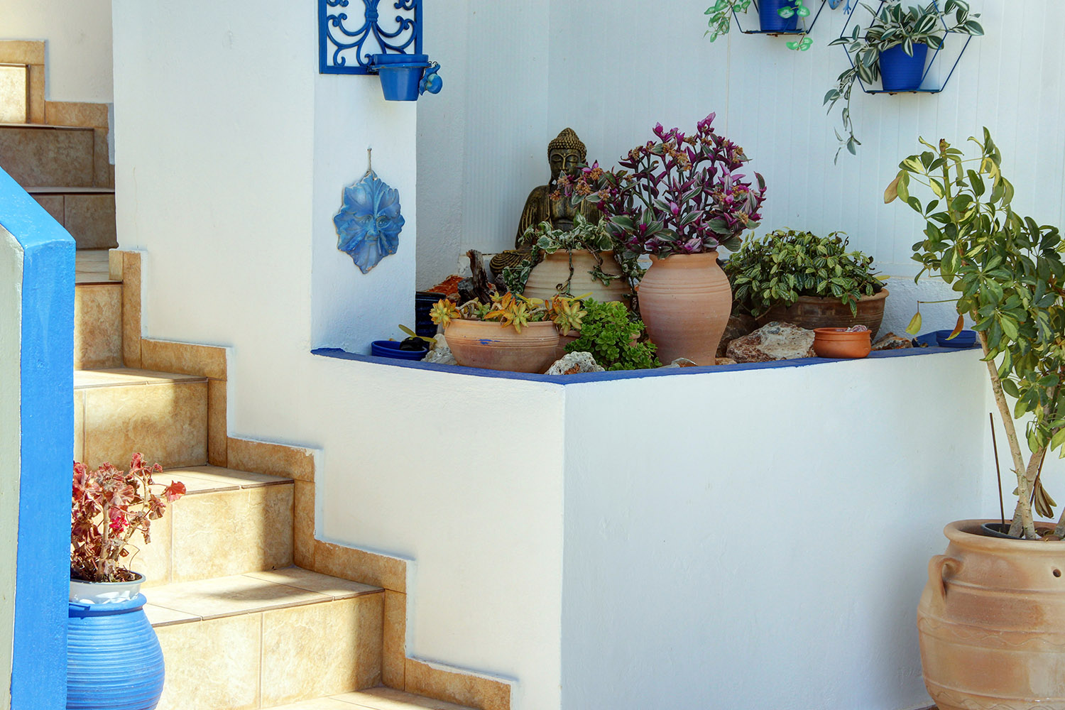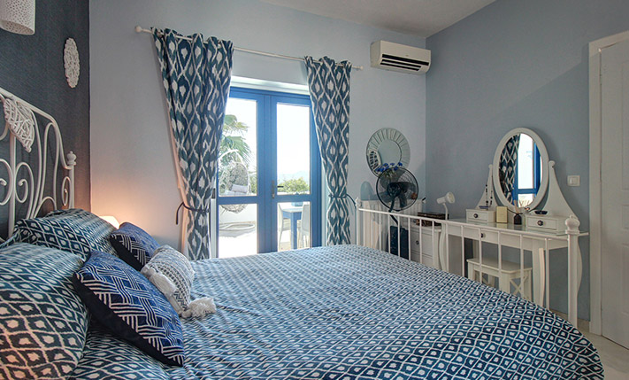 The house enjoys exclusive use of 1,421 m² of beautifully landscaped grounds, featuring mature gardens, courtyards, and countless spots where one can relax in the shade or under the warm summer sun—all in complete privacy. The complex is fully fenced, with access through a remote-controlled metal gate. The house also has a second, private entrance, allowing for full separation from the shared areas. Both the house and its exterior spaces follow the natural slope of the terrain, offering uninterrupted views of the sea and, in the distance, the White Mountains. The garden is covered with gravel for easy maintenance, equipped with an automatic irrigation system and ambient night lighting.
