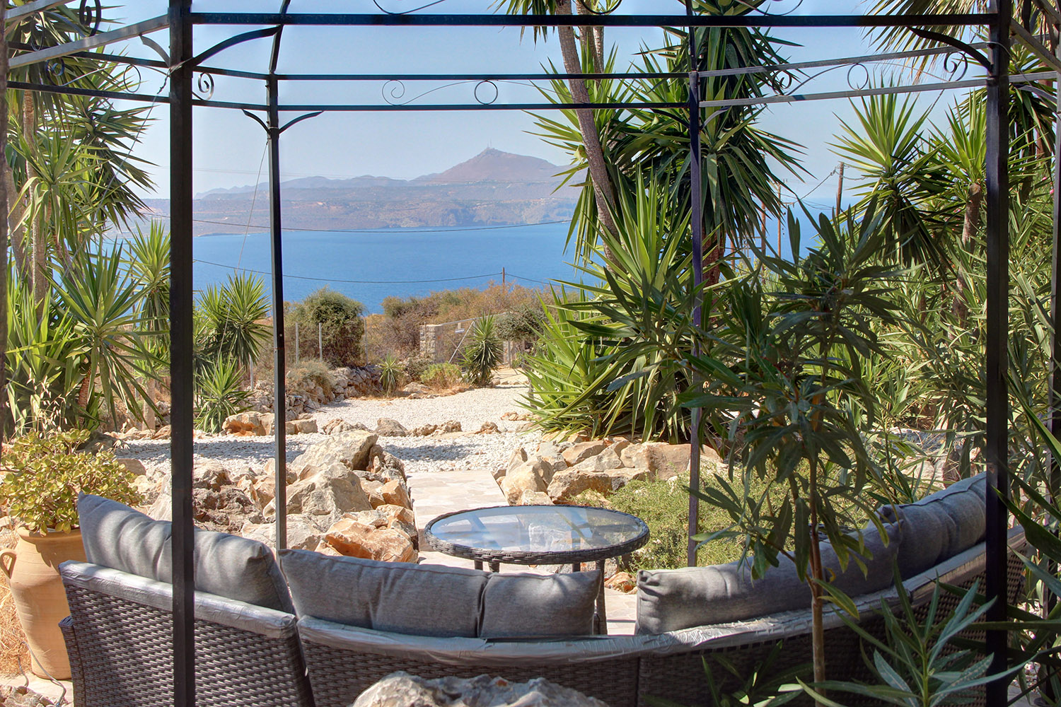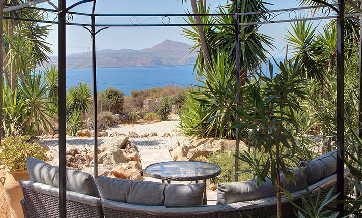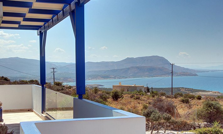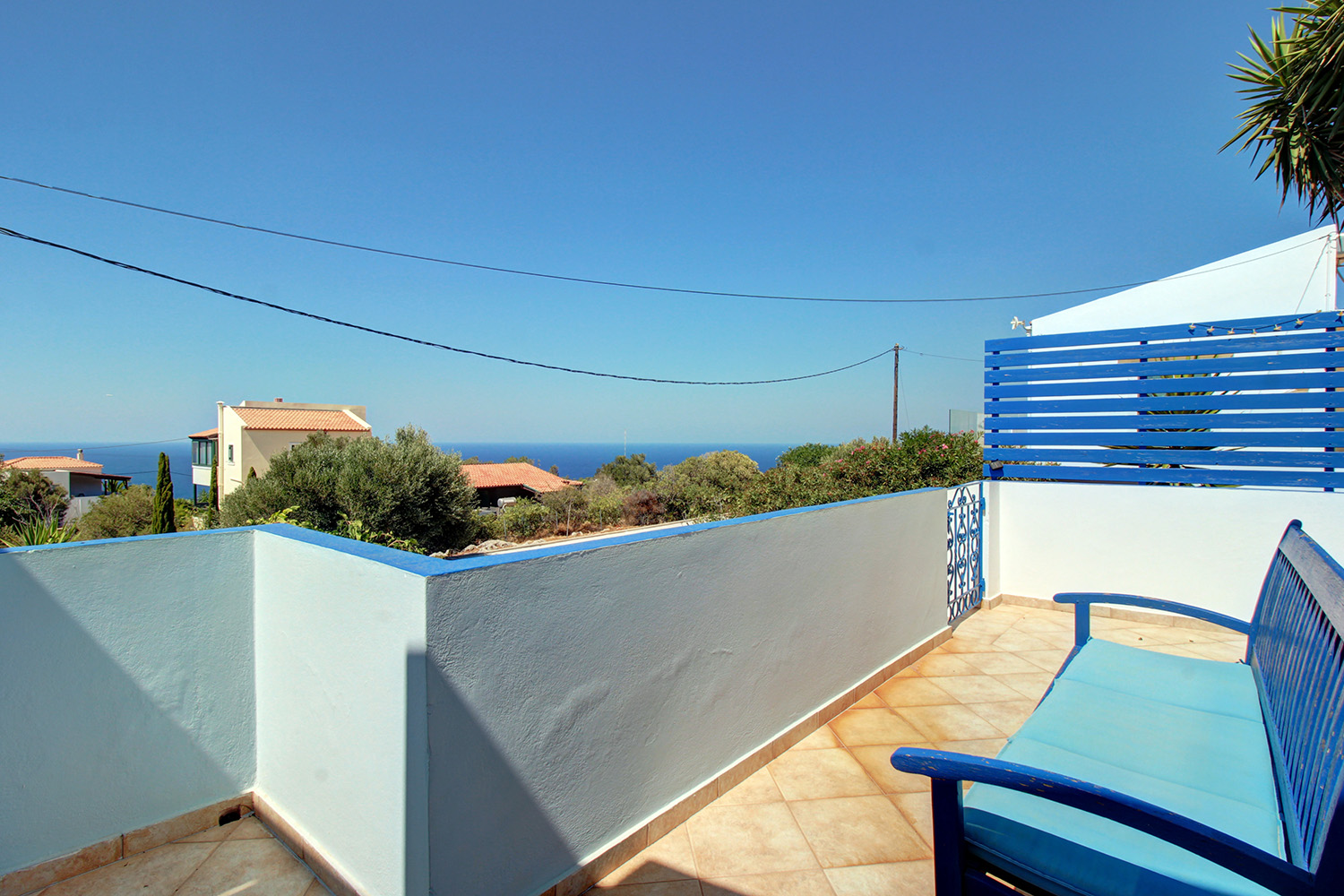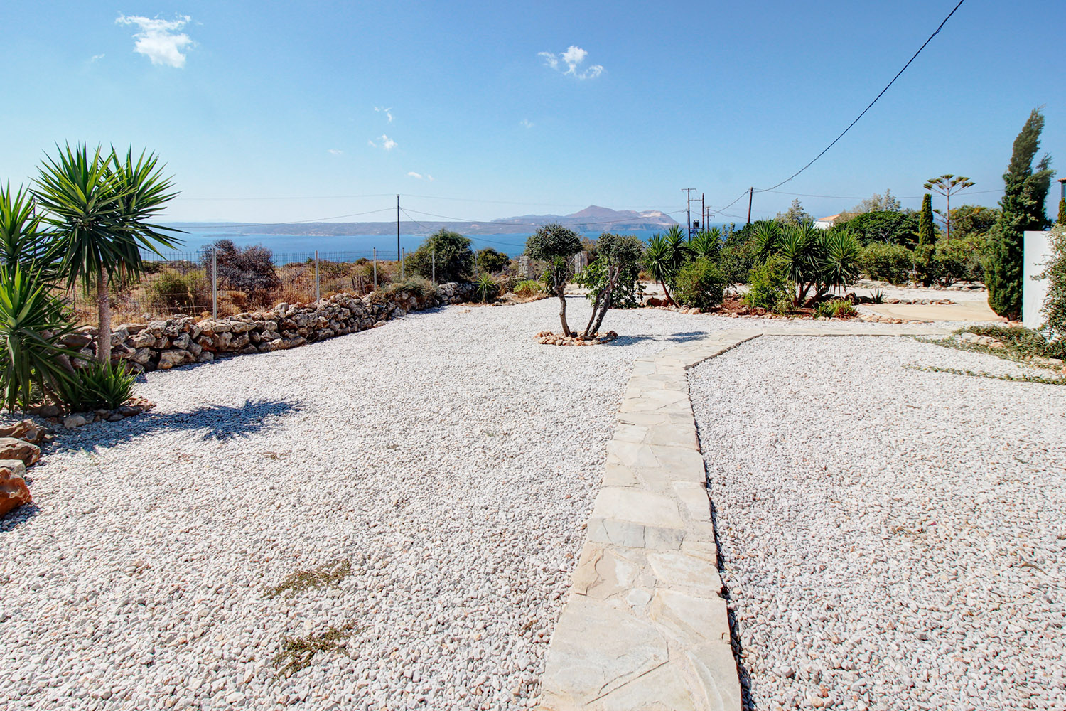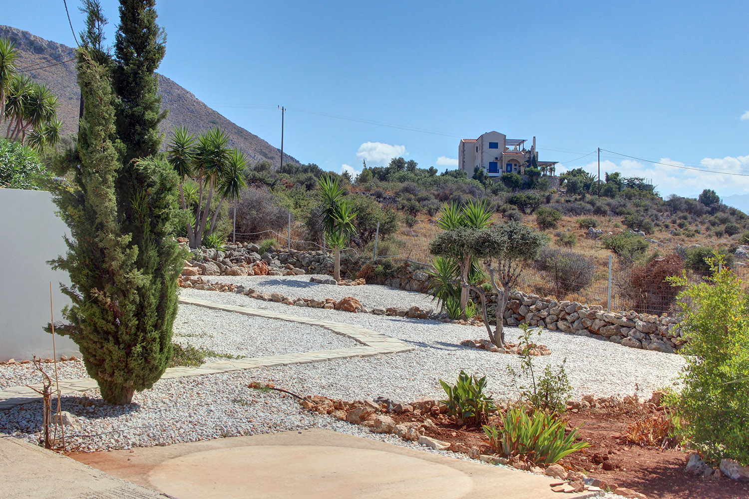 The property is located just outside the village of Kokkino Chorio, in the municipality of Apokoronas, to the east of the city of Chania. It is a luxurious detached residence, built on a hillside with unobstructed views of the sea and overlooking the Bay of Souda. The home belongs to a complex of three residences, each of which has a large plot for exclusive use, while they share only a single common entrance. This house and one of the others also share a 40 m² swimming pool with a spacious sunbathing area.