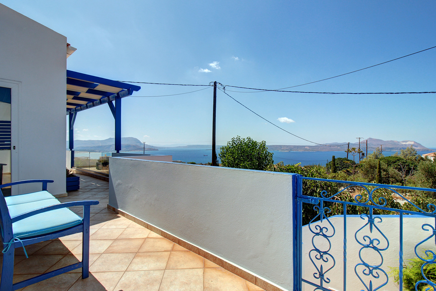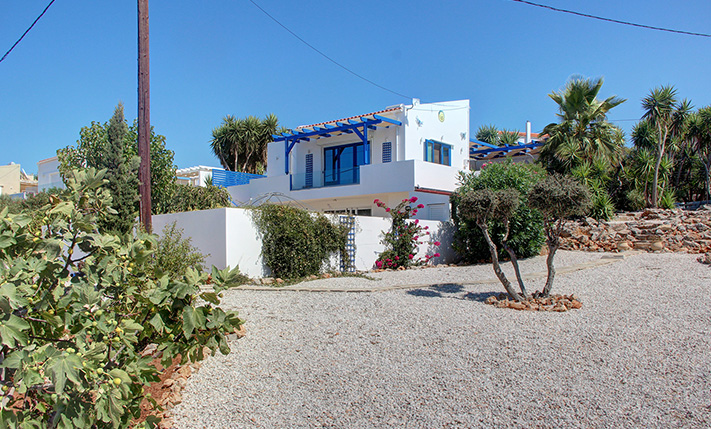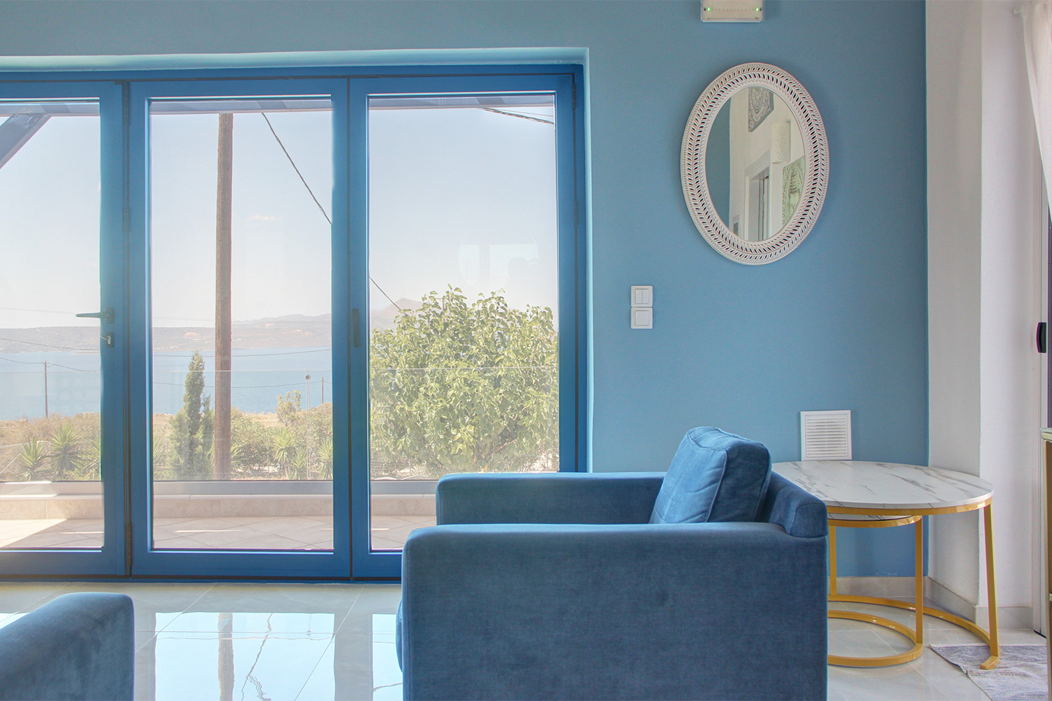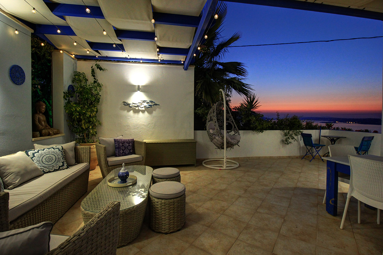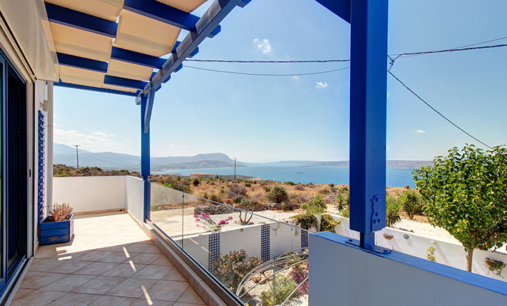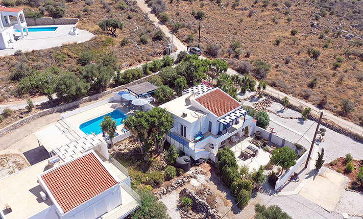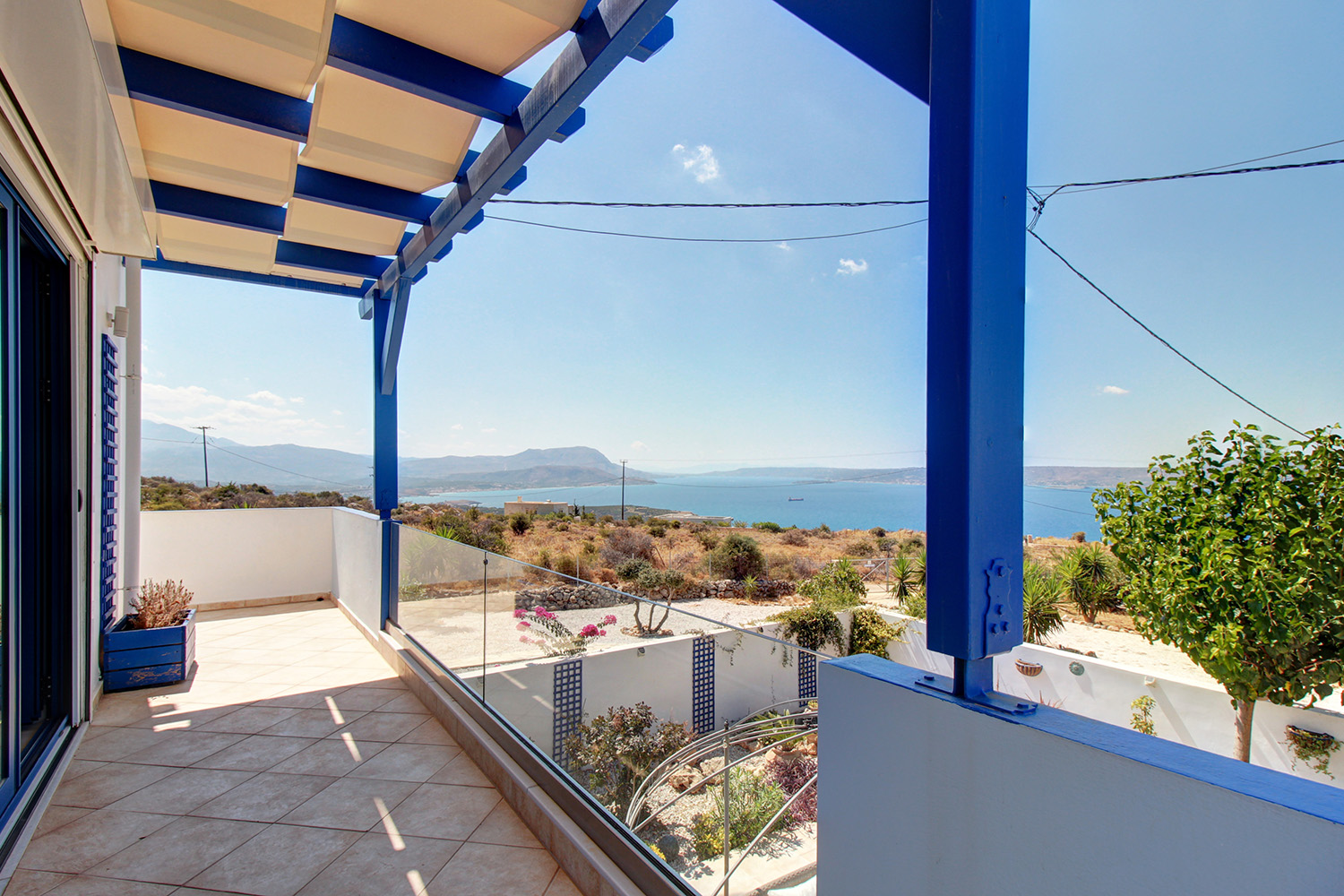 The property is located just outside the village of Kokkino Chorio, in the municipality of Apokoronas, to the east of the city of Chania. It is a luxurious detached residence, built on a hillside with unobstructed views of the sea and overlooking the Bay of Souda. The home belongs to a complex of three residences, each of which has a large plot for exclusive use, while they share only a single common entrance. This house and one of the others also share a 40 m² swimming pool with a spacious sunbathing area.