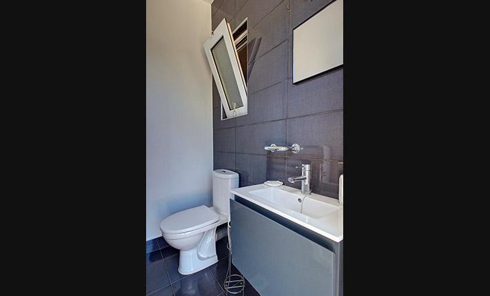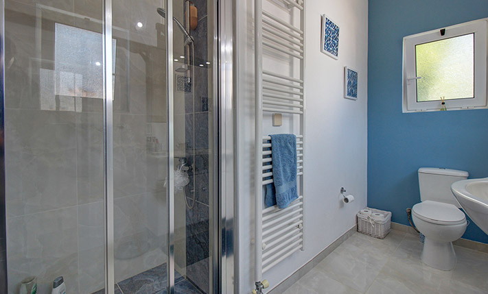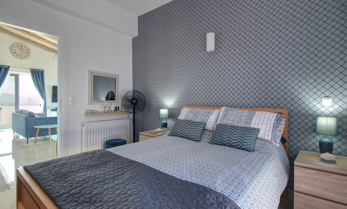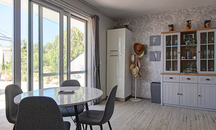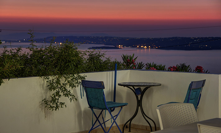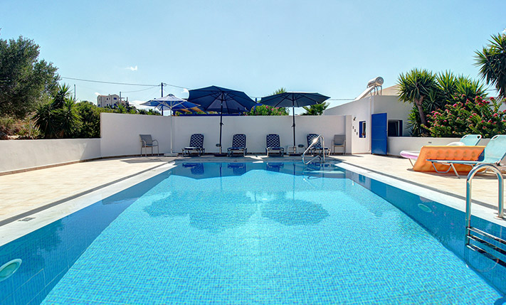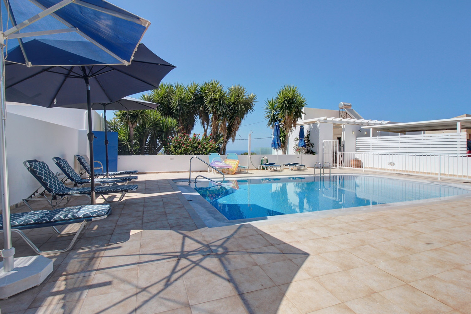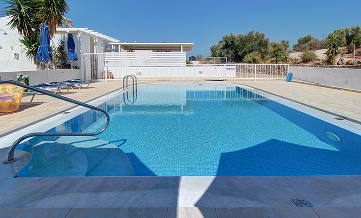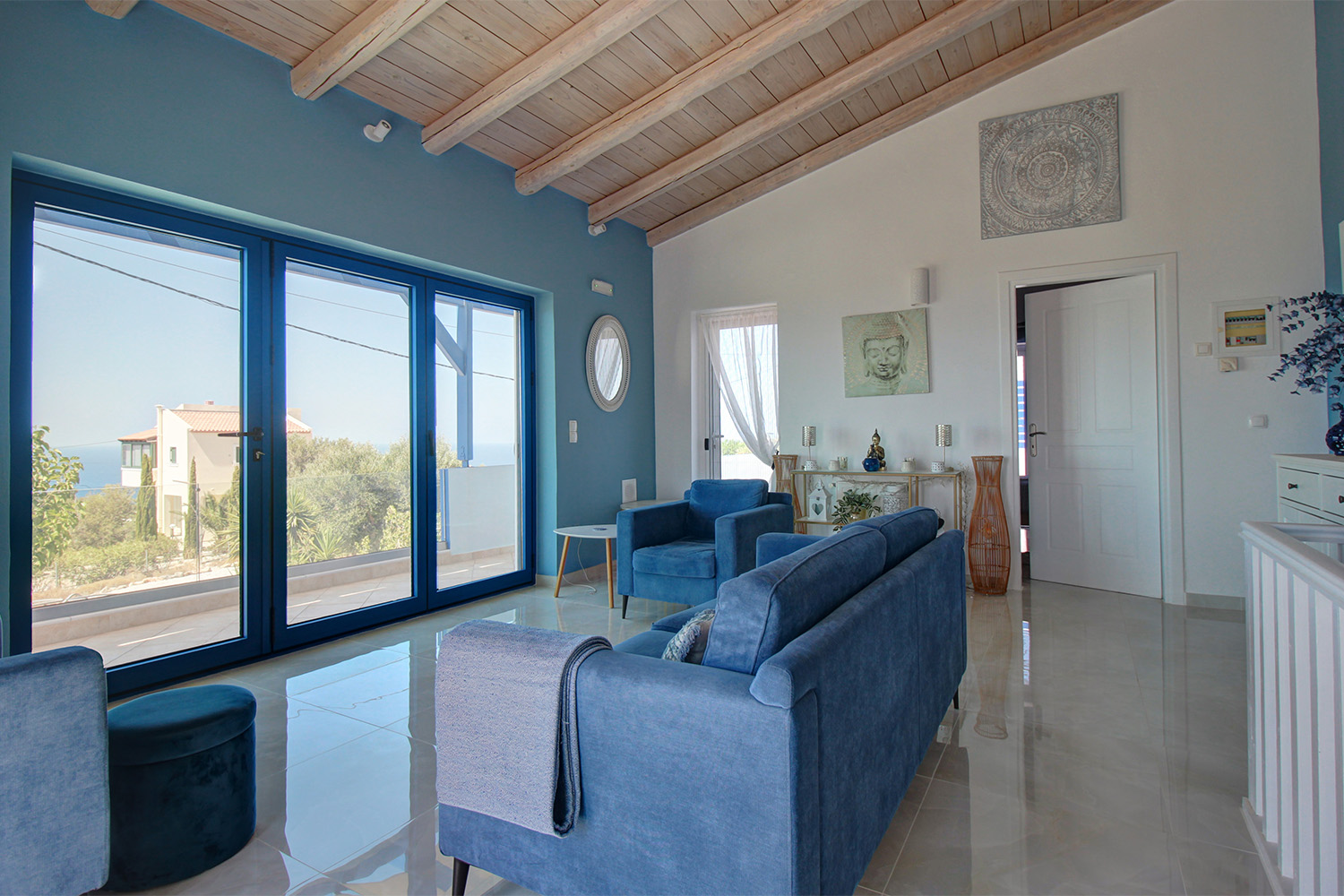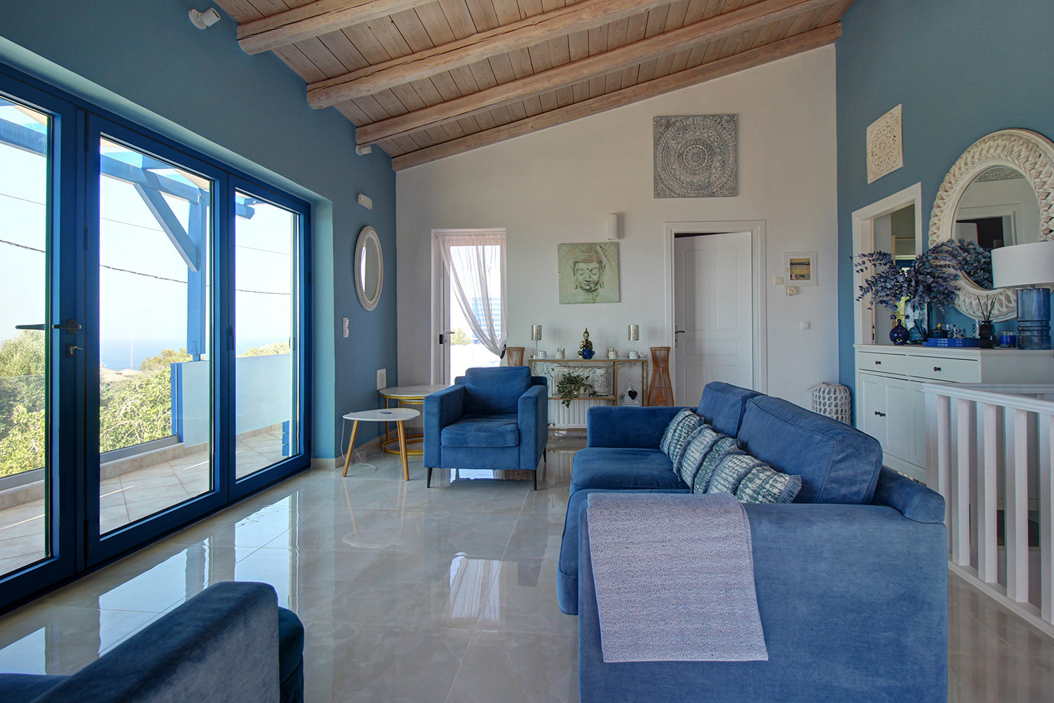 The property is located just outside the village of Kokkino Chorio, in the municipality of Apokoronas, to the east of the city of Chania. It is a luxurious detached residence, built on a hillside with unobstructed views of the sea and overlooking the Bay of Souda. The home belongs to a complex of three residences, each of which has a large plot for exclusive use, while they share only a single common entrance. This house and one of the others also share a 40 m² swimming pool with a spacious sunbathing area.