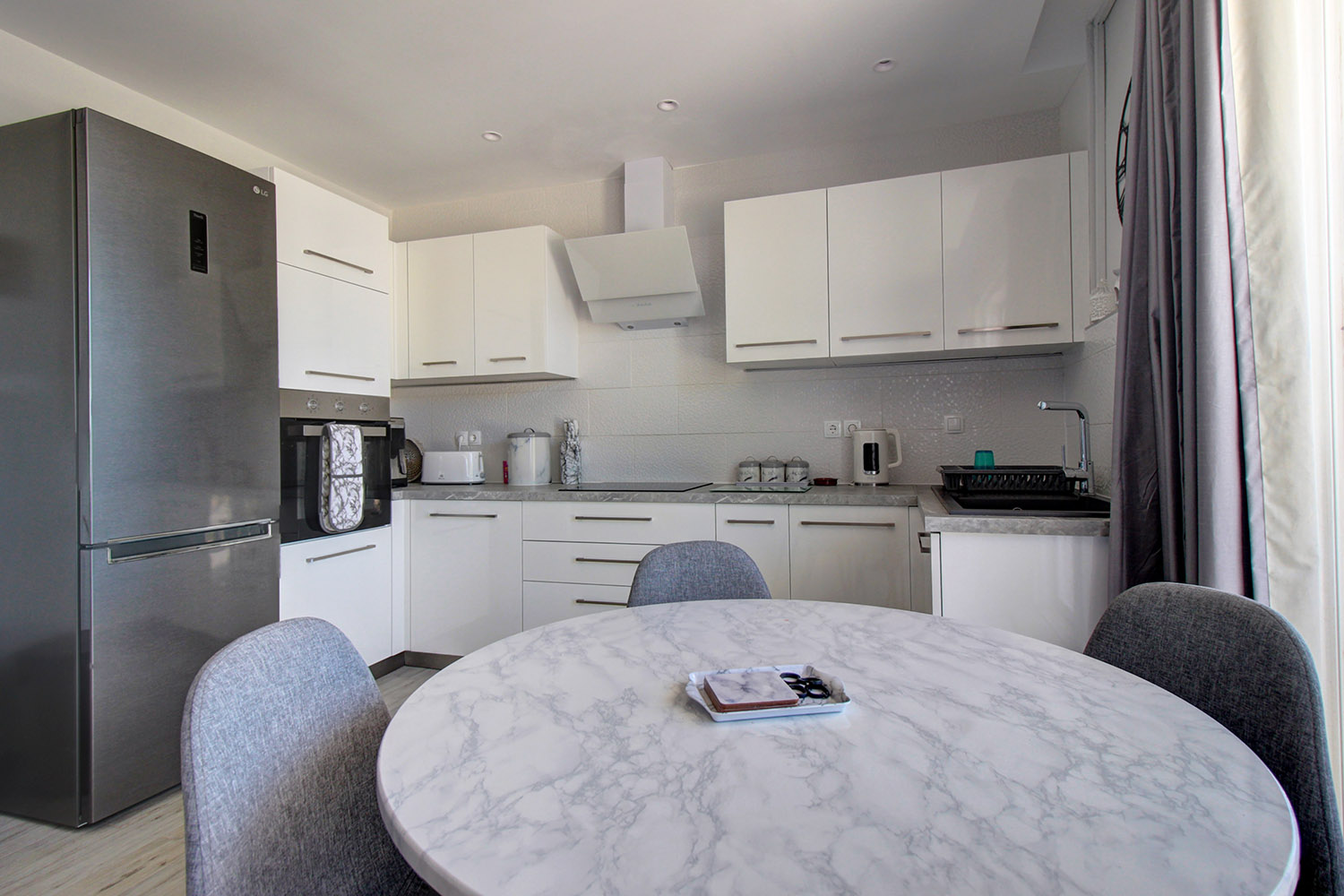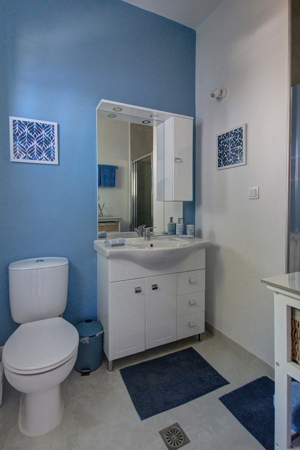 The residence is arranged over two levels, both of which—thanks to the sloped terrain—are effectively at ground level. The upper level serves as the main entrance, welcoming you into a spacious living room with high wooden ceilings and a sea-facing orientation. Toward the rear are two bedrooms with generous built-in wardrobes, each with its own en-suite bathroom. Along the façades of the upper floor are large balconies or courtyards, with a significant portion shaded by a pergola, making the space usable even during the hottest hours of the day. An internal staircase leads to the lower level, where the kitchen and dining area are located. The kitchen is modern in design, and the space is notably large and bright, with wide glass doors that open onto the garden. On this level, there is also an exterior guest WC and a storage room housing the boiler system.