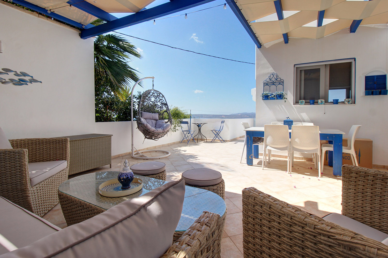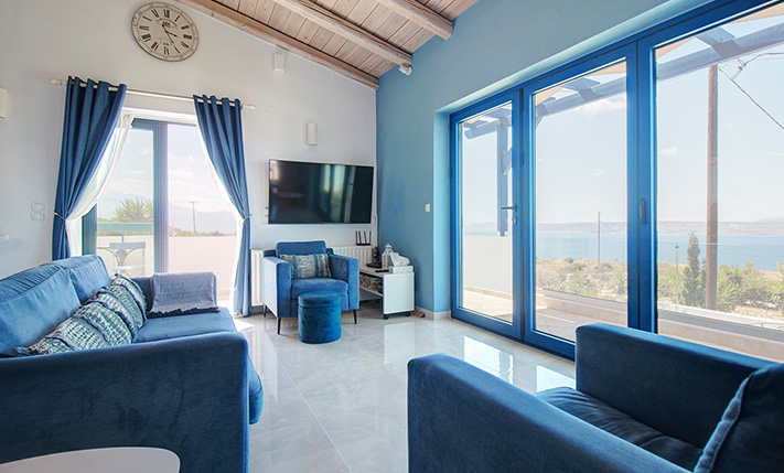 The home is practical and thoughtfully designed to maximize enjoyment of the sea view throughout daily life, with the sun setting on the horizon at the close of each day. The surrounding area consists mainly of holiday homes; however, this property is perfectly suitable for year-round living. Alternatively, should you choose to rent it out for tourism purposes, it offers the potential for significant annual income. The house features central heating with radiators and an oil-fired boiler, a solar water heater, and aluminum doors and windows with screens and double glazing.