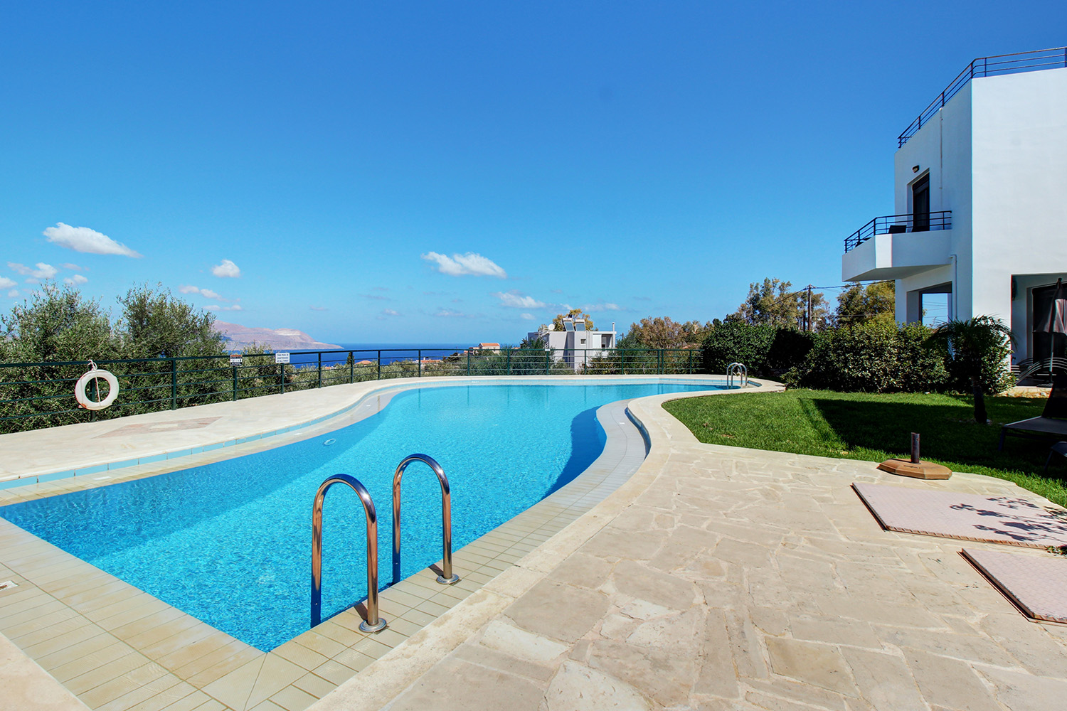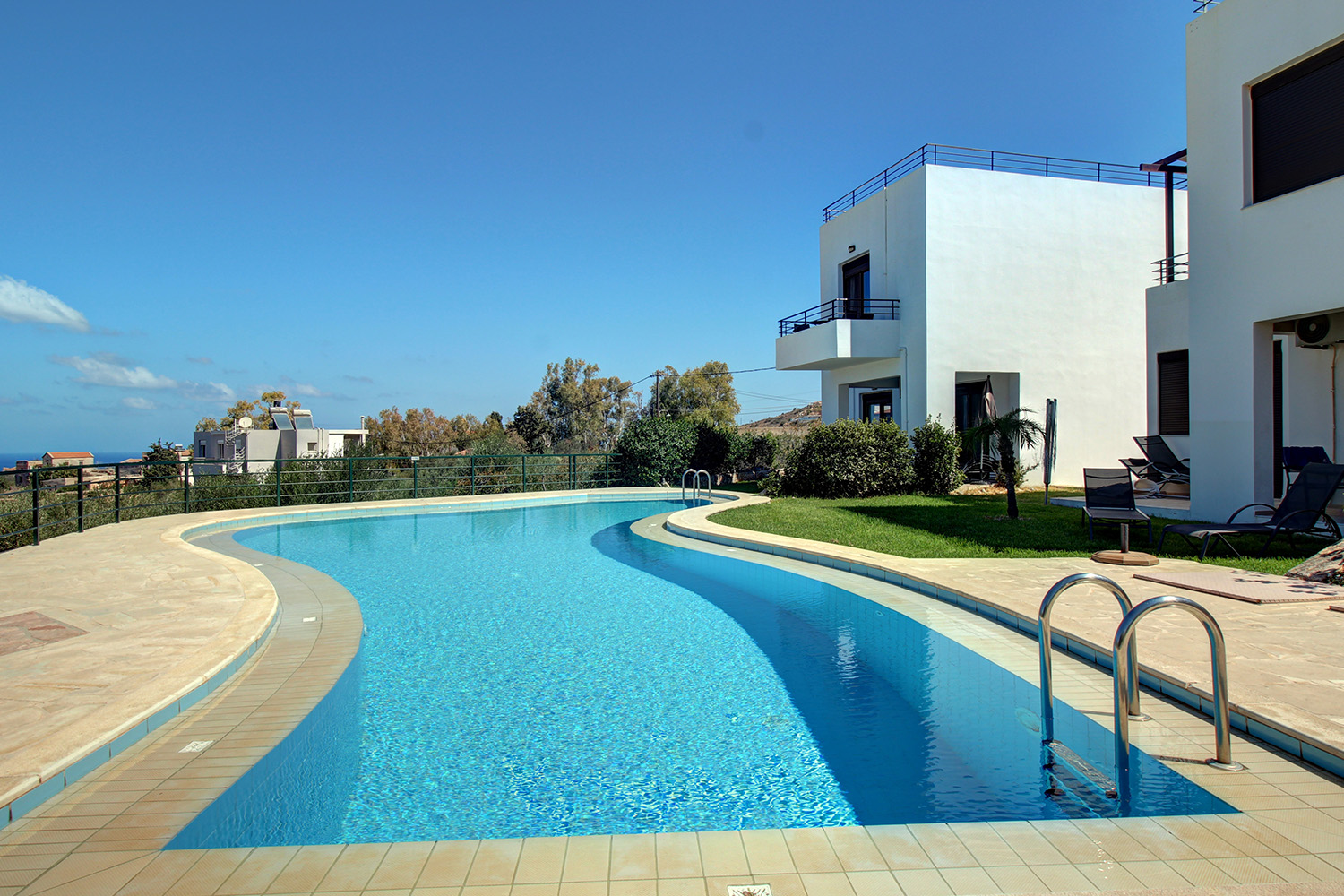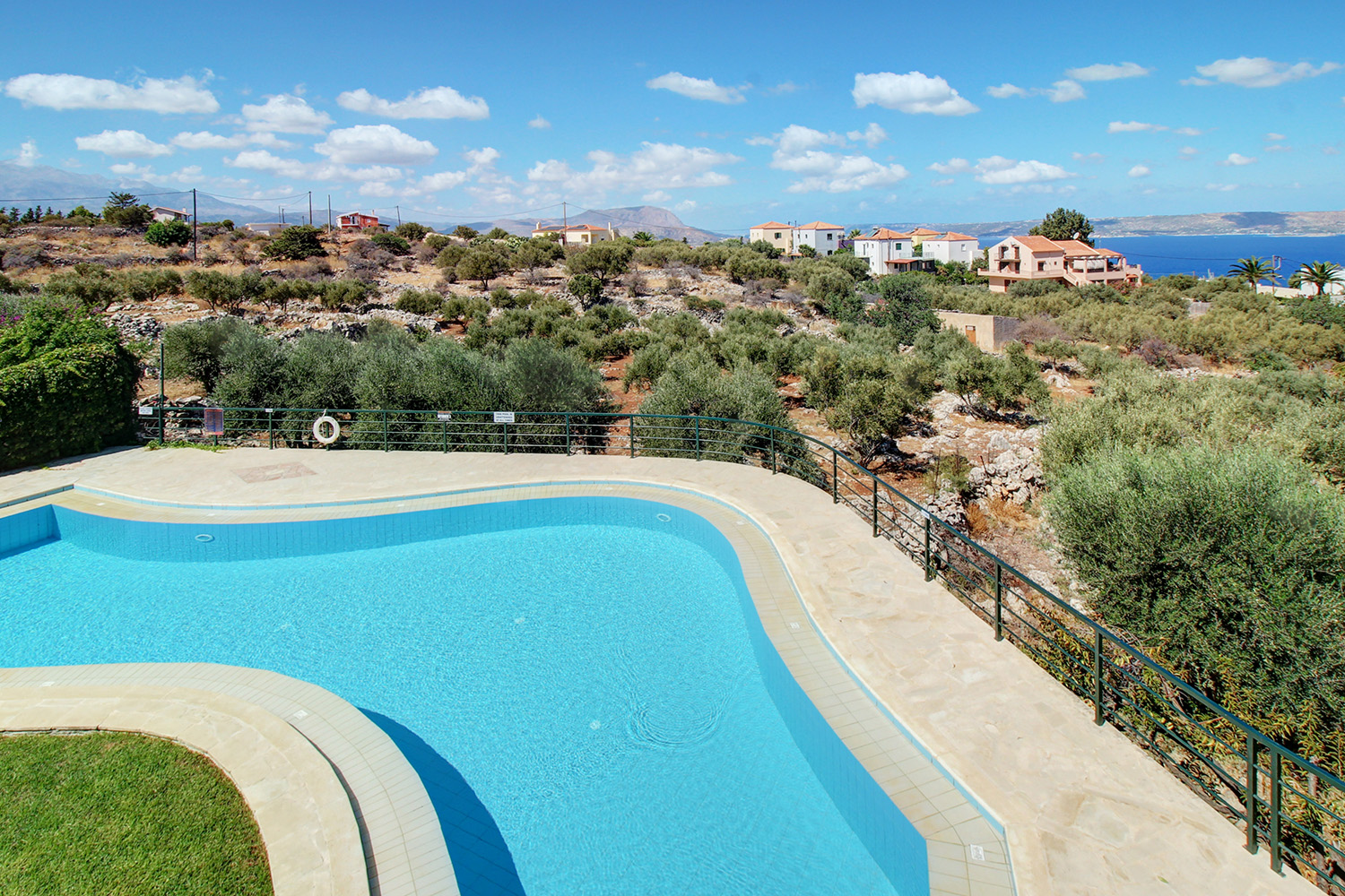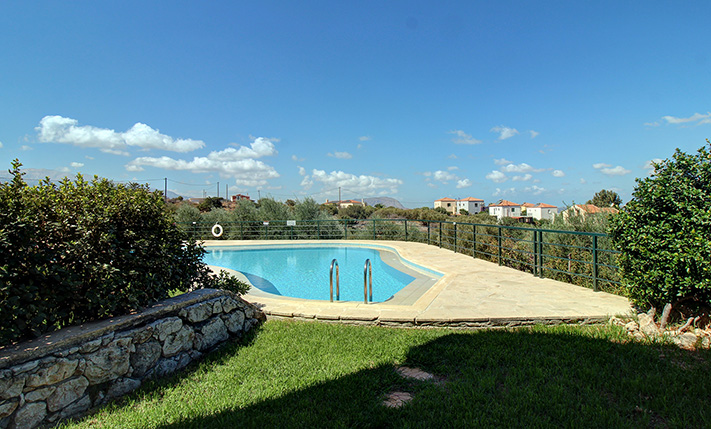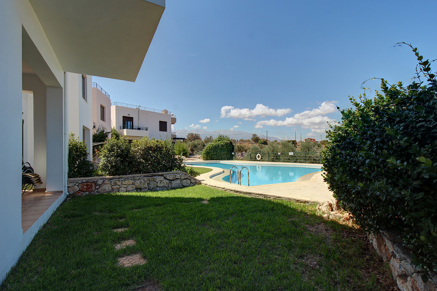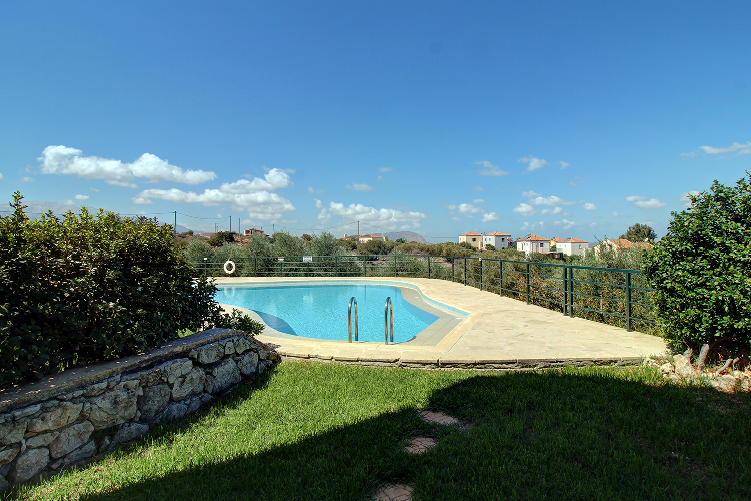 The property is the northernmost of five homes built within an attractive residential complex. Each residence has its own section of the plot for exclusive use, including a private parking space, while the owners share the entrance to the complex, a landscaped garden with lawn, and a 66 m² swimming pool. The homes are set on a gently sloping hillside with a northwestern orientation, but the surrounding outdoor areas have been arranged on a single level. A retaining wall at the lower side of the plot ensures open views towards the sea and Souda Bay.