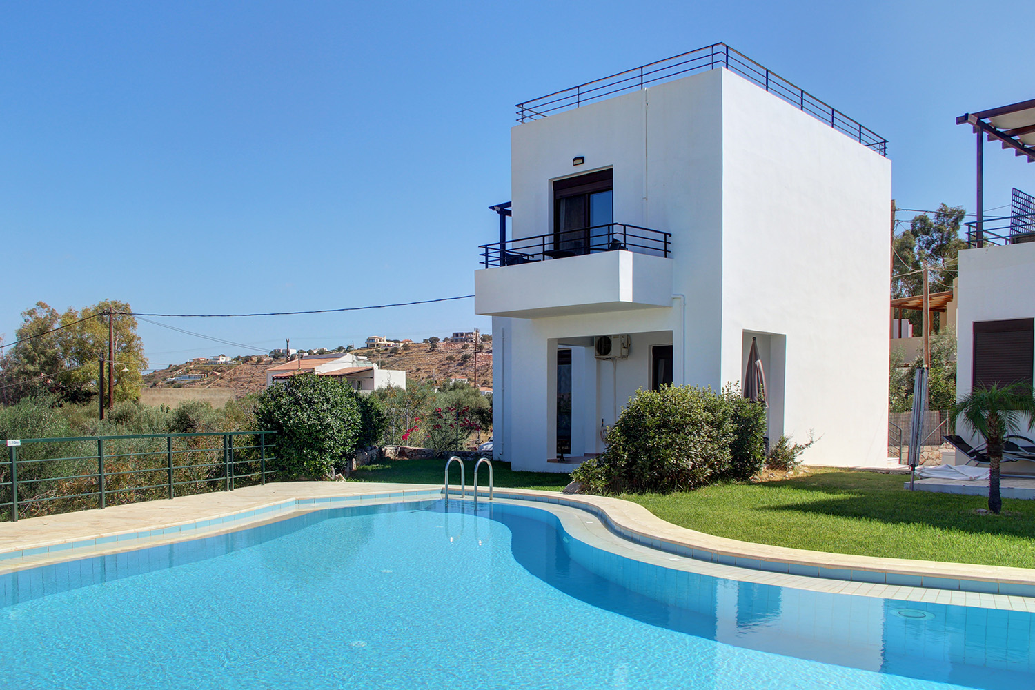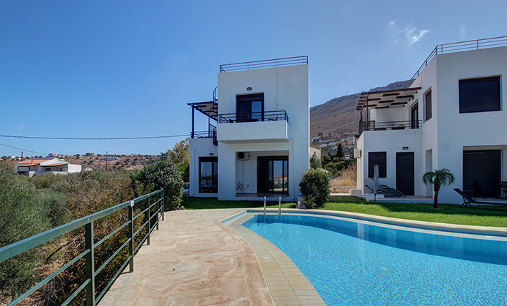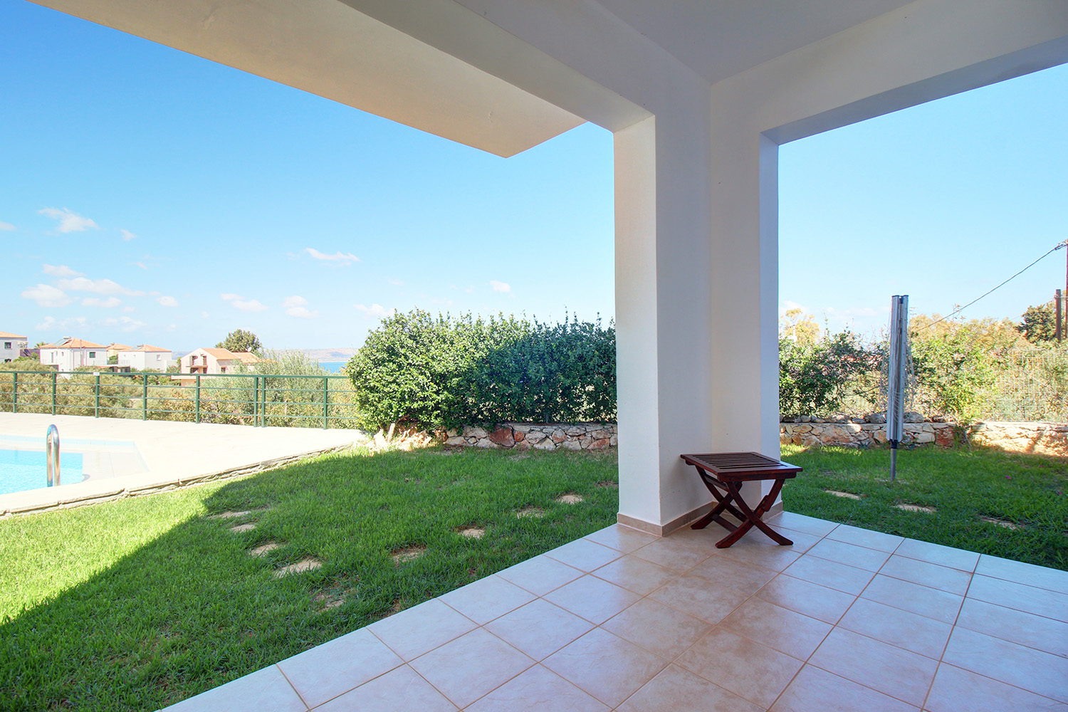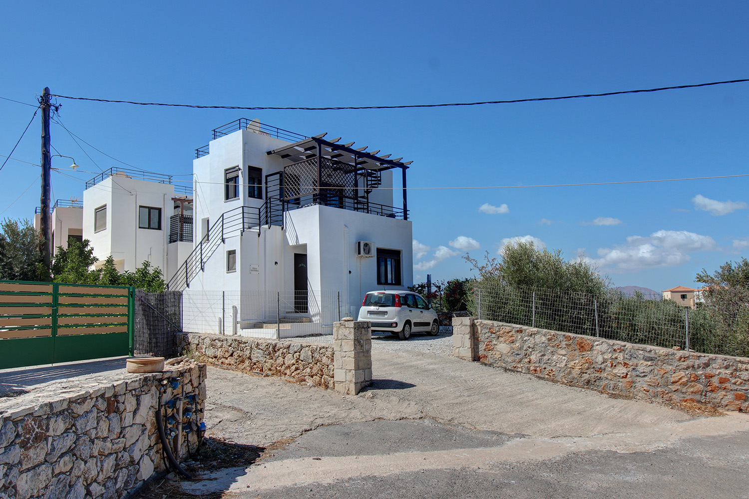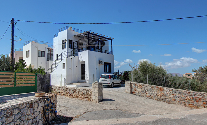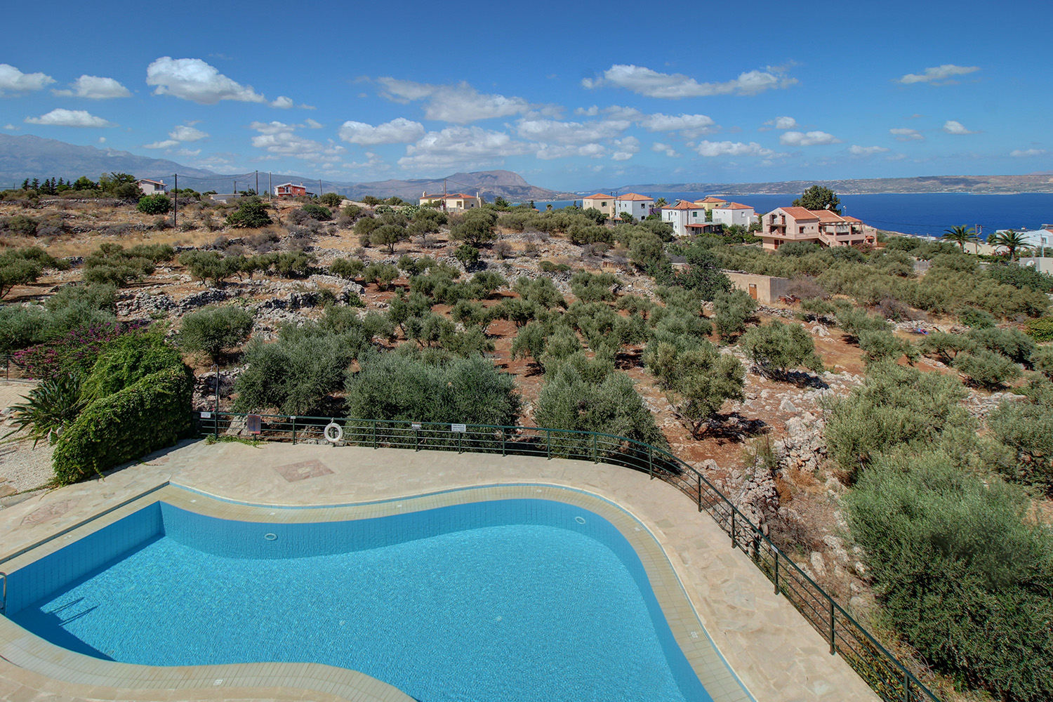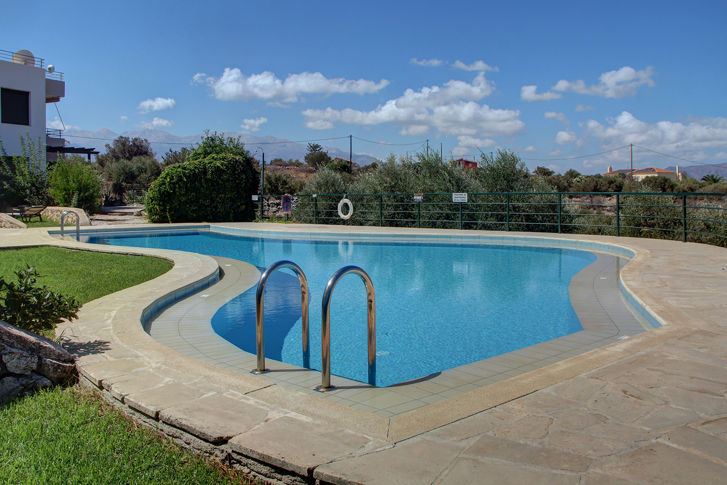 The property is the northernmost of five homes built within an attractive residential complex. Each residence has its own section of the plot for exclusive use, including a private parking space, while the owners share the entrance to the complex, a landscaped garden with lawn, and a 66 m² swimming pool. The homes are set on a gently sloping hillside with a northwestern orientation, but the surrounding outdoor areas have been arranged on a single level. A retaining wall at the lower side of the plot ensures open views towards the sea and Souda Bay.