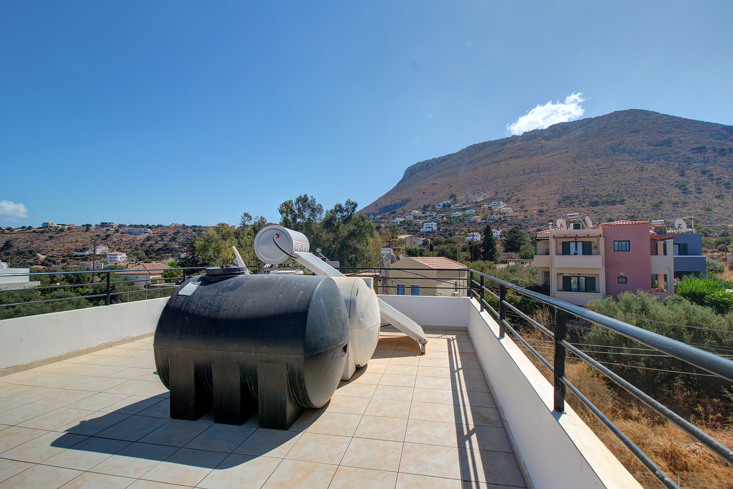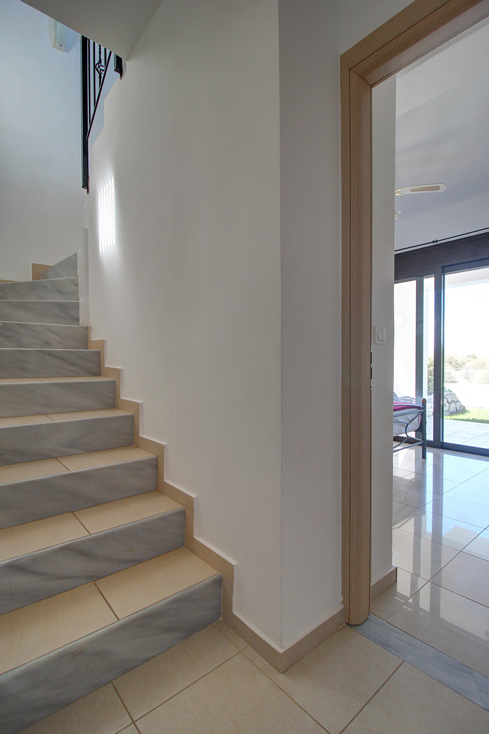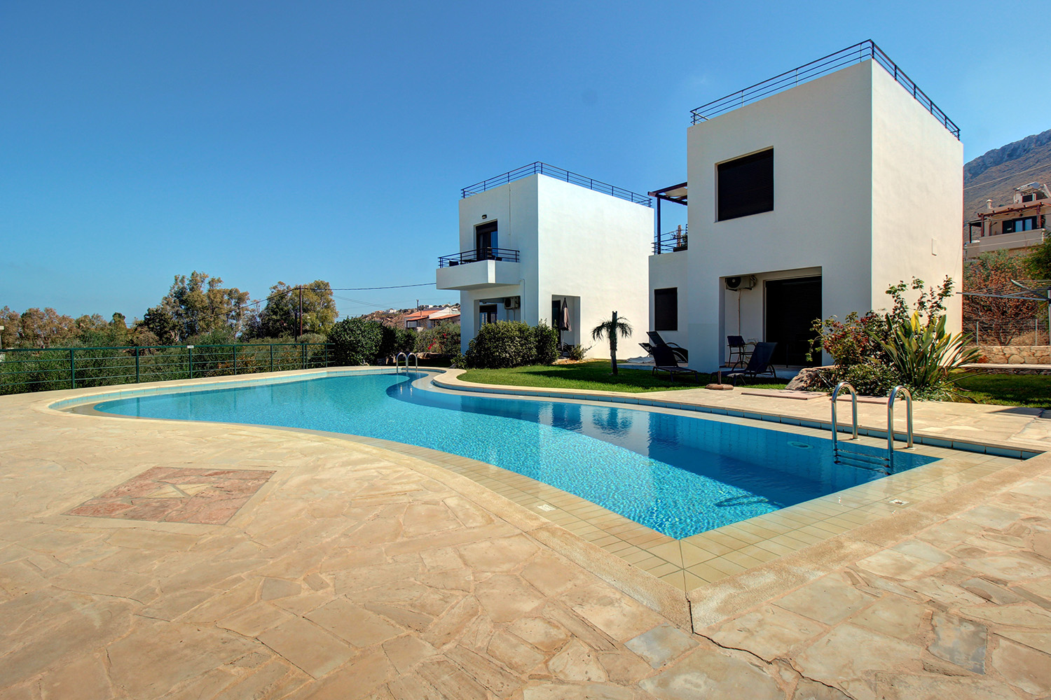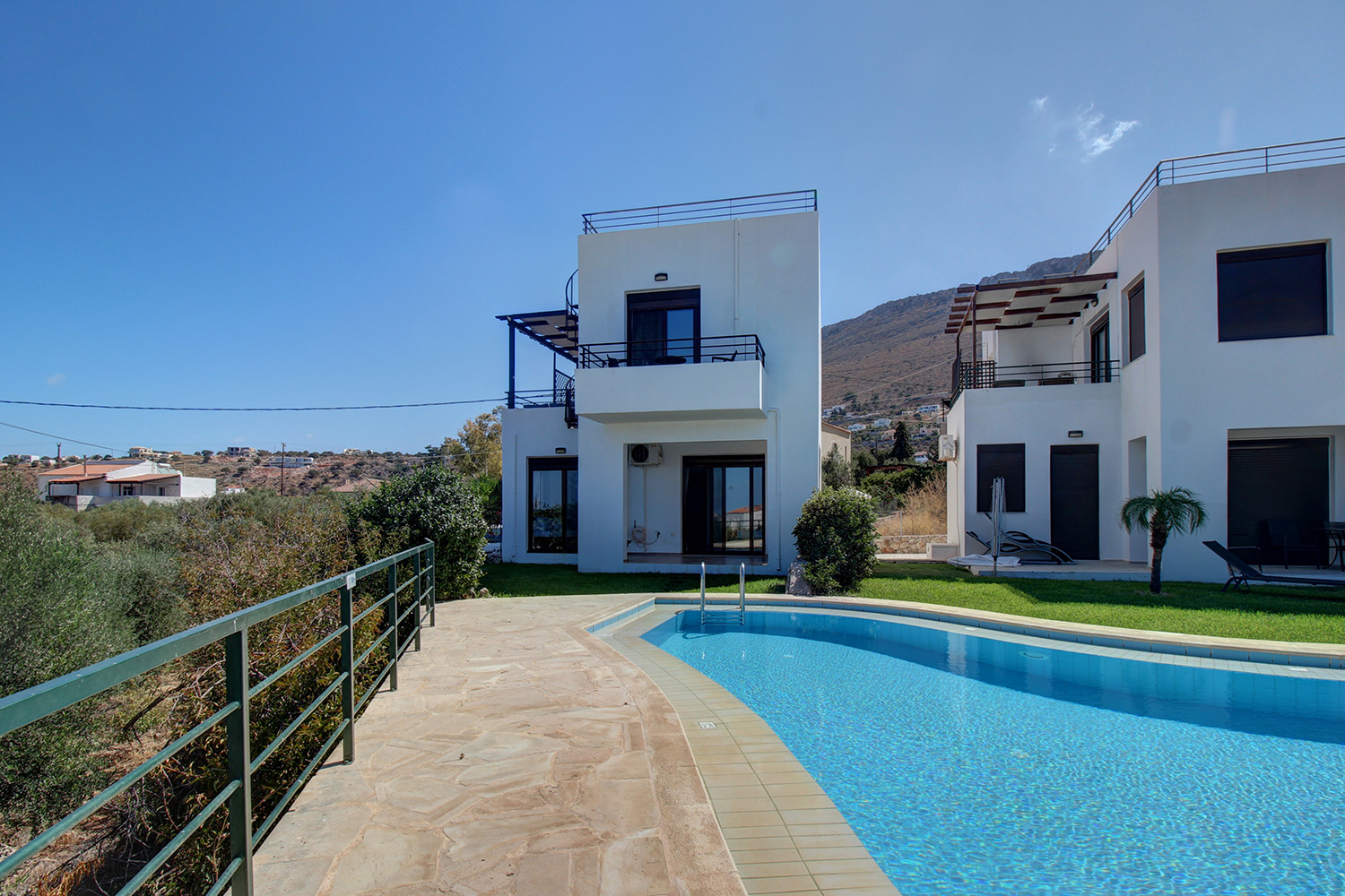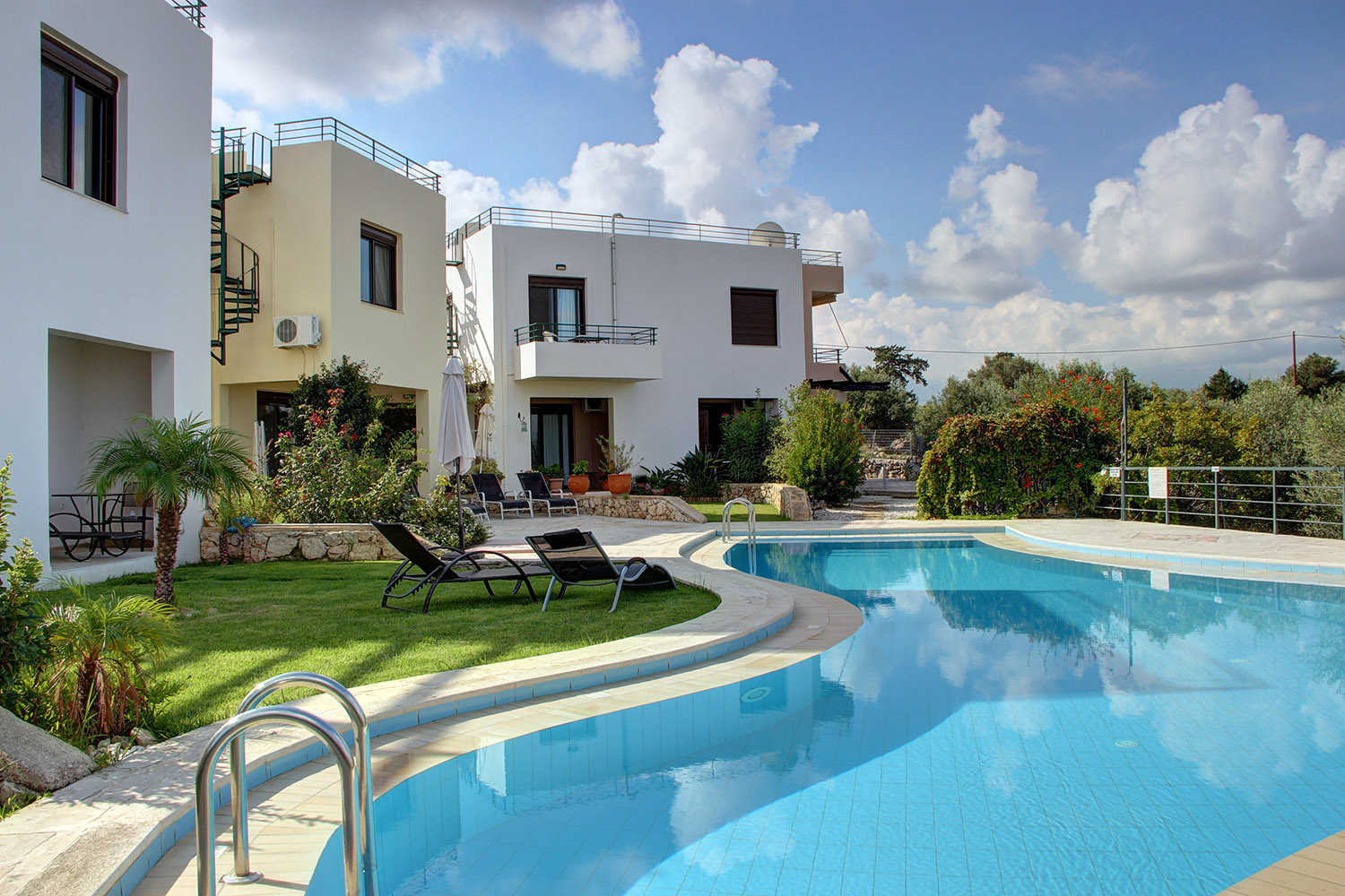 The property is the northernmost of five homes built within an attractive residential complex. Each residence has its own section of the plot for exclusive use, including a private parking space, while the owners share the entrance to the complex, a landscaped garden with lawn, and a 66 m² swimming pool. The homes are set on a gently sloping hillside with a northwestern orientation, but the surrounding outdoor areas have been arranged on a single level. A retaining wall at the lower side of the plot ensures open views towards the sea and Souda Bay.