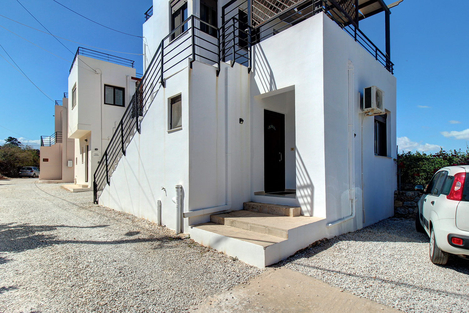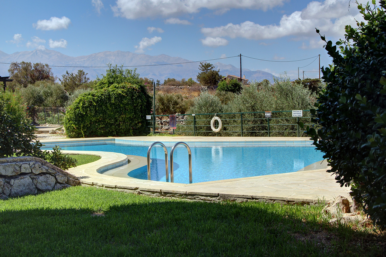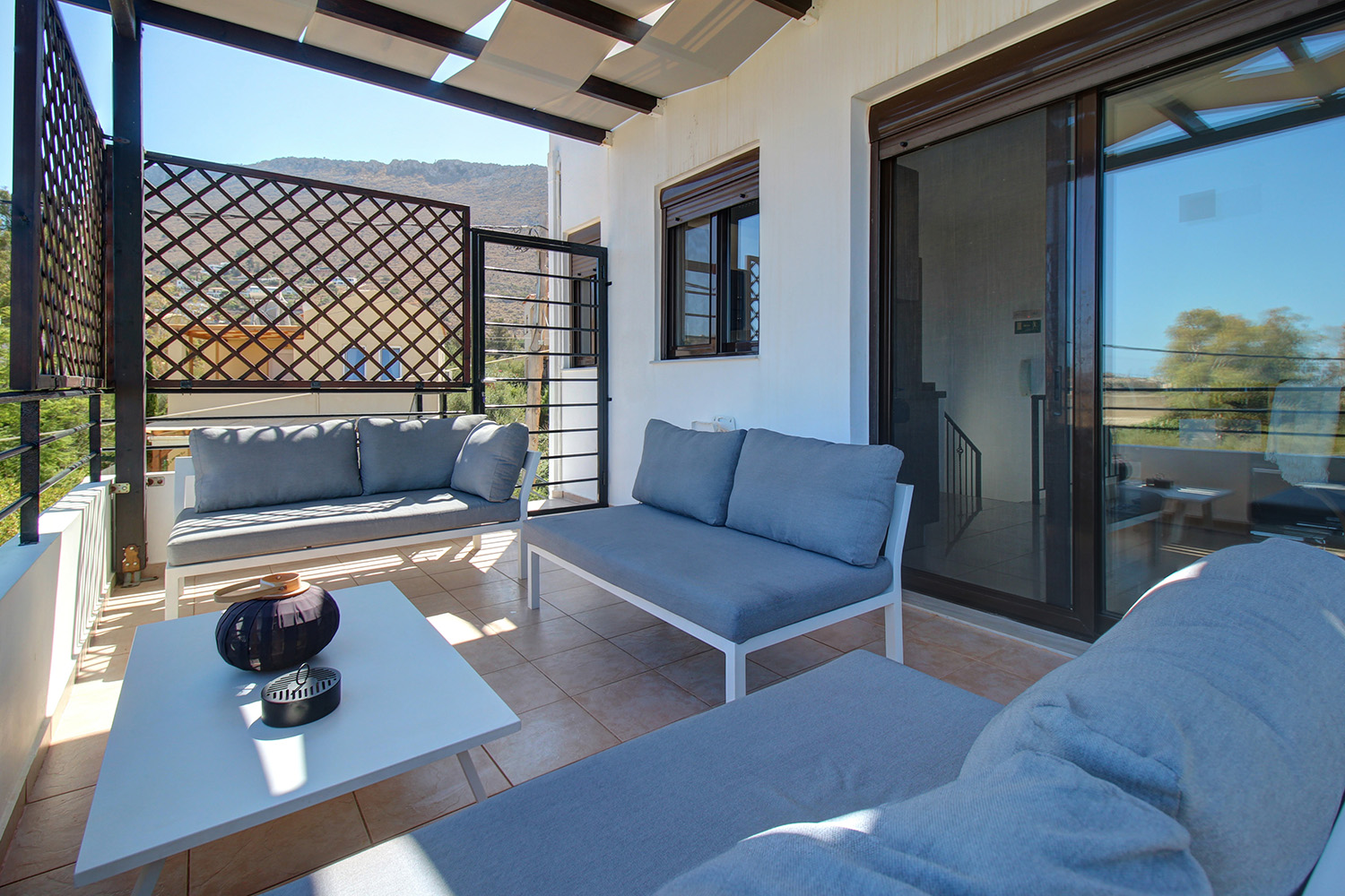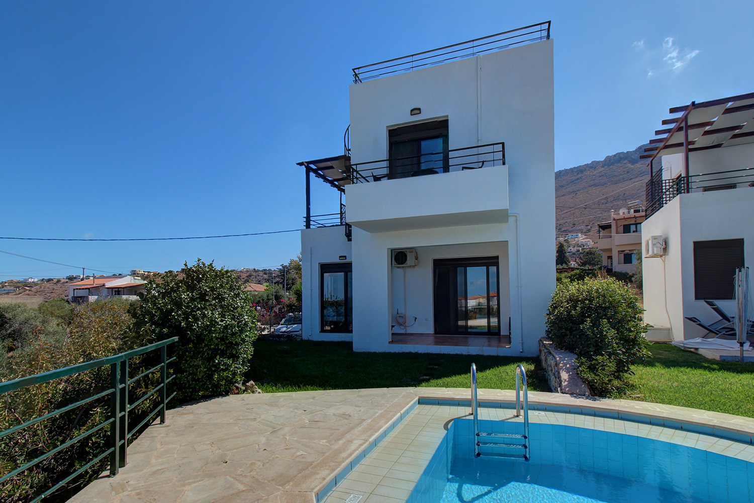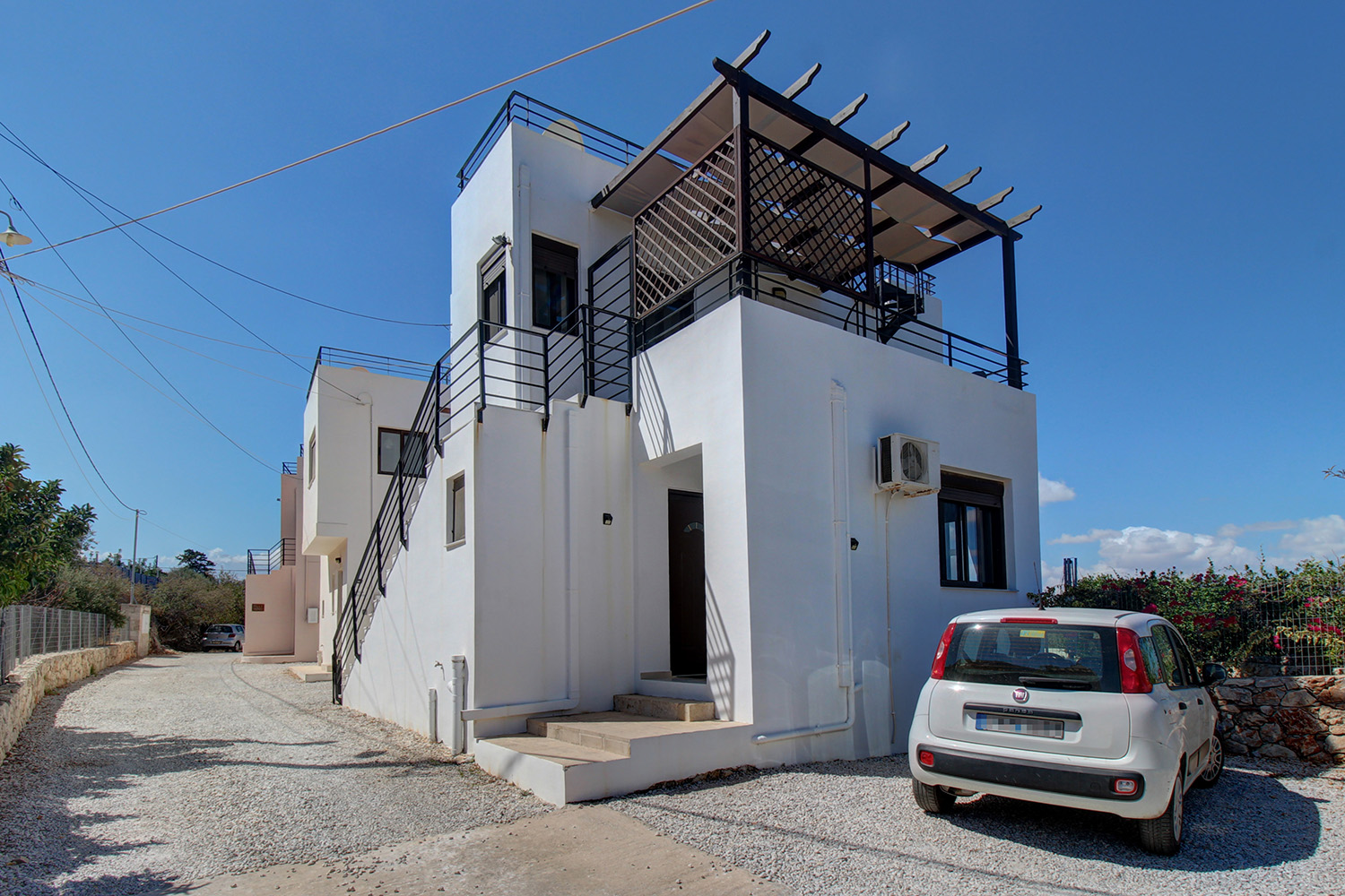 The property is the northernmost of five homes built within an attractive residential complex. Each residence has its own section of the plot for exclusive use, including a private parking space, while the owners share the entrance to the complex, a landscaped garden with lawn, and a 66 m² swimming pool. The homes are set on a gently sloping hillside with a northwestern orientation, but the surrounding outdoor areas have been arranged on a single level. A retaining wall at the lower side of the plot ensures open views towards the sea and Souda Bay.