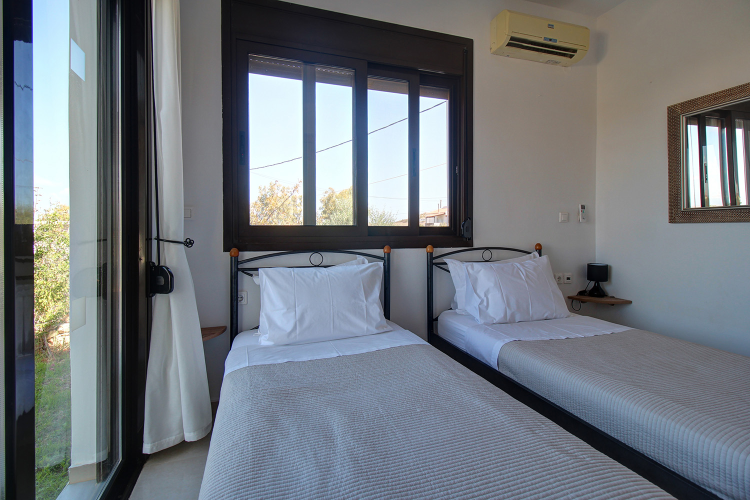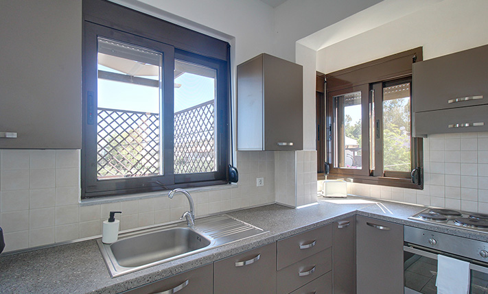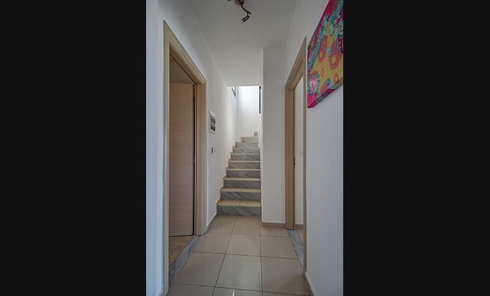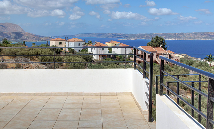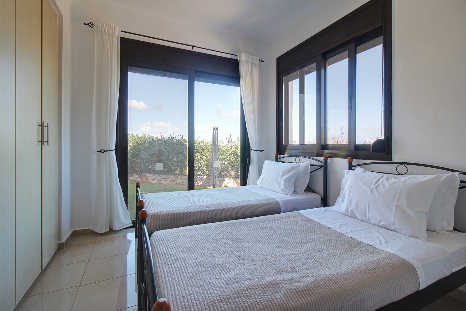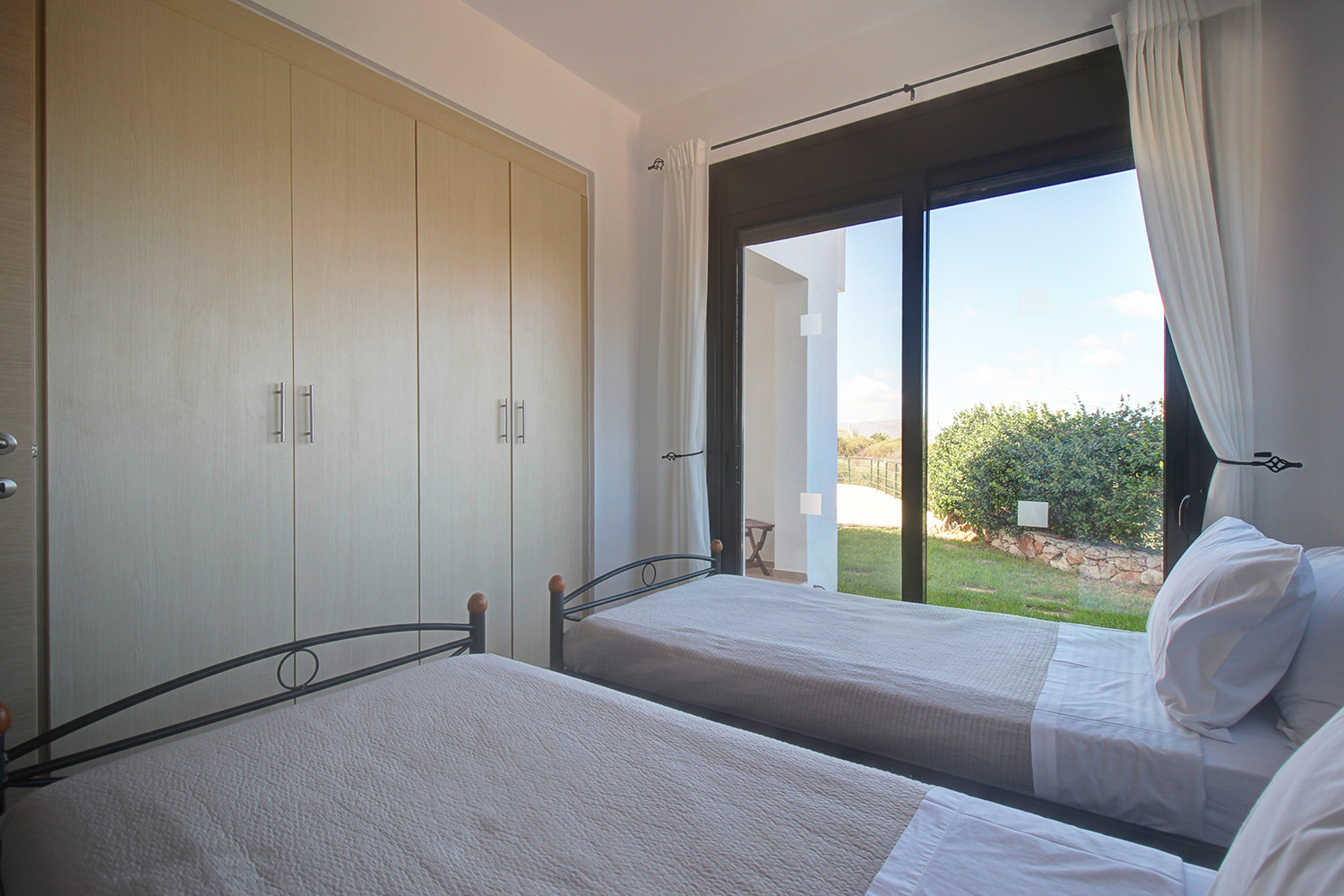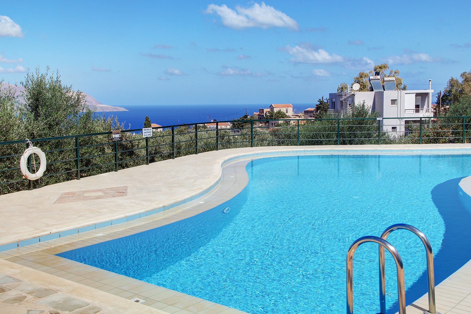 The property is the northernmost of five homes built within an attractive residential complex. Each residence has its own section of the plot for exclusive use, including a private parking space, while the owners share the entrance to the complex, a landscaped garden with lawn, and a 66 m² swimming pool. The homes are set on a gently sloping hillside with a northwestern orientation, but the surrounding outdoor areas have been arranged on a single level. A retaining wall at the lower side of the plot ensures open views towards the sea and Souda Bay.