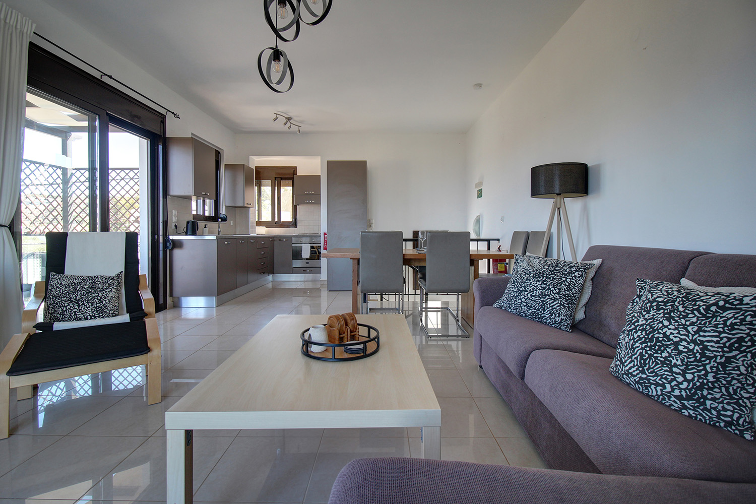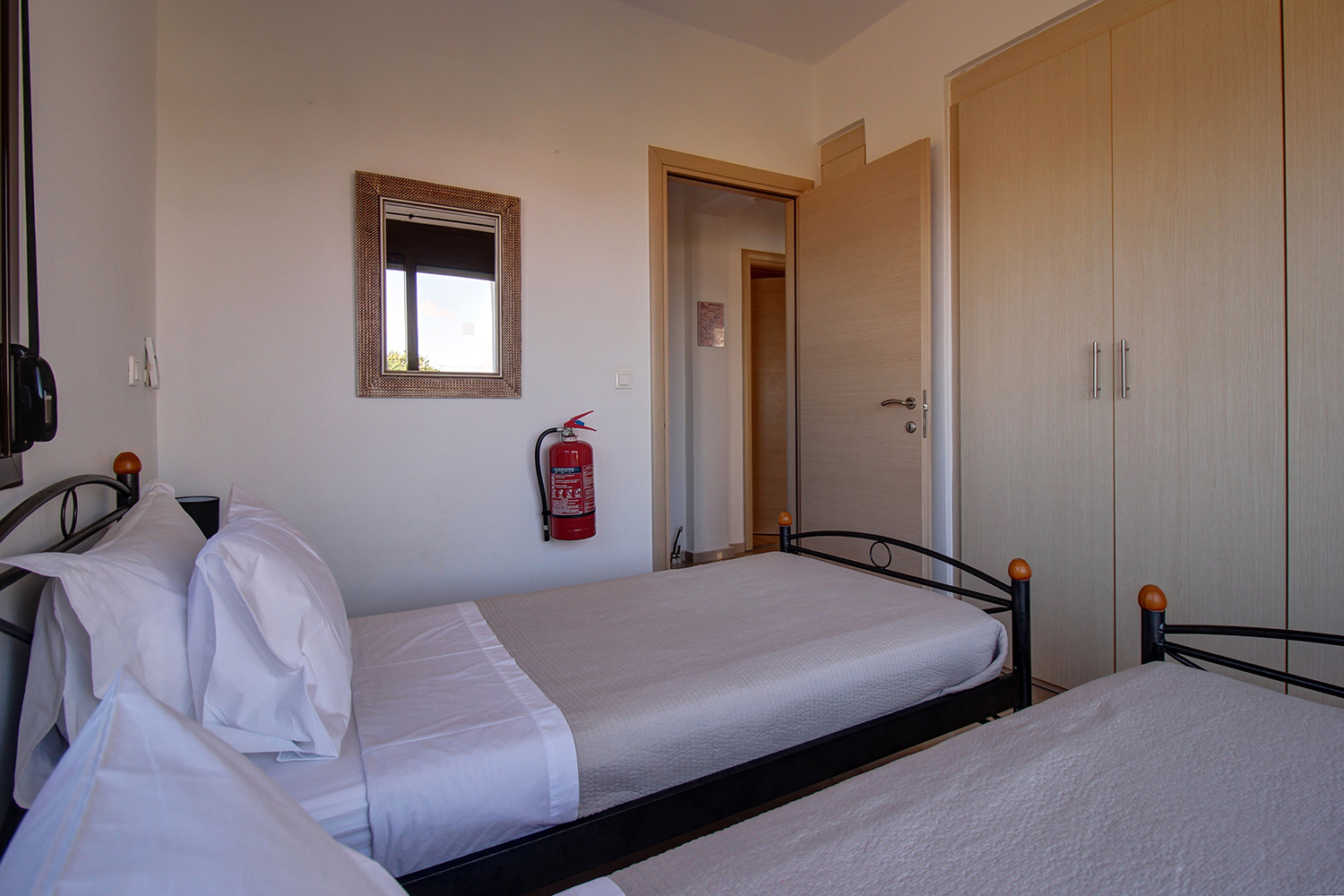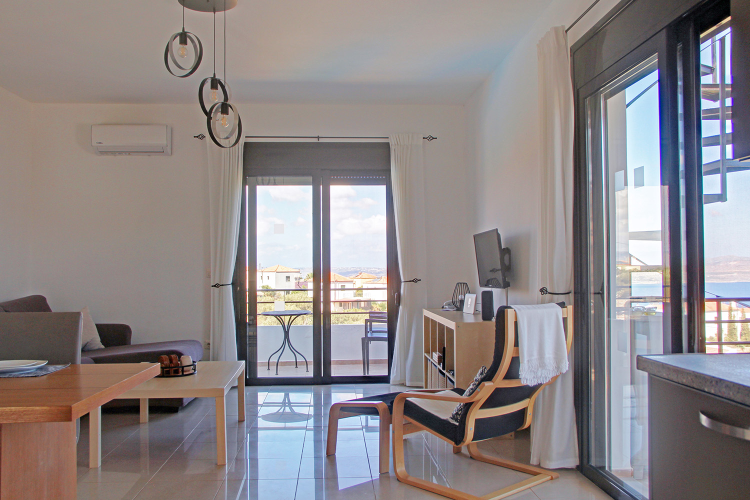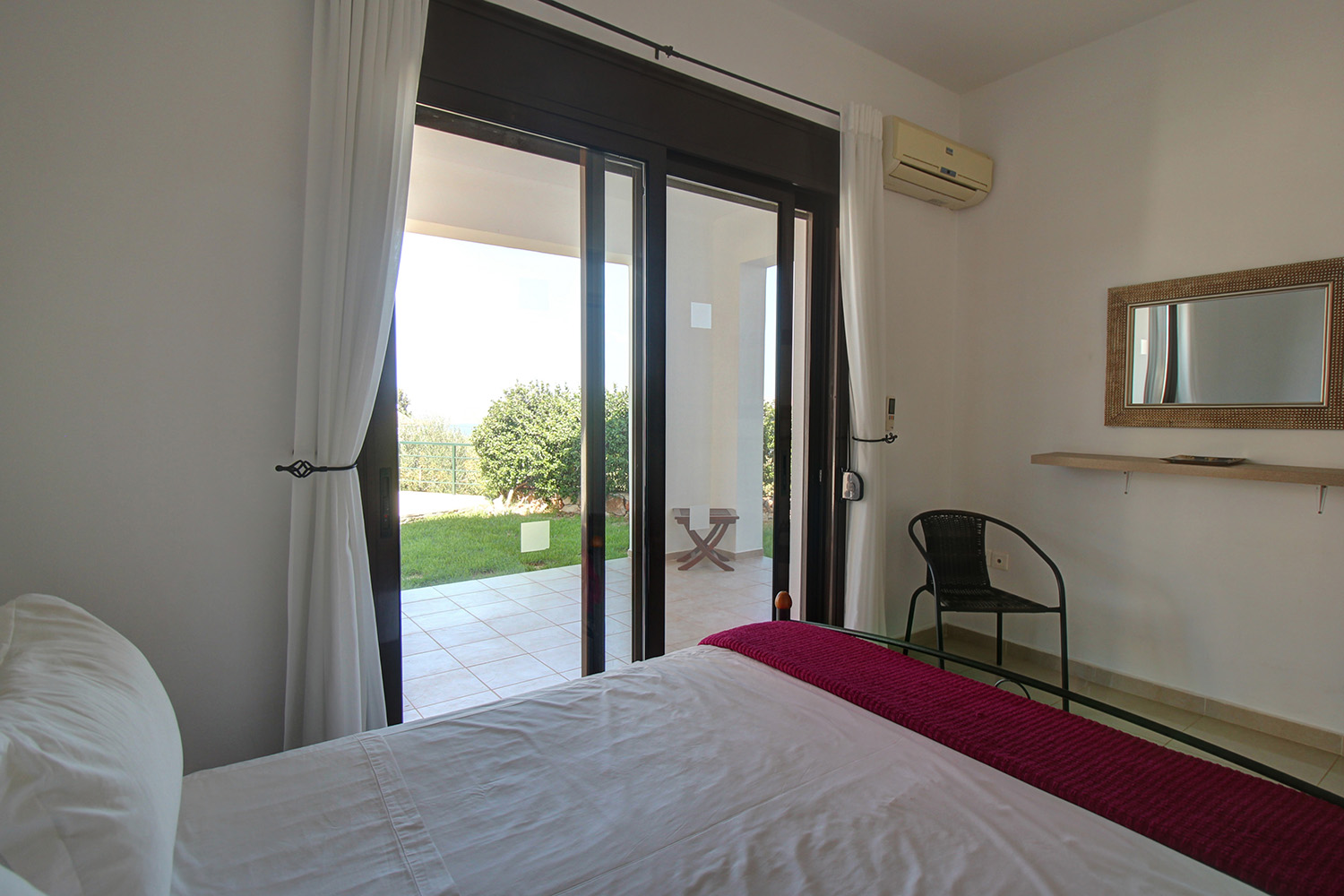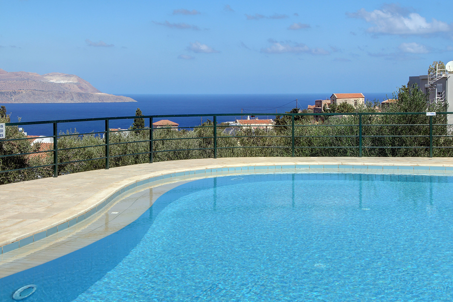 The property is the northernmost of five homes built within an attractive residential complex. Each residence has its own section of the plot for exclusive use, including a private parking space, while the owners share the entrance to the complex, a landscaped garden with lawn, and a 66 m² swimming pool. The homes are set on a gently sloping hillside with a northwestern orientation, but the surrounding outdoor areas have been arranged on a single level. A retaining wall at the lower side of the plot ensures open views towards the sea and Souda Bay.
