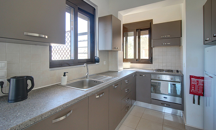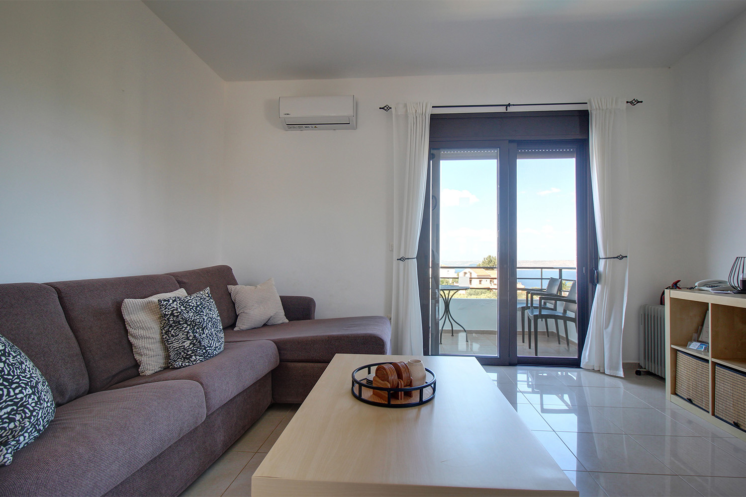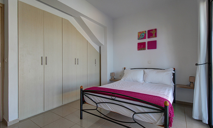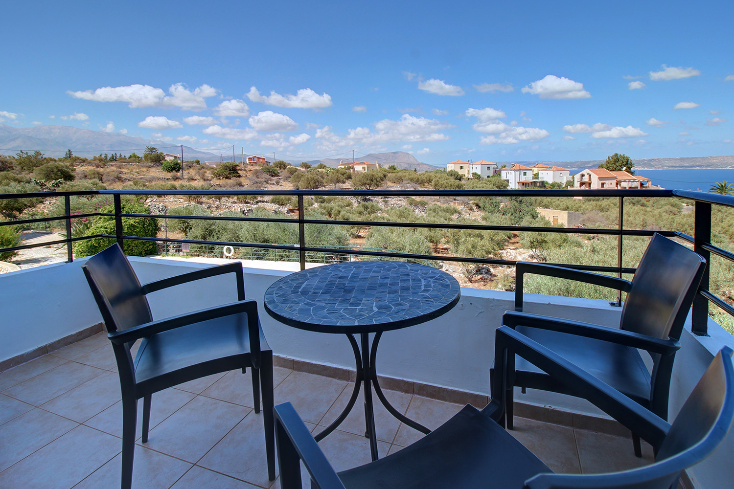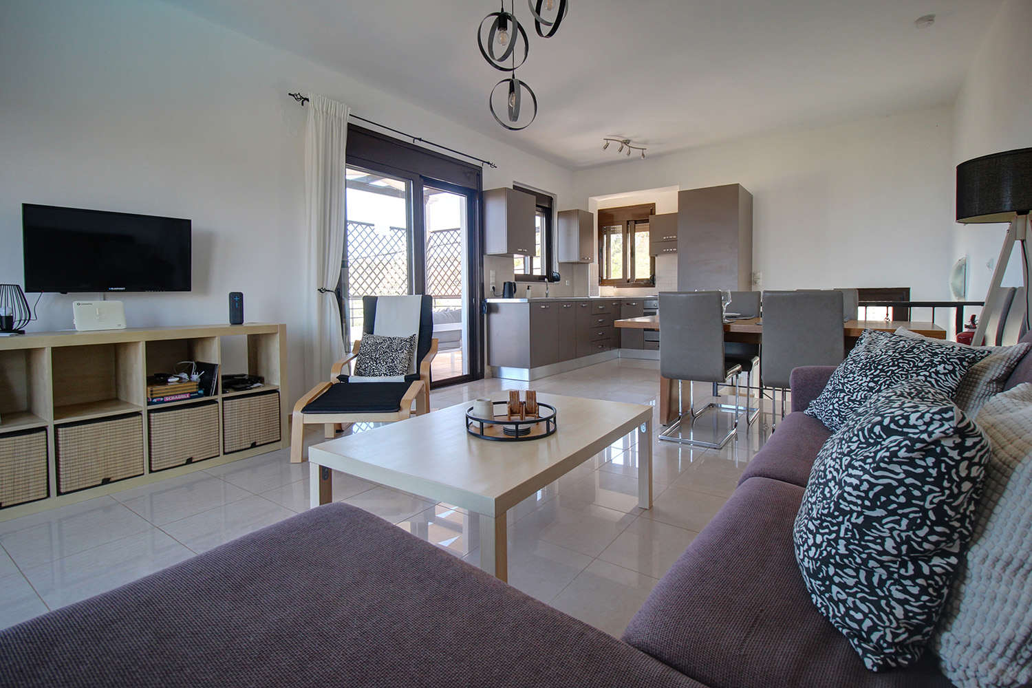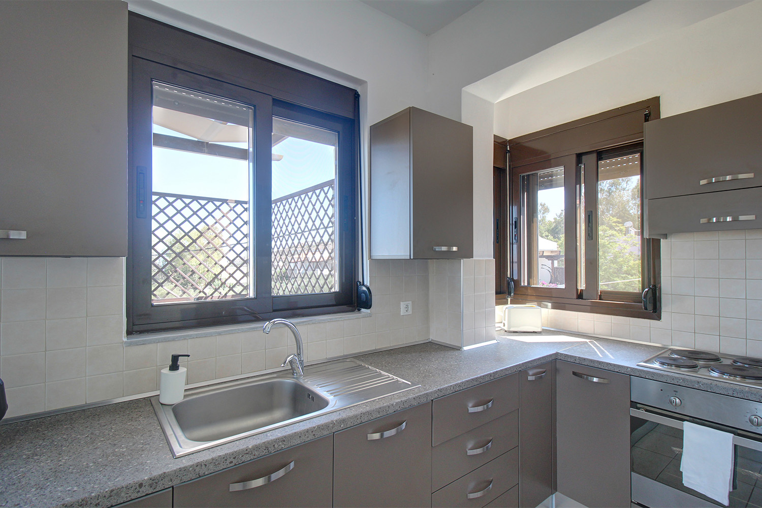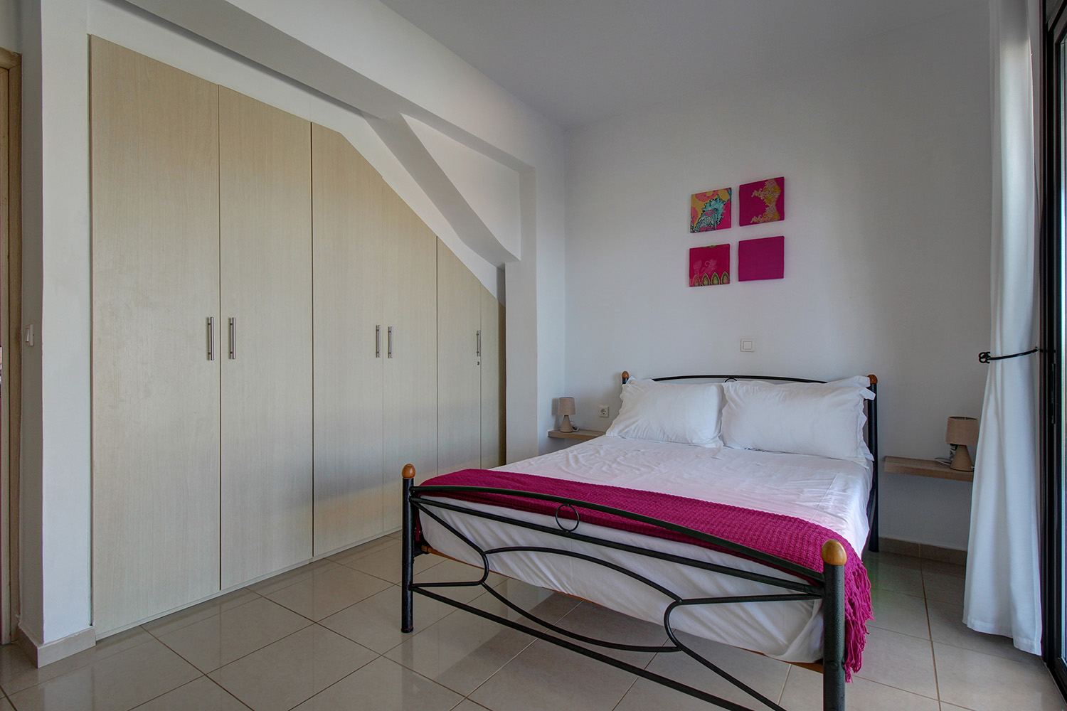 The property is the northernmost of five homes built within an attractive residential complex. Each residence has its own section of the plot for exclusive use, including a private parking space, while the owners share the entrance to the complex, a landscaped garden with lawn, and a 66 m² swimming pool. The homes are set on a gently sloping hillside with a northwestern orientation, but the surrounding outdoor areas have been arranged on a single level. A retaining wall at the lower side of the plot ensures open views towards the sea and Souda Bay.