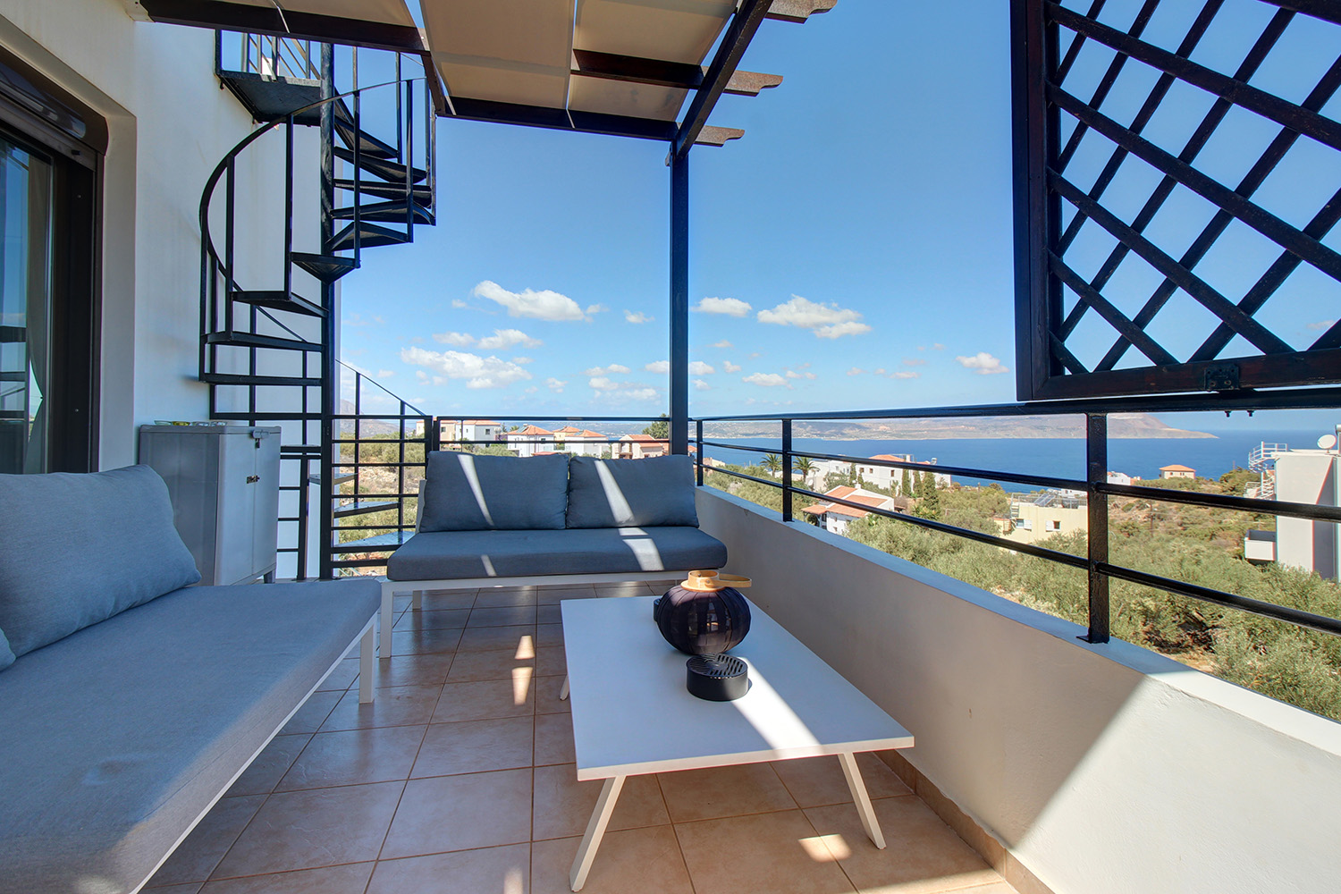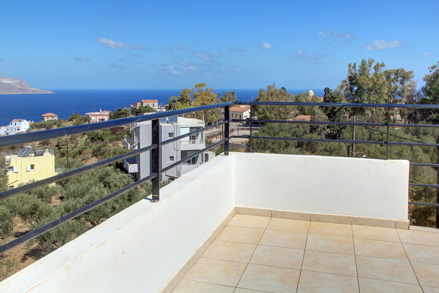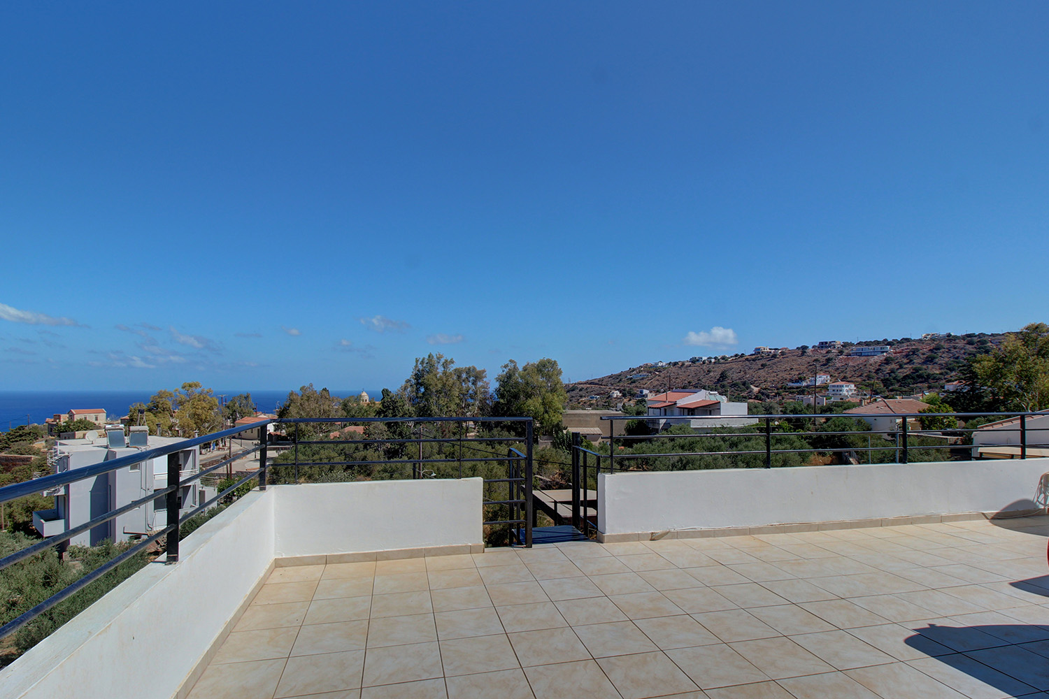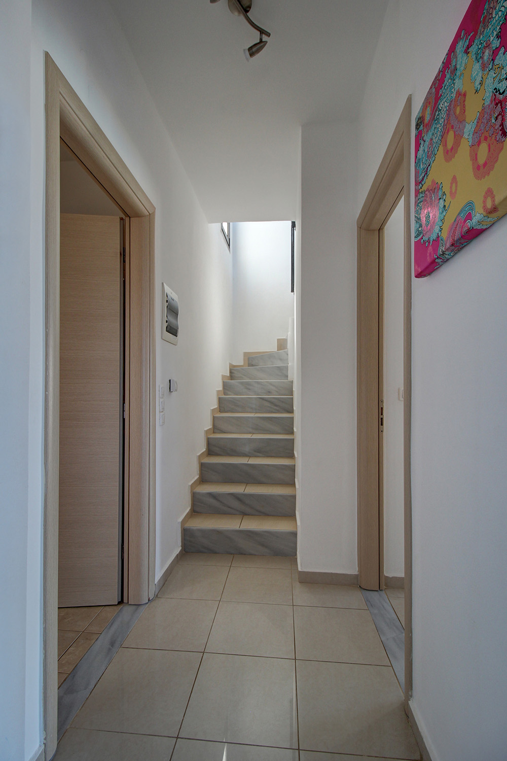 An internal staircase leads to the upper floor, which is designed as an open-plan living area with a lounge, dining space, and kitchen. This floor is bright and spacious, with enough room to add a guest WC or a fireplace in the future if desired. Next to the kitchen there is a comfortable balcony, and from there a spiral staircase leads to the tiled roof terrace, which is ideal for sunbathing and enjoying the views.