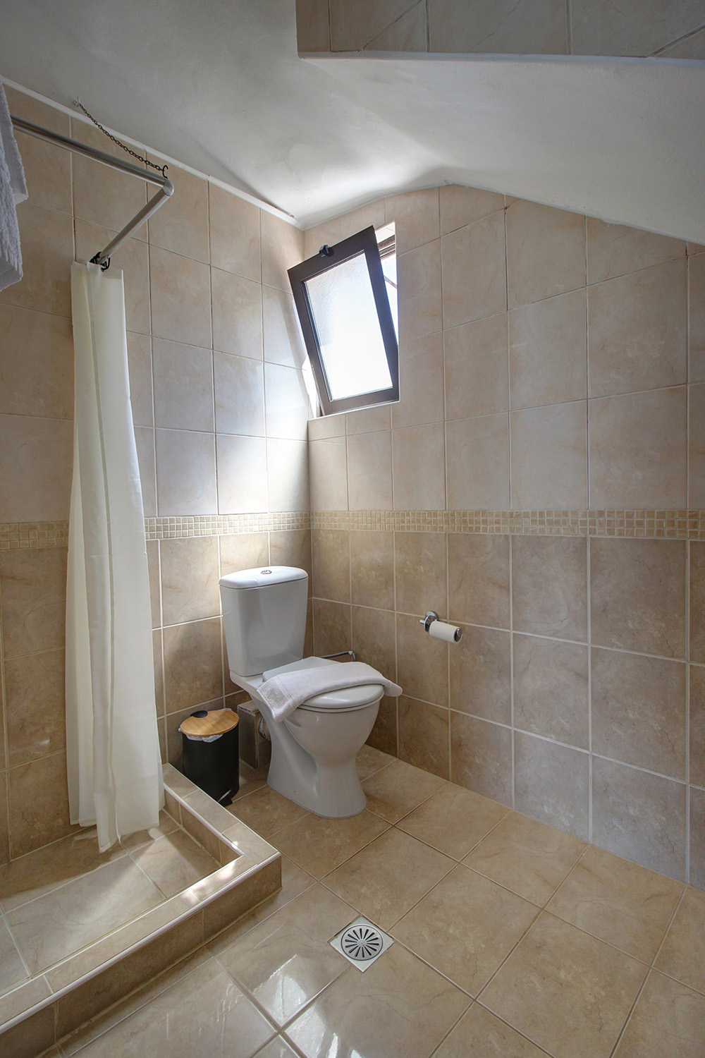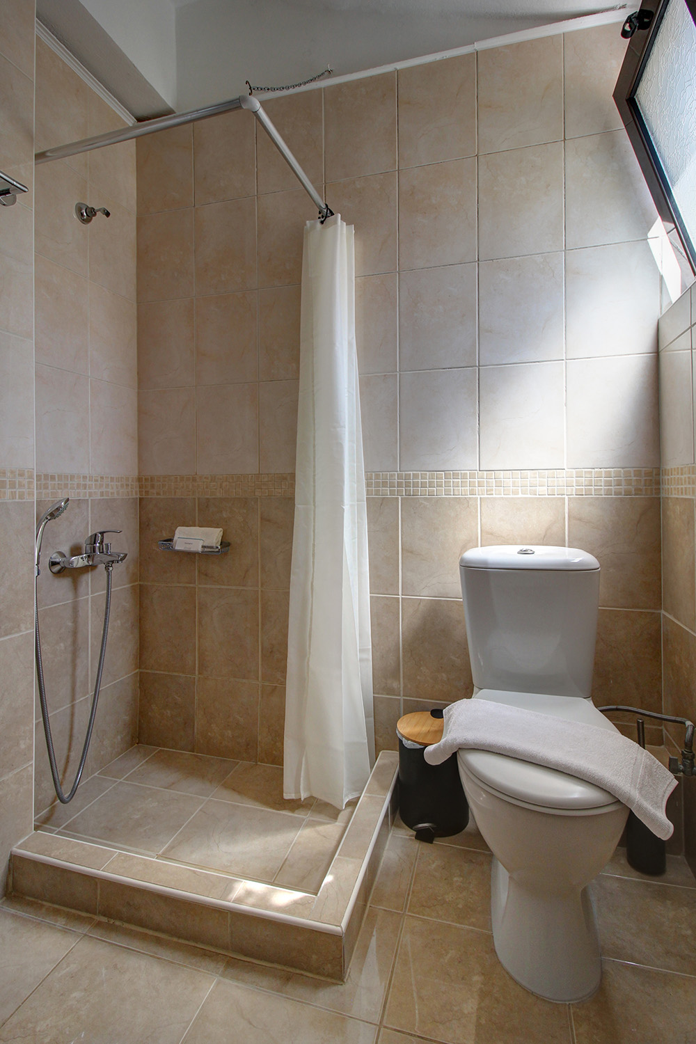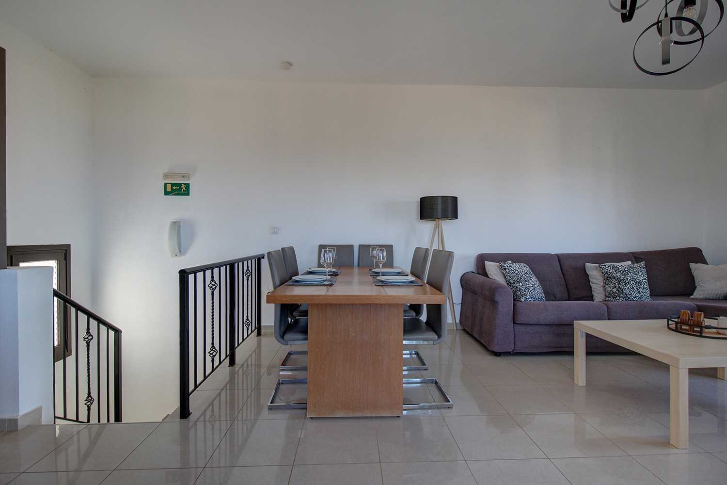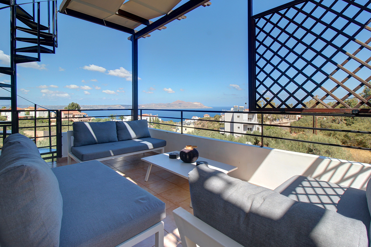 An internal staircase leads to the upper floor, which is designed as an open-plan living area with a lounge, dining space, and kitchen. This floor is bright and spacious, with enough room to add a guest WC or a fireplace in the future if desired. Next to the kitchen there is a comfortable balcony, and from there a spiral staircase leads to the tiled roof terrace, which is ideal for sunbathing and enjoying the views.