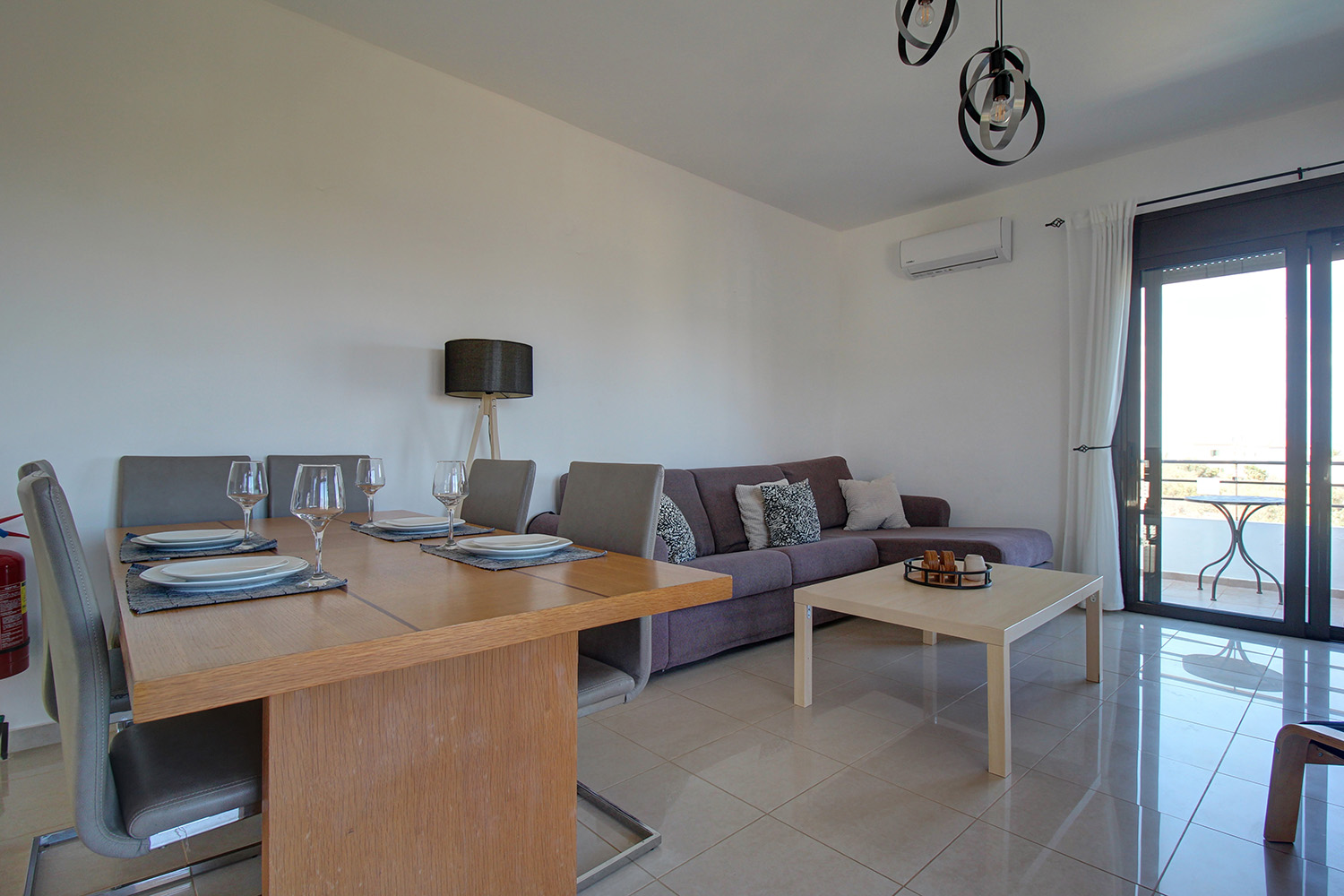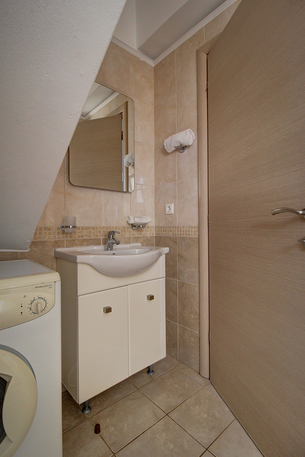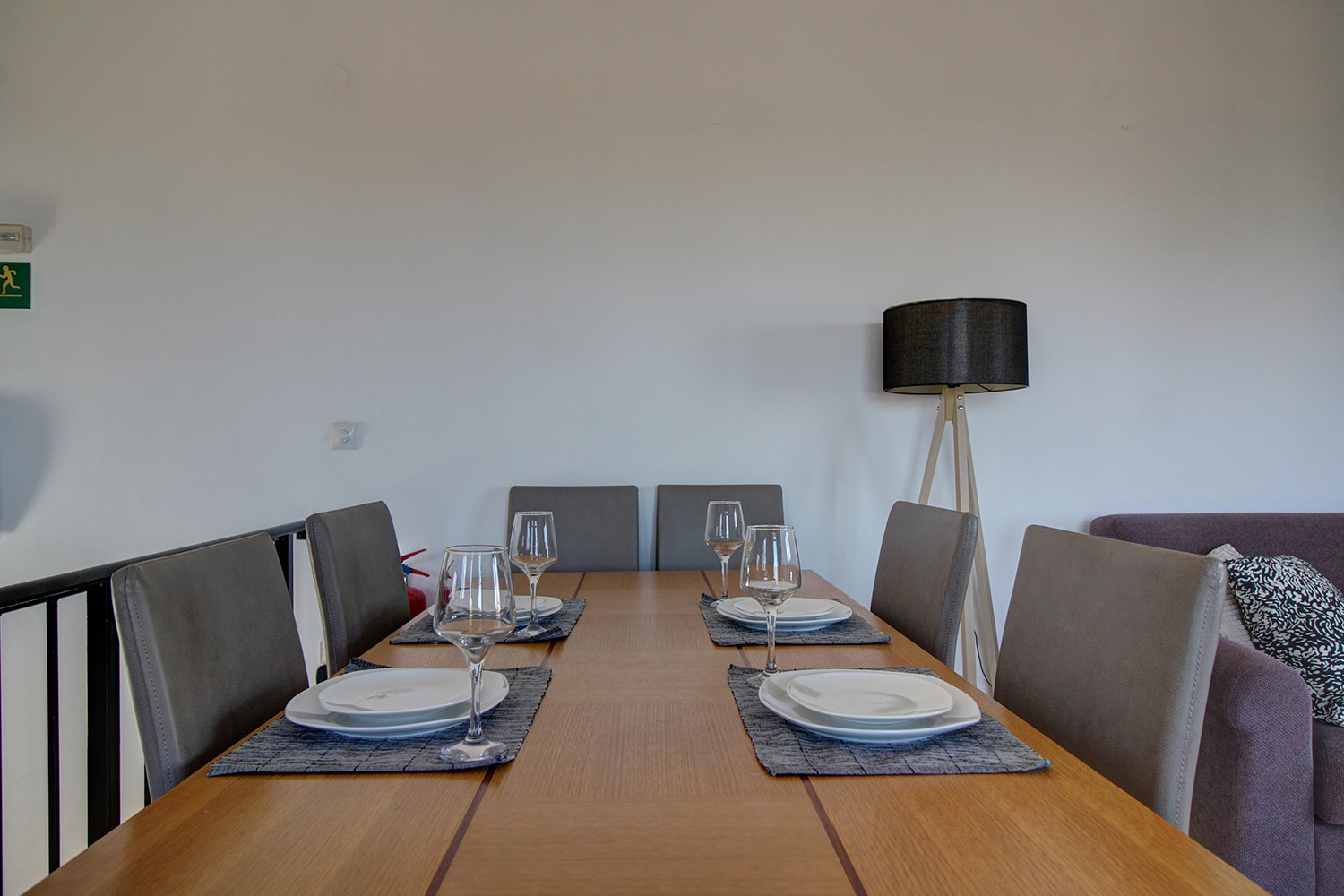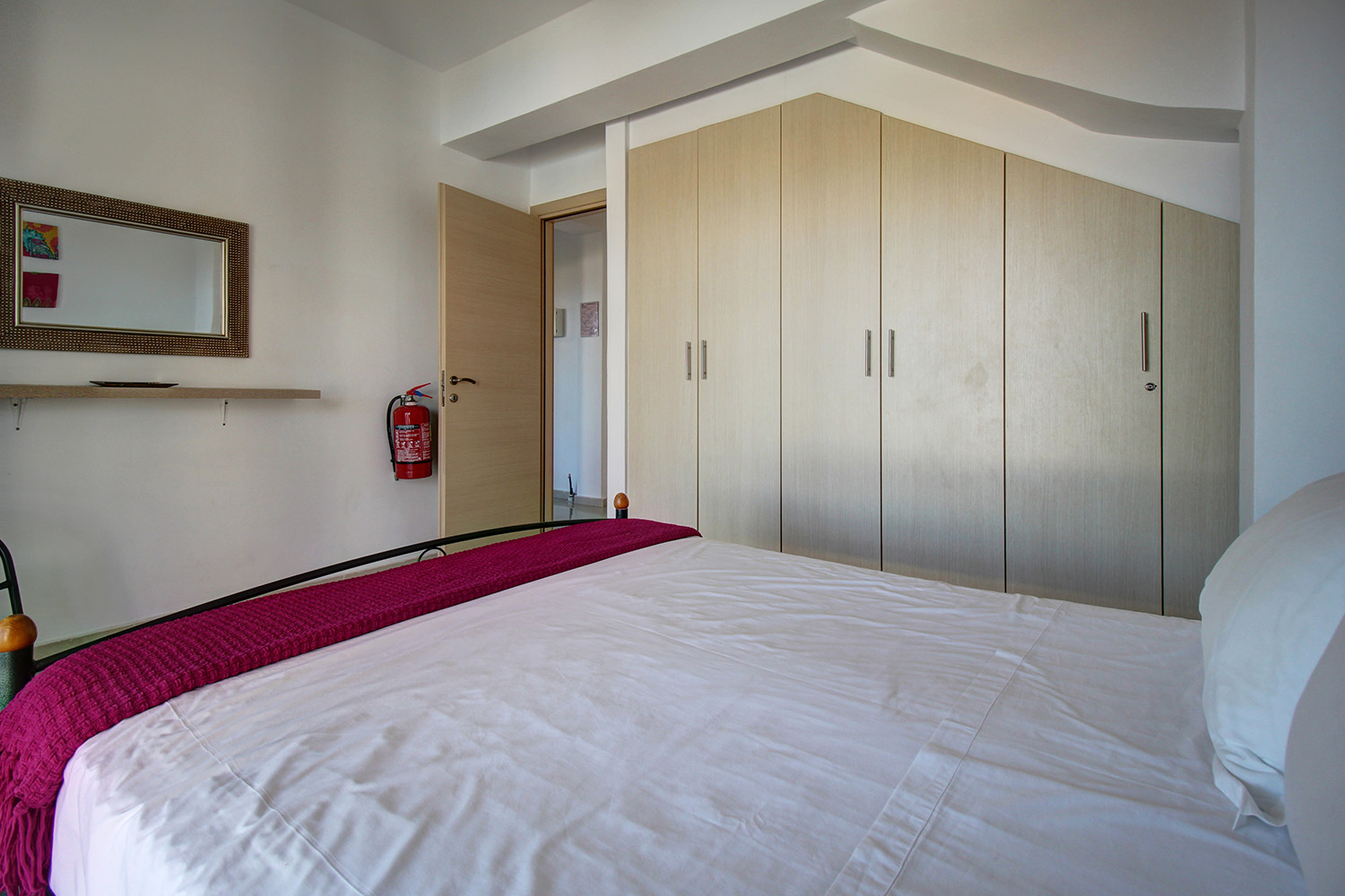 An internal staircase leads to the upper floor, which is designed as an open-plan living area with a lounge, dining space, and kitchen. This floor is bright and spacious, with enough room to add a guest WC or a fireplace in the future if desired. Next to the kitchen there is a comfortable balcony, and from there a spiral staircase leads to the tiled roof terrace, which is ideal for sunbathing and enjoying the views.