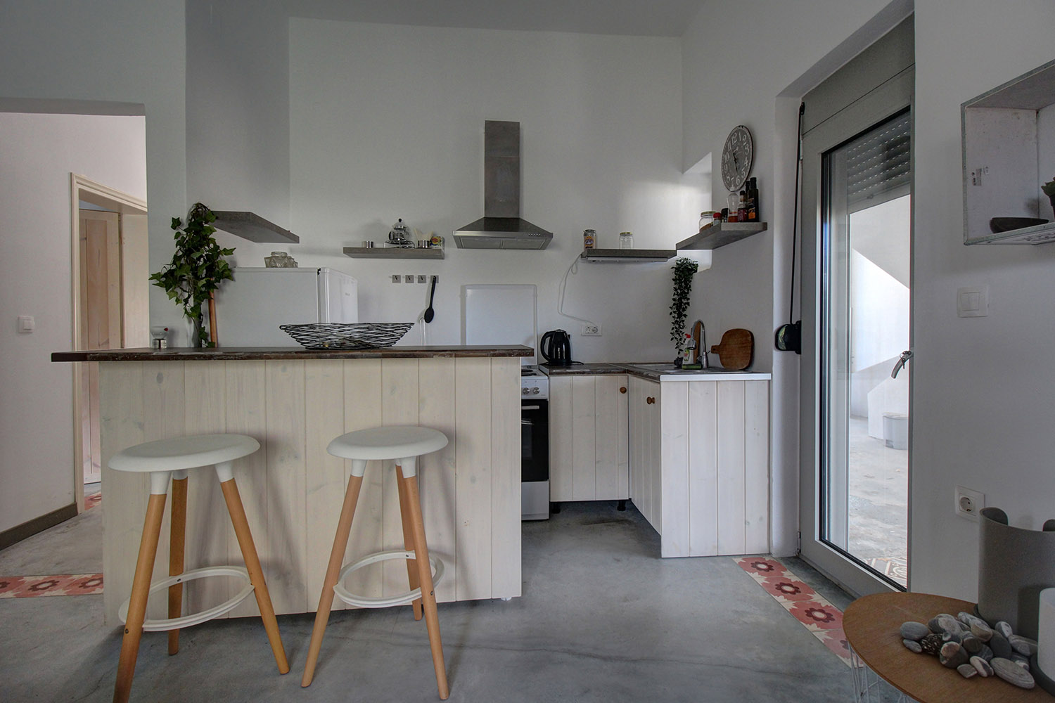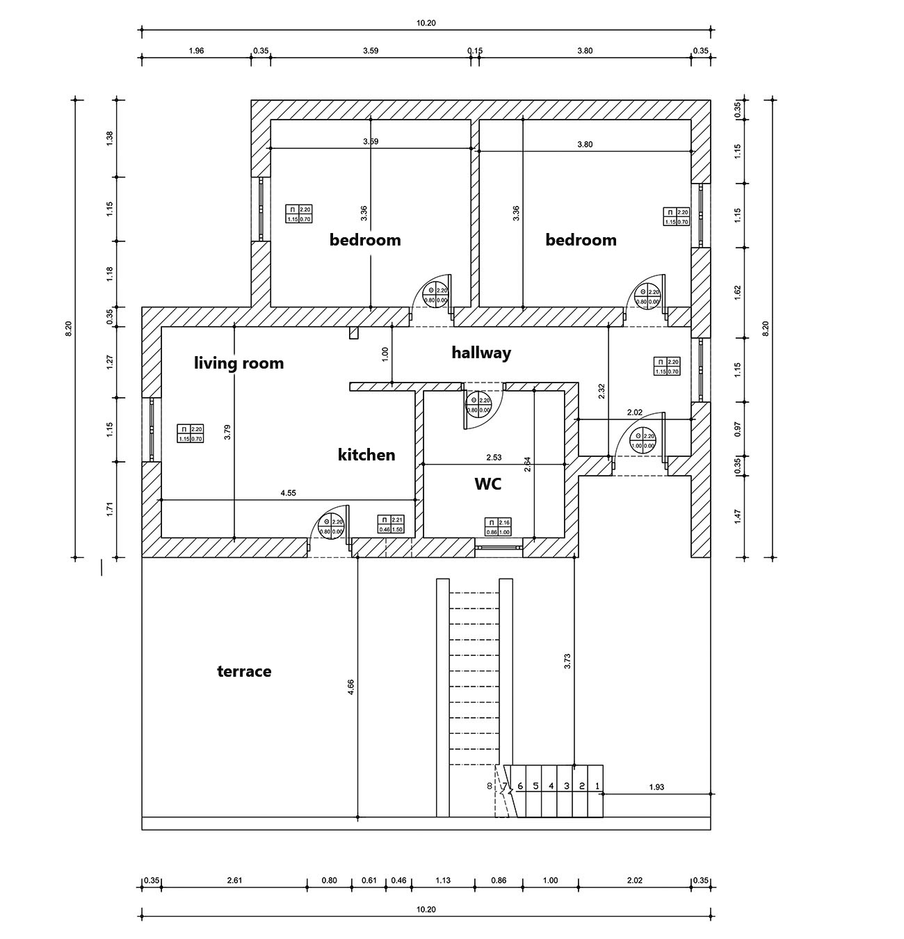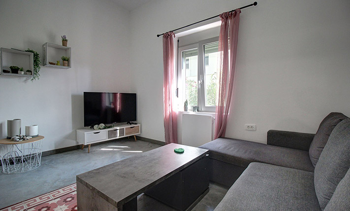 The plot of the property is square with frontage to the north while the building is located on the western edge and therefore has a good eastern orientation. The building is divided into two apartments with a ground floor of 73 m², an upper floor of 83 m² as well as an additional basement space of 24 m². Each apartment is completely independent while they share a courtyard, which is covered and can be used as a parking space. It is currently used as a courtyard by the lower apartment. At its back, some steps follow the slope of the natural ground so that a little lower at the back of the building a small garden and a courtyard have been landscaped.