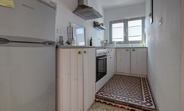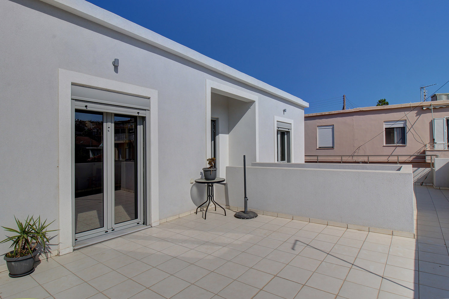 The apartments were renovated in 2020, in order to be fully functional and modern. The building was rebuilt in 1975 on the site of an older building and many of the original tiles were reused, creating an interesting final result. Also, during the renovation upstairs, the old terrazzo floors made of small tesserae remained, which in combination with the large openings on three sides have preserved the grandeur of the urban residences of the 70s. Each apartment has comfortable spaces and includes two bedrooms and a large bathroom. There are air conditioners upstairs while there is a solar panel for each apartment. A large part of the existing furniture will remain and is included in the sale price along with the electrical appliances.
