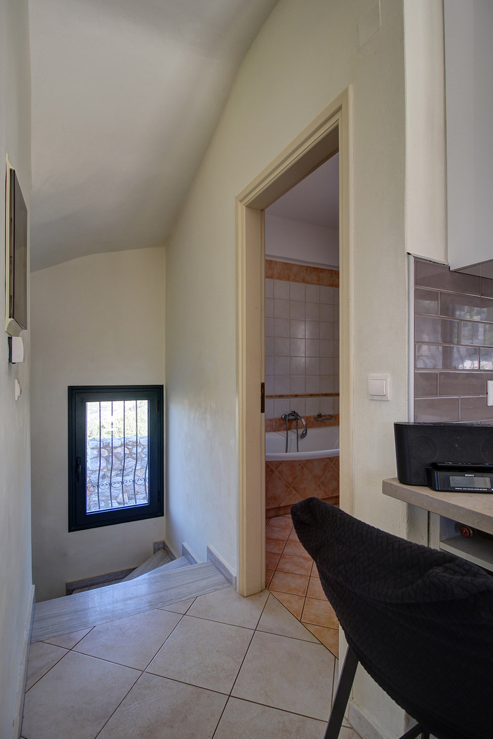 The plot is enclosed with a high wall, making it ideal if you have pets that need to be contained. Access is via an electric garage gate, leading to a large parking area that can accommodate multiple vehicles. Much of the natural rocky terrain has been left untouched, and a young olive grove has also been planted. The pool is at the rear of the property, surrounded by a large sunbathing area, with a shaded section under a pergola, perfect for coffee or meals. Around the villa, most of the outdoor space is paved for easy maintenance, while there is still room to add a beautiful themed garden if desired. At the lowest level of the plot are two large storage rooms suitable for garden tools or for storing outdoor furniture during winter.