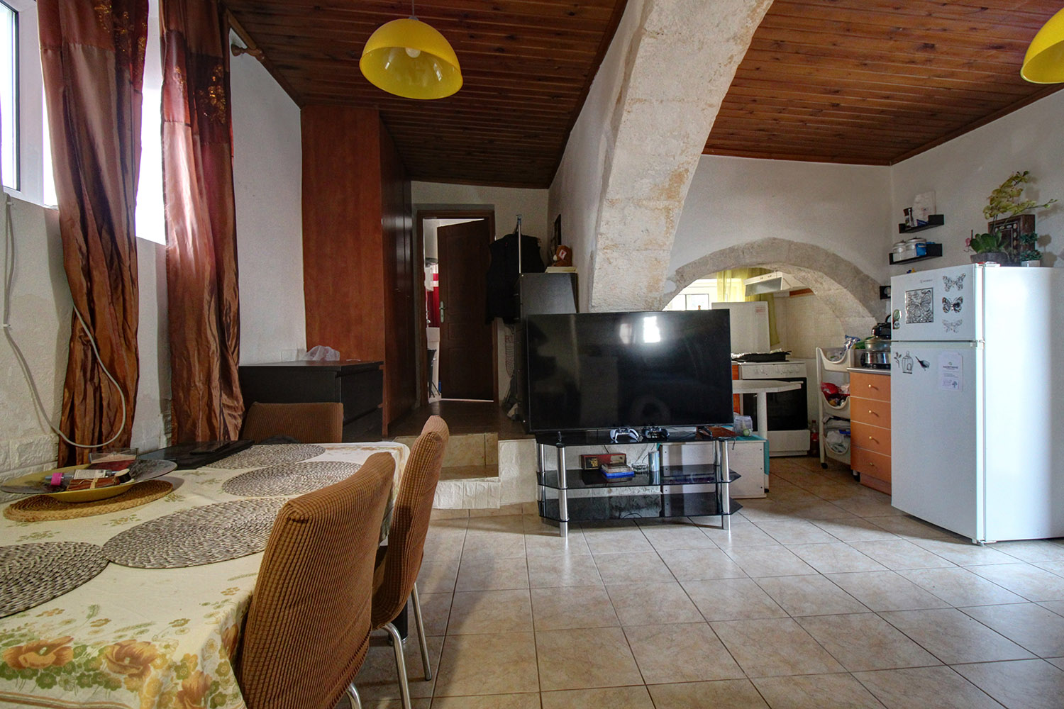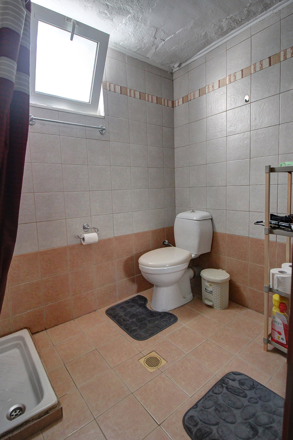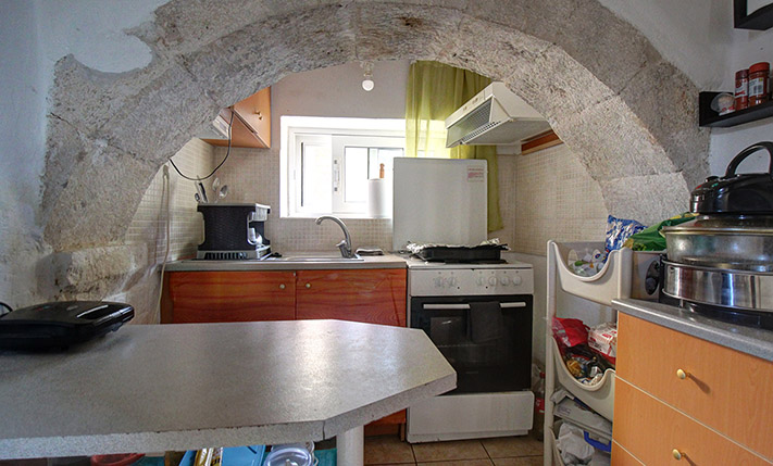 The building is oriented towards its rear side and faces west to an internal courtyard. The frontage of the property, to the east, is adjacent to a quiet village square and there are accesses to the courtyard to the left and right of the building. The interior of the building closely follows the architectural style of local farmhouses. The entrance opens onto a central space with a large arch in the center while at the two ends and in four sections are all the spaces, which include living space, kitchen, sleeping area and bathroom. Apart from the bathroom, the entire rest of the building is a large open-plan space with a high ceiling. The plot has remaining buildable area, which allows you to extend the house and if you choose to add an upper floor you will have beautiful views of the sea.