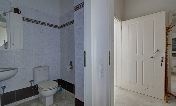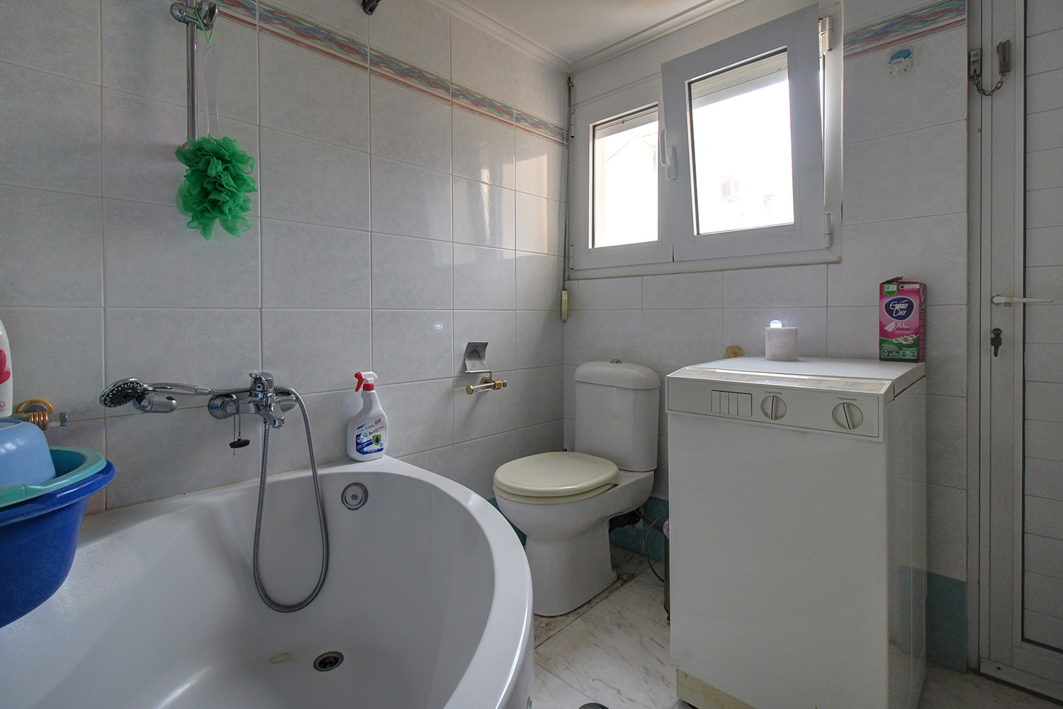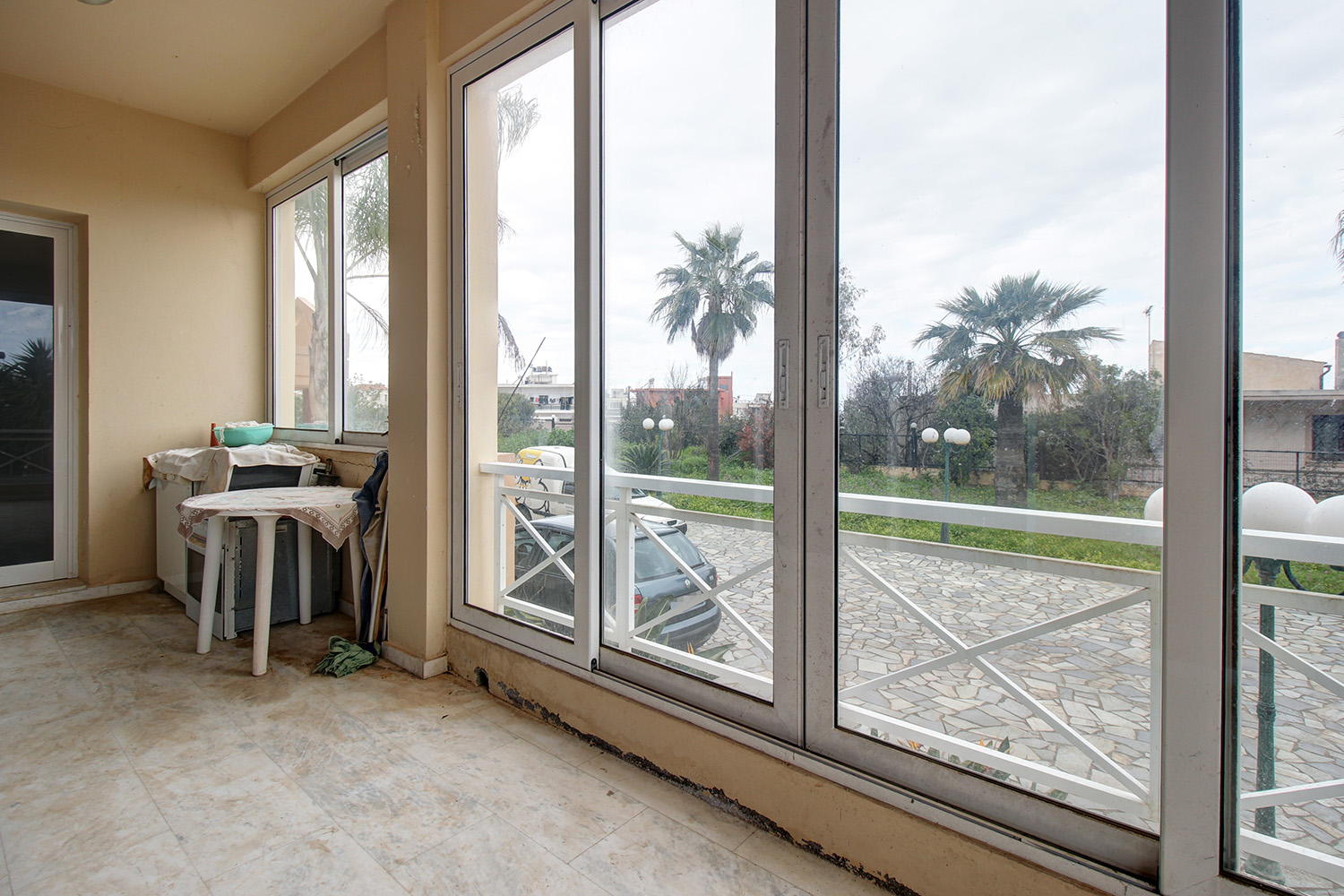 The plot of the property is fenced with a high wall and a metal gate. In the frontage of the building there is a large yard, where you can park many vehicles while a large space with palm trees remains, where you can add a beautiful themed garden, lawn or even a swimming pool. In the basement, in addition to the apartment, there is a large garage of 75 m² with double doors and space in order to configure independent storage spaces. The boiler room is additional 9 m². The building has central heating that is independent for each per apartment. Finally, at the exit of the staircase to the rooftop terrace there is an additional space of 15 m², which can become a laundry room or one more storage area. Throughout the building there are aluminum windows and doors that have been installed after the construction and are in good condition.