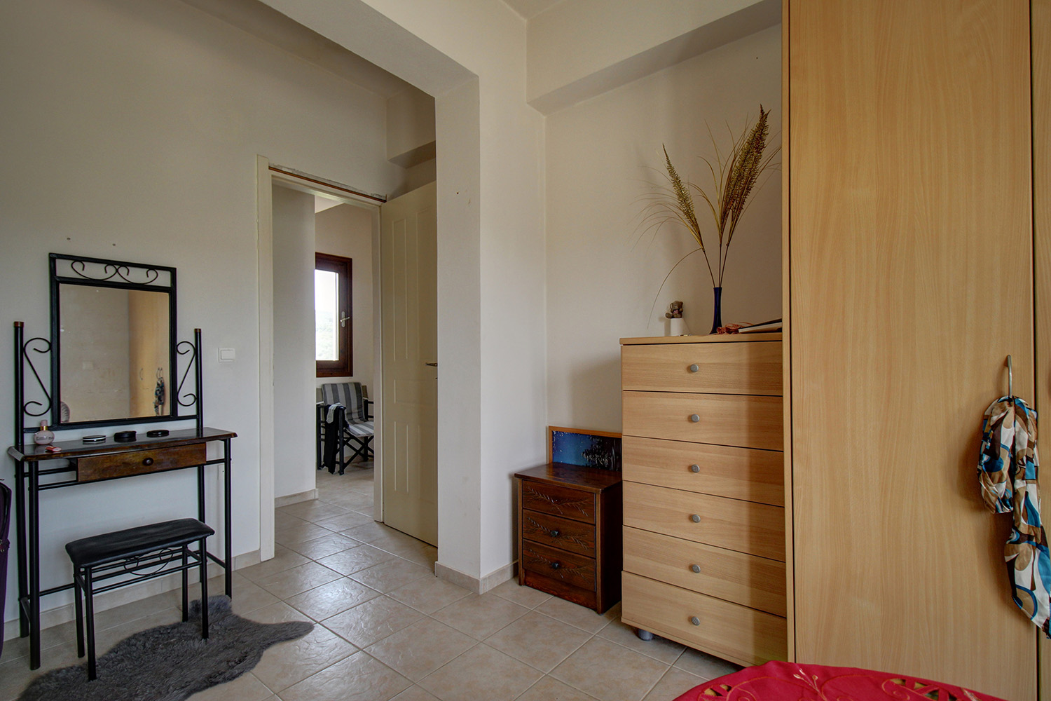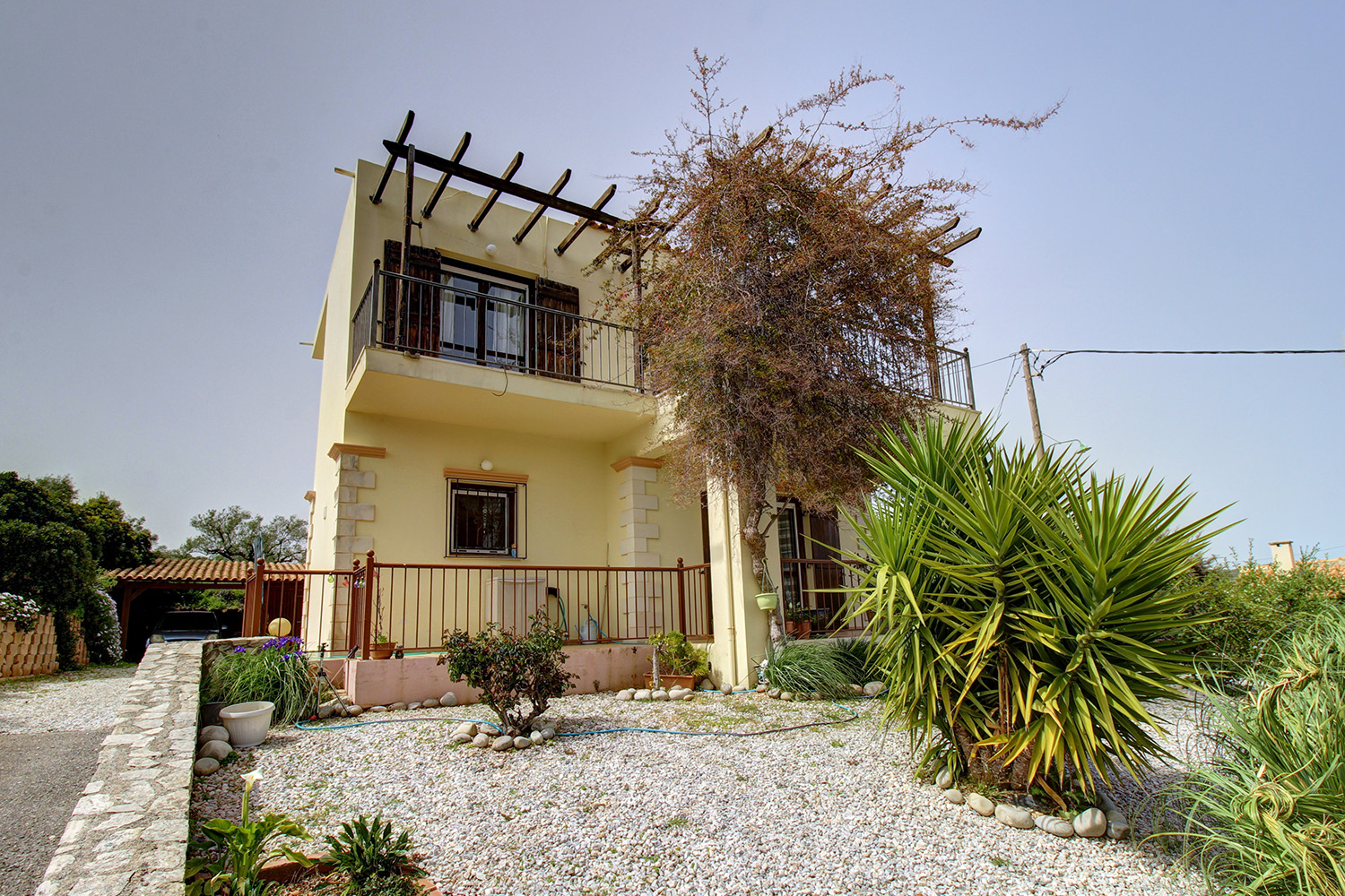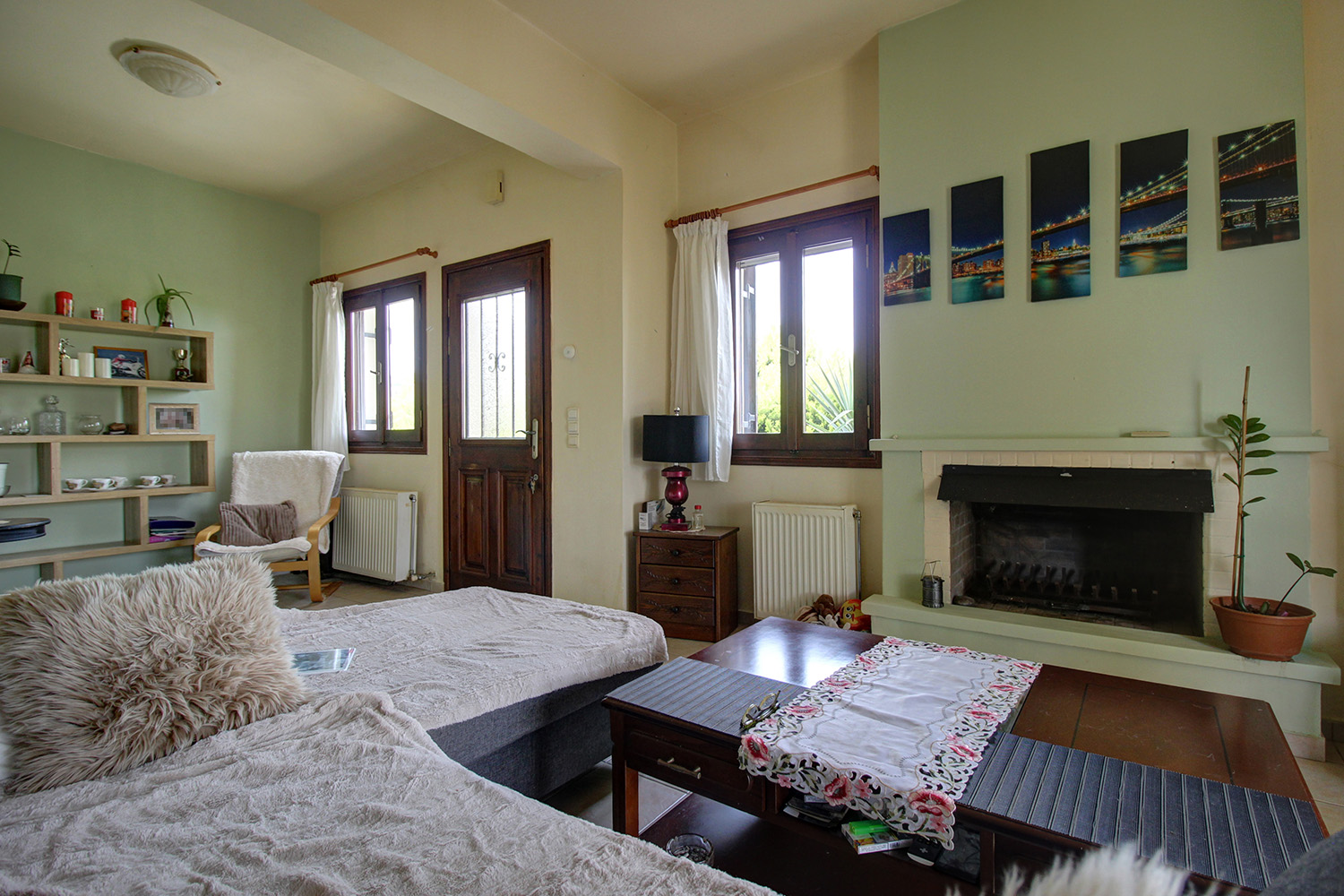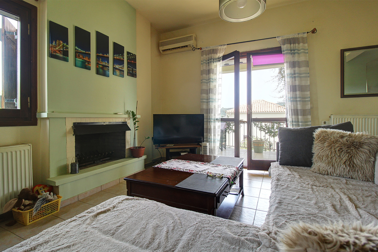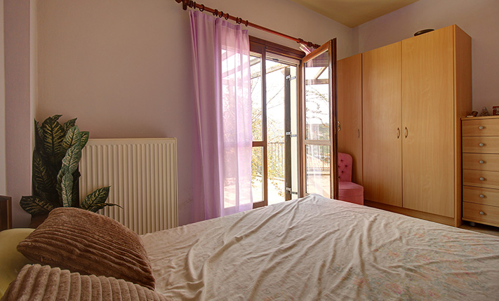 The plot is good-sized and includes a flower garden at the front of the house as well as a yard with a large parking space at the back. The entire back side can be landscaped in order to have complete privacy and to become an integral part of the daily life of the house. The main entrance opens onto an open-plan living, dining and kitchen space. The living space has a fireplace and the kitchen has many cupboards and a spacious counter. A corner in the open-plan space has not been used and can become an additional living space, office or even a small bedroom. On the ground floor there are also a small storage space as well as a bathroom with shower. An internal staircase leads to the first floor, where there are two comfortable bedrooms with built-in wardrobes and exits to a balcony with impressive views. On the floor we also find two bathrooms, one with a bathtub and one with a shower. The property has central heating with radiators and oil boiler, air conditioners, solar panel and the fireplace of the living space.