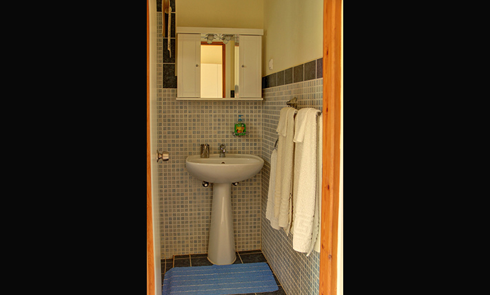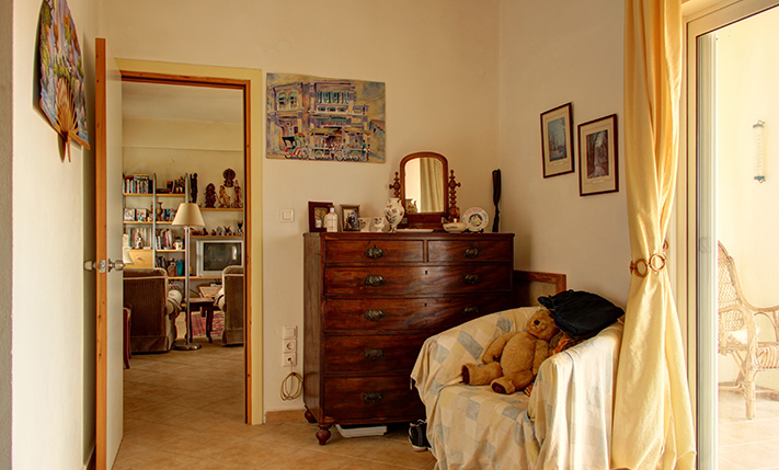 The house is divided into two independent floors, the basement and the ground floor of 83 m² each. Due to the inclination of the land, most of the lower floor is above the soil level, while the ground floor gives the impression that we are on the first floor. From the main entrance of the upper floor we find firstly, the kitchen that has many cabinets, an exit to a large terrace and a utility storage room with shelves. Next to the kitchen is a spacious and bright living room. On this floor, there are also an office area and a bedroom with a bathroom. On the west side of the house, there is a large terrace with spectacular views of the mountains and the sea, which has a barbecue and a staircase that leads downstairs and to the building with the apartments.