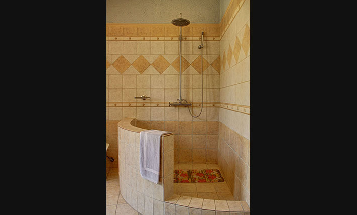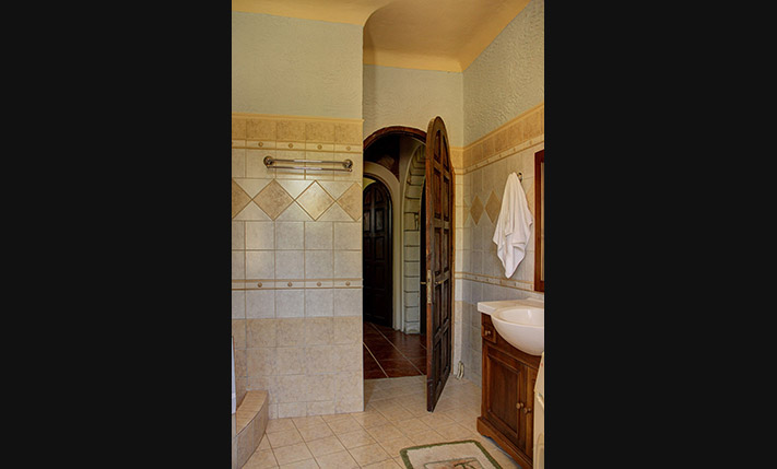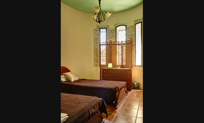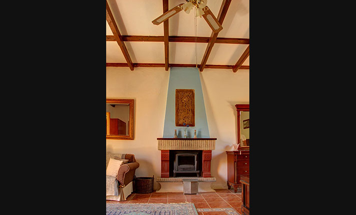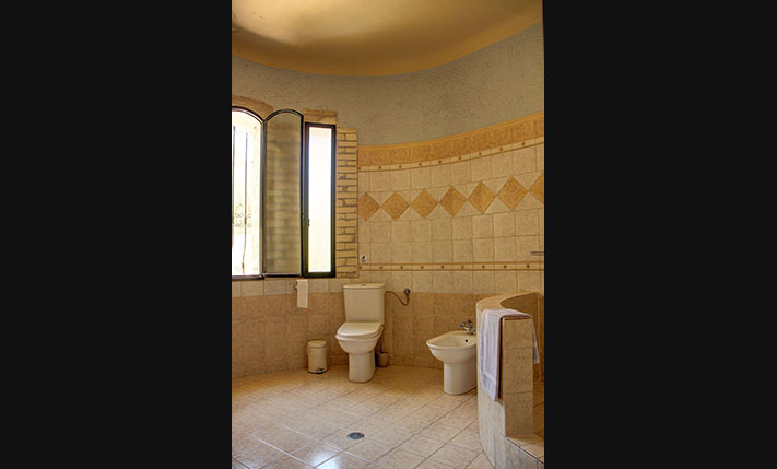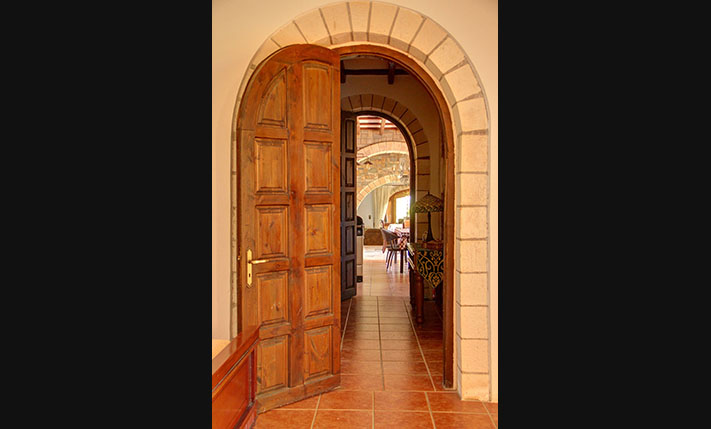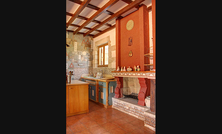A few stairs lead to a small veranda, where there is the main entrance of the home. Inside, we find a large open-plan area that is divided by massive stone arches. From the entrance we go to a large hall that is currently configured and used as a dining room. From here there is direct access to the garden, the kitchen and the living room. The impressively large and bright living room is at a lower level and has an office as well as one of the total three fireplaces of the house. Another fireplace is in the traditional-style kitchen, which has several rustic elements and all necessary electrical appliances. Next to the kitchen is a hall with access to the two bedrooms and a large round bathroom with shower. The main bedroom has cherry wood furniture, its own fireplace and two exits to verandas on the west and the east side of the building.
