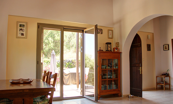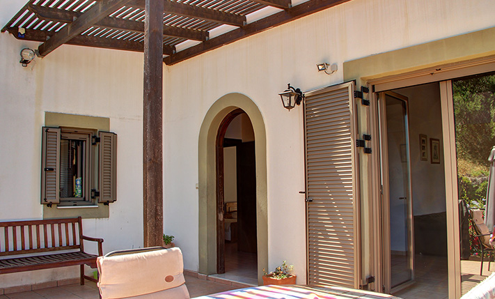 The smaller of the two residences is also fenced with a low wall and a gate. It is ideal as a guest house or you can live here and rent the villa for tourist purposes. In any case it is a completely independent house with a beautiful garden and views. Before the main entrance there is an elevated veranda with a pergola, on which lead a few steps. Inside, there is an open-plan living and kitchen area. The bedrooms, which are spacious and have tall wooden ceilings and fitted wardrobes, are on the back and southeast side of the building. The property has a bathroom with shower and in one of the bedrooms there is an en-suite bathroom with a bathtub. There are air conditioners in all main rooms and aluminum windows with tilt system, screens and double glazing. In the living room there is also a chimney in case you want to install a fireplace or a stove.